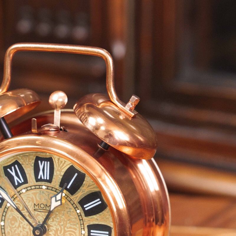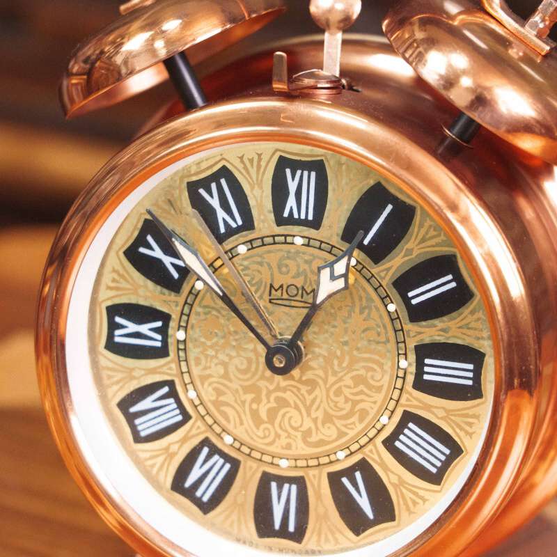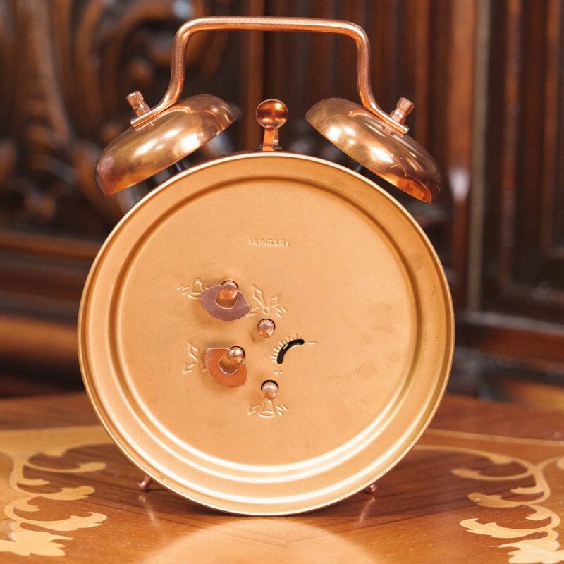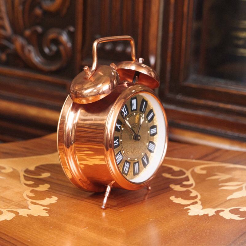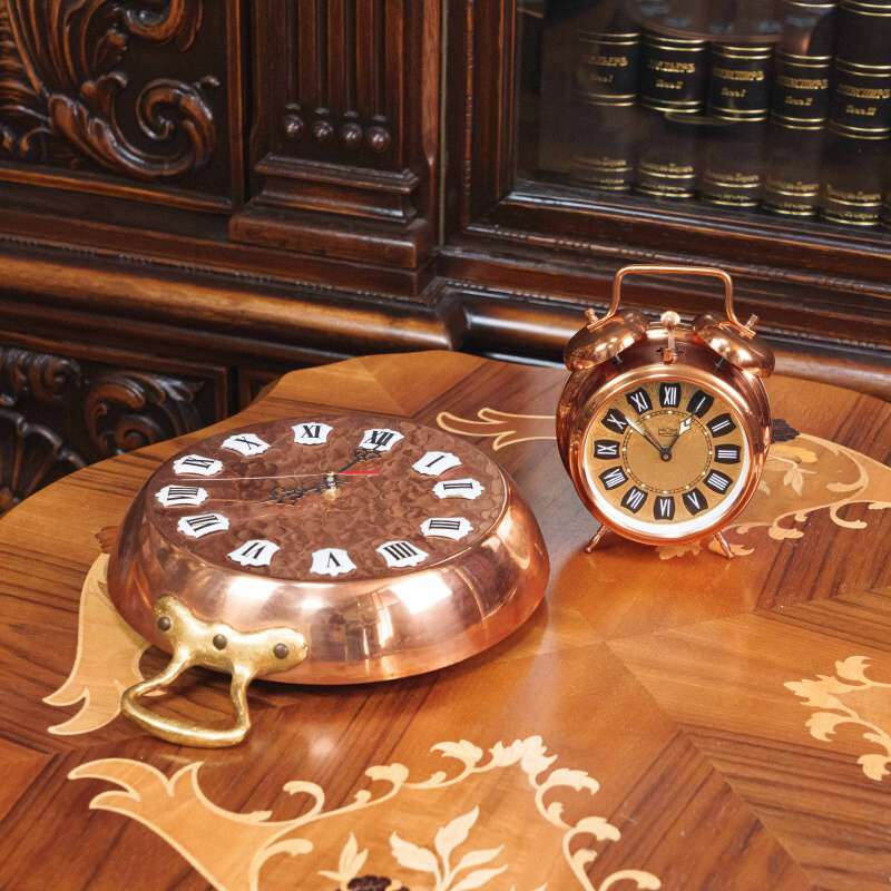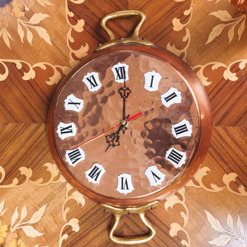 Винтажные настенные часы, выполненные в форме медной посуды (сковороды). Часы относятся к категории ретро-декора для кухни или интерьеров в стиле прованс и винтаж. Корпус сделан из чеканной меди с характерной фактурой, а циферблат выполнен римскими цифрами, нанесенные на отдельные белые вставки из эмали. Корпус дополнен латунными ручками по бокам, имитирующими кухонную утварь. Стоит кварцевый механизм, работающий от батареек.