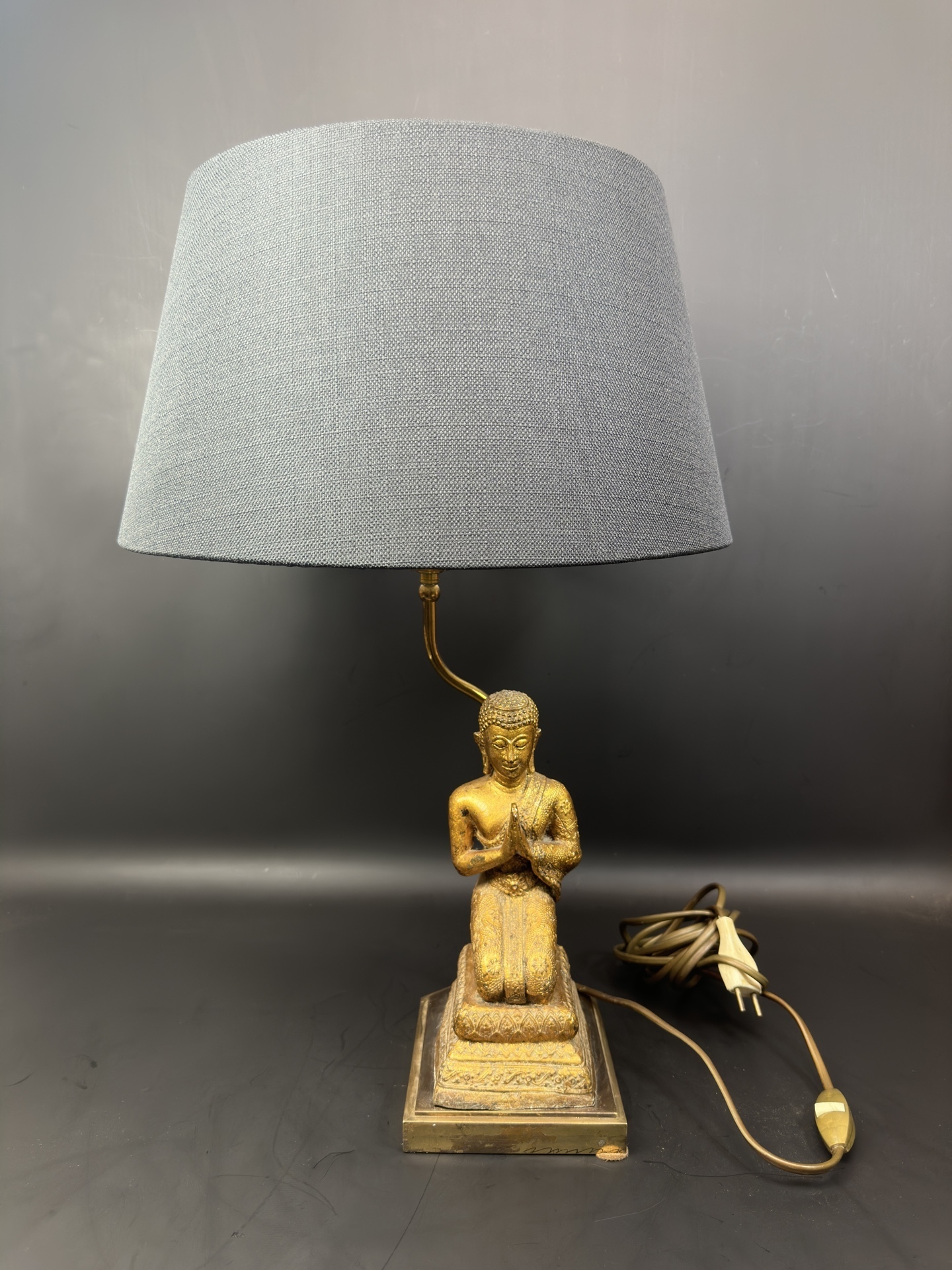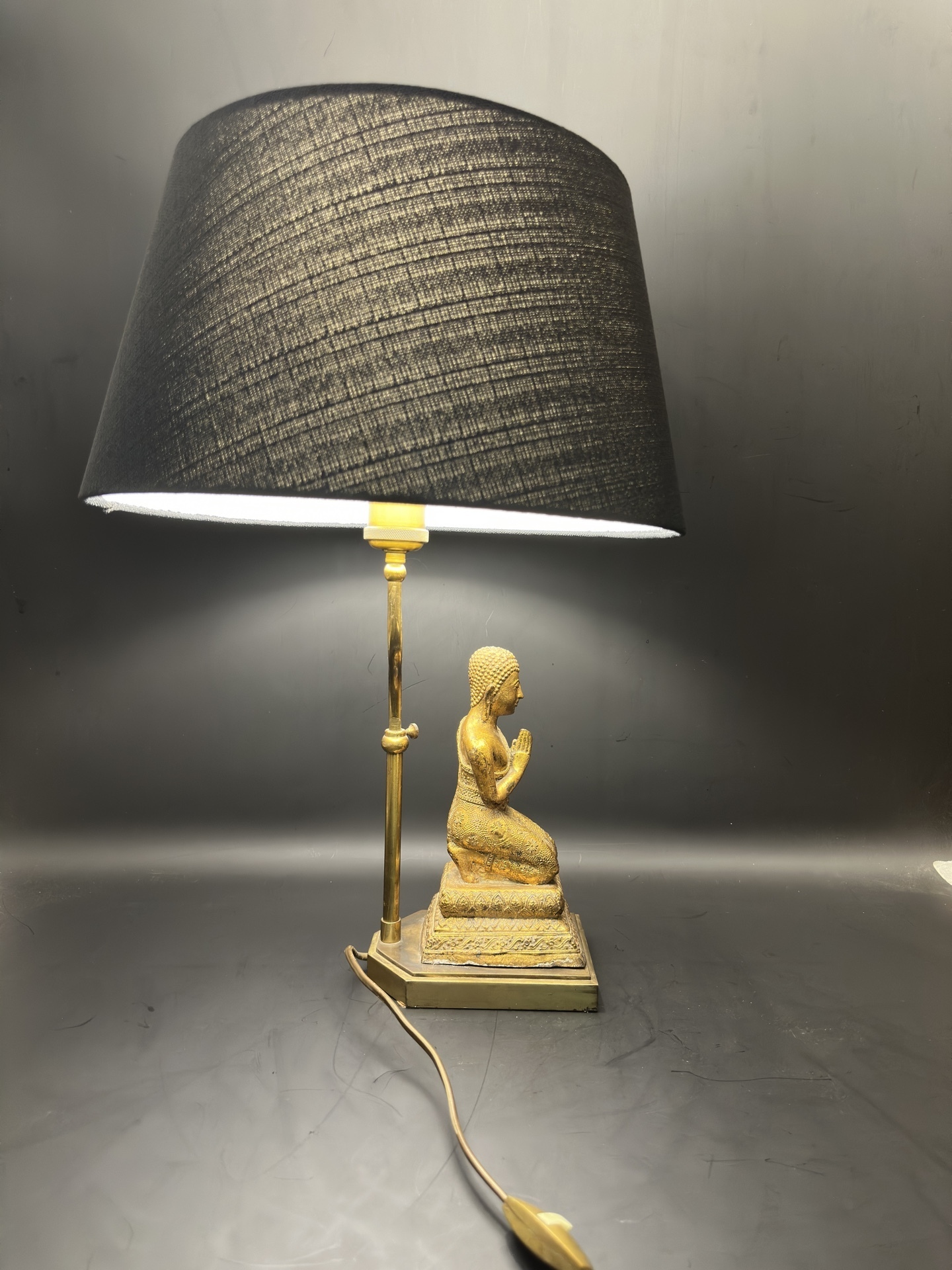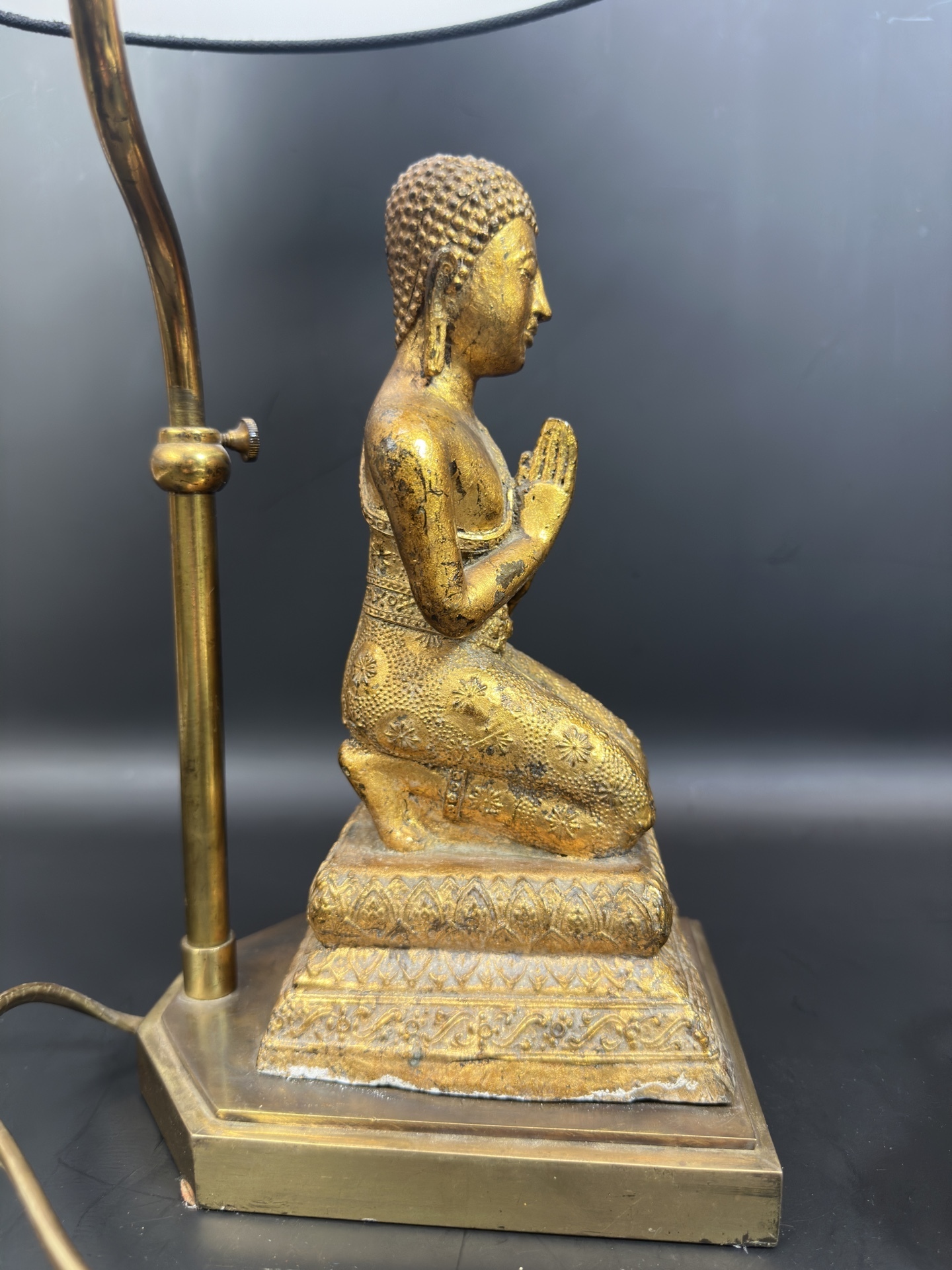 Лампа имеет основание в форме статуэтки Будды, выполненной из бронзы, изображающей Будду в позе преклонения с соединенными руками.