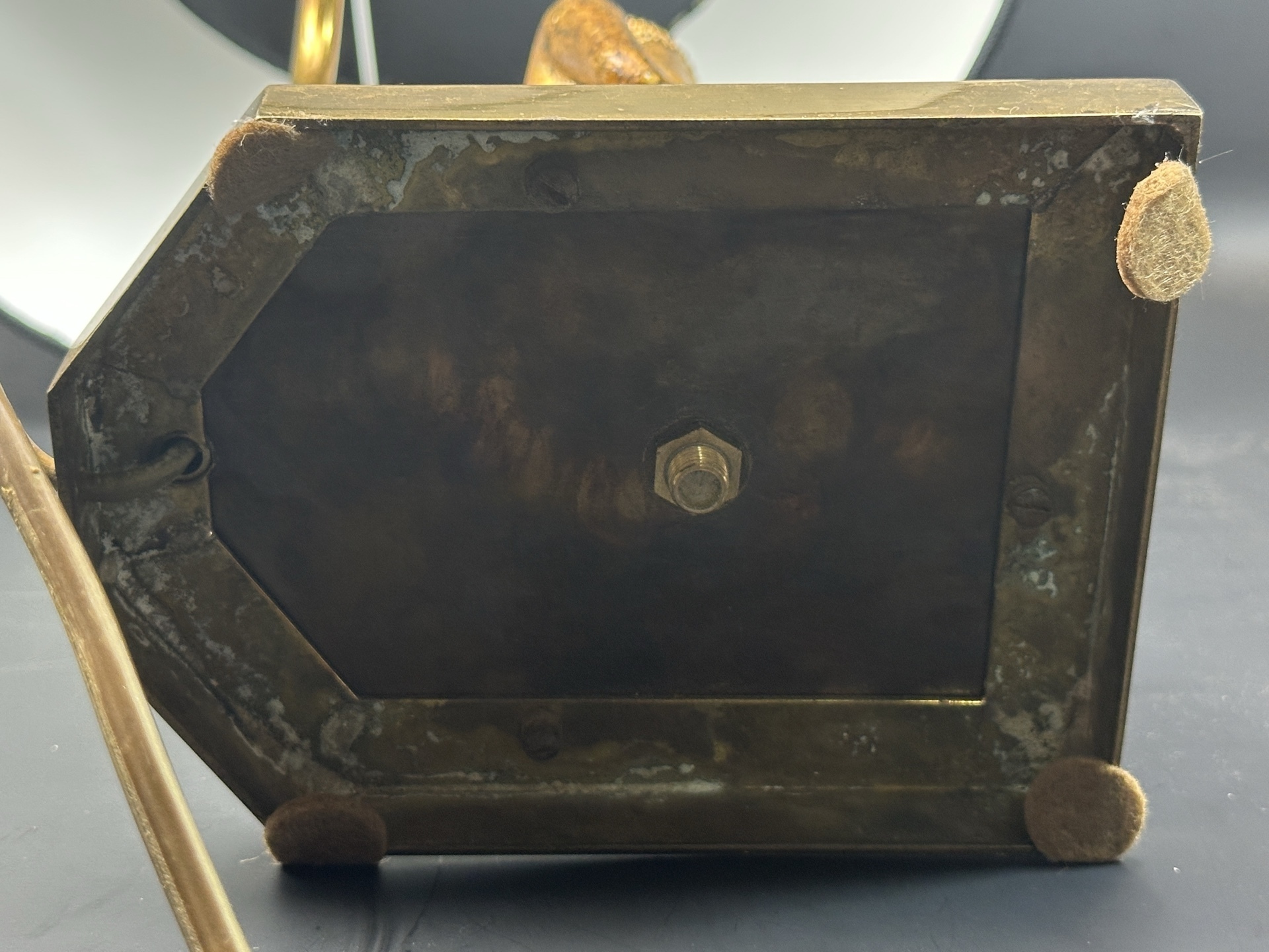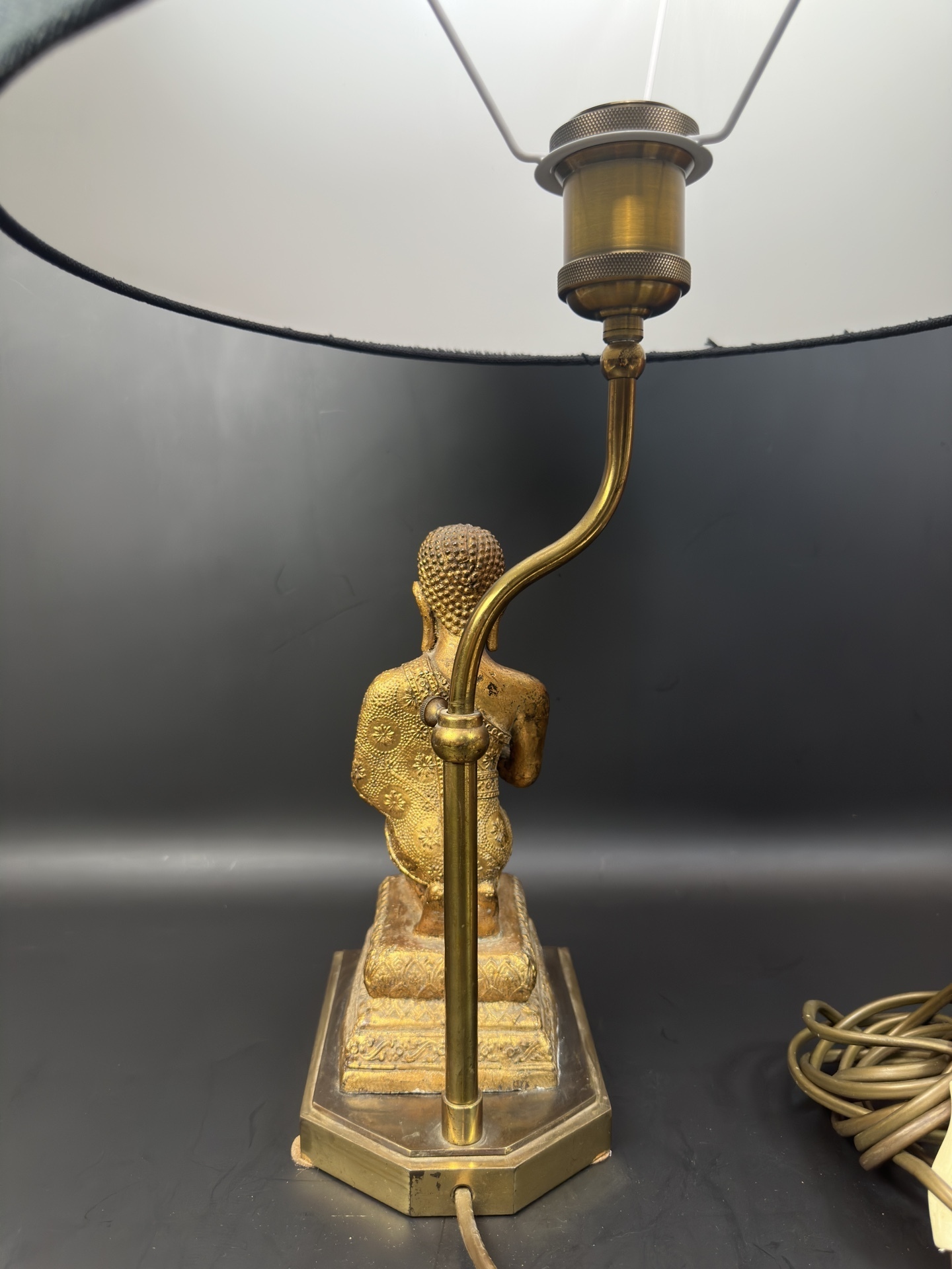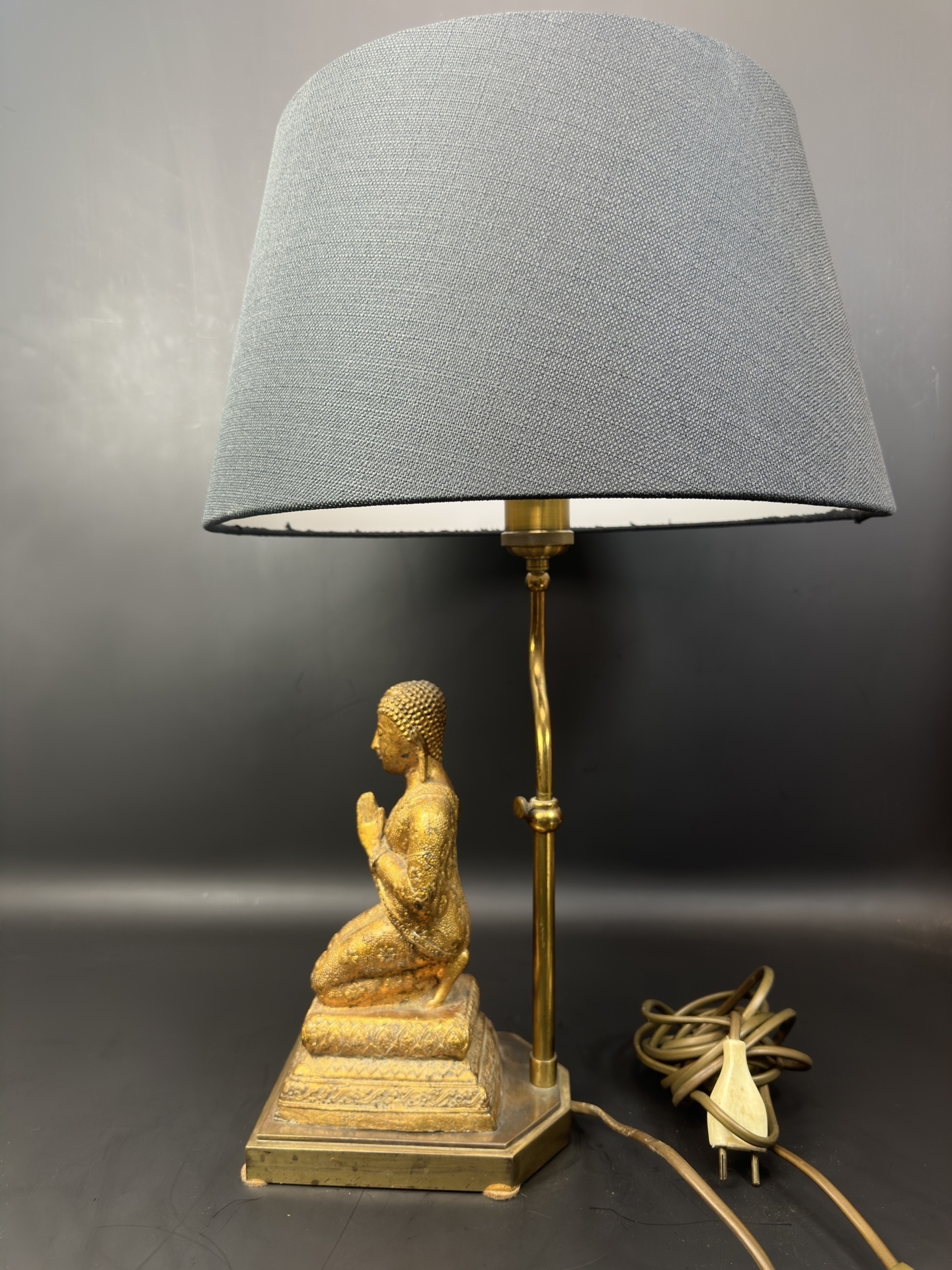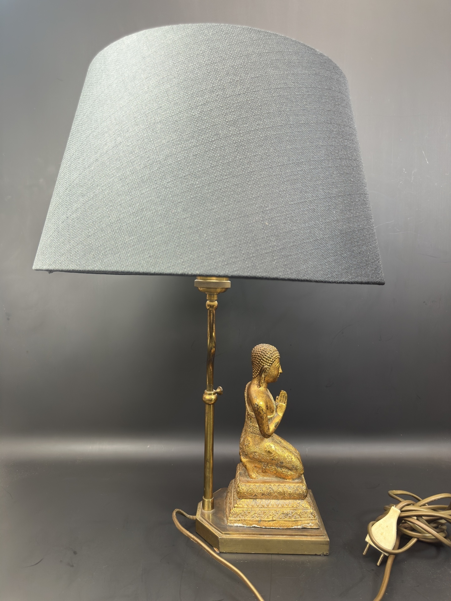 Лампа имеет основание в форме статуэтки Будды, выполненной из бронзы, изображающей Будду в позе преклонения с соединенными руками.