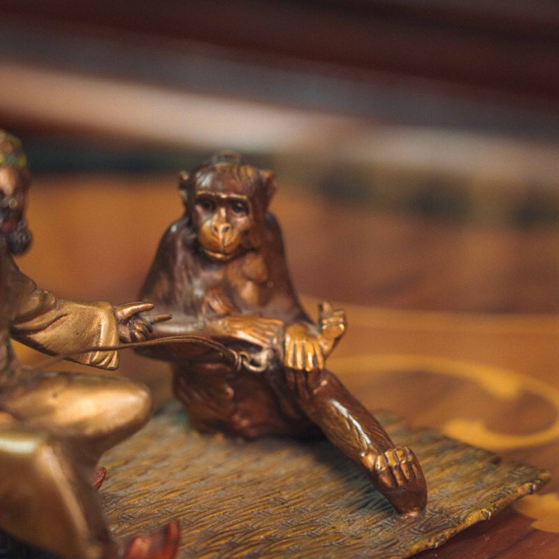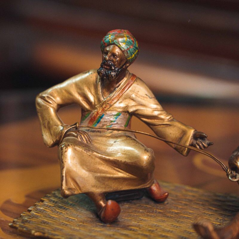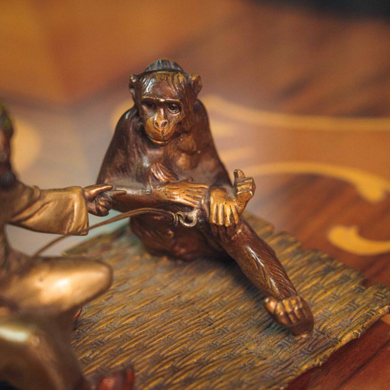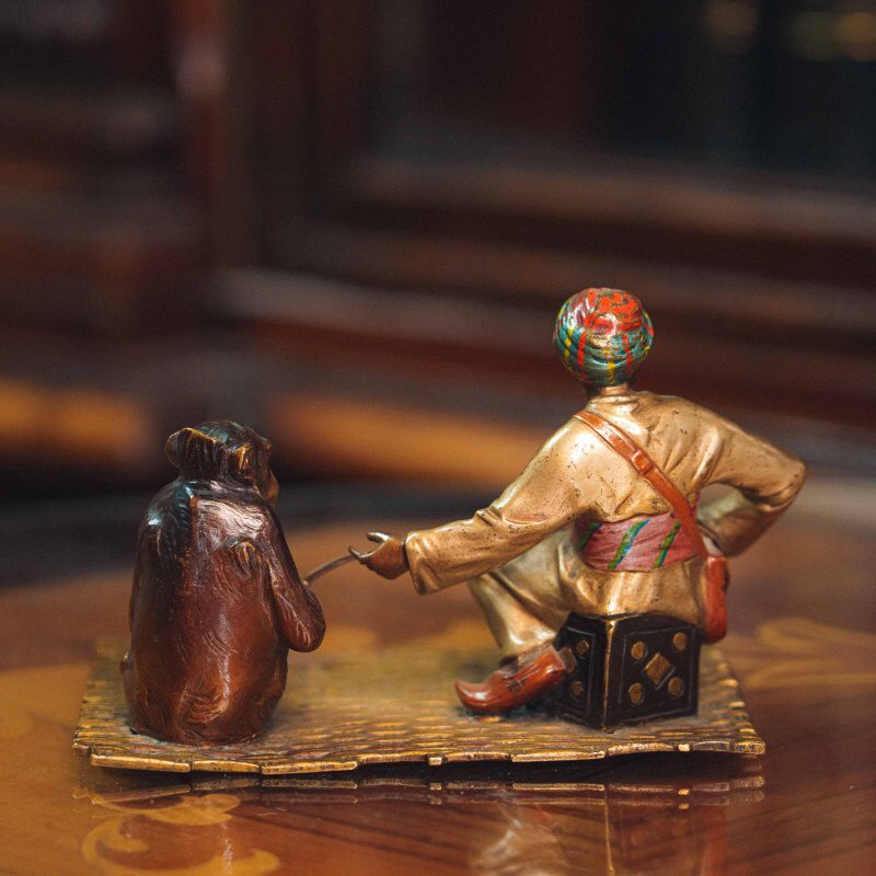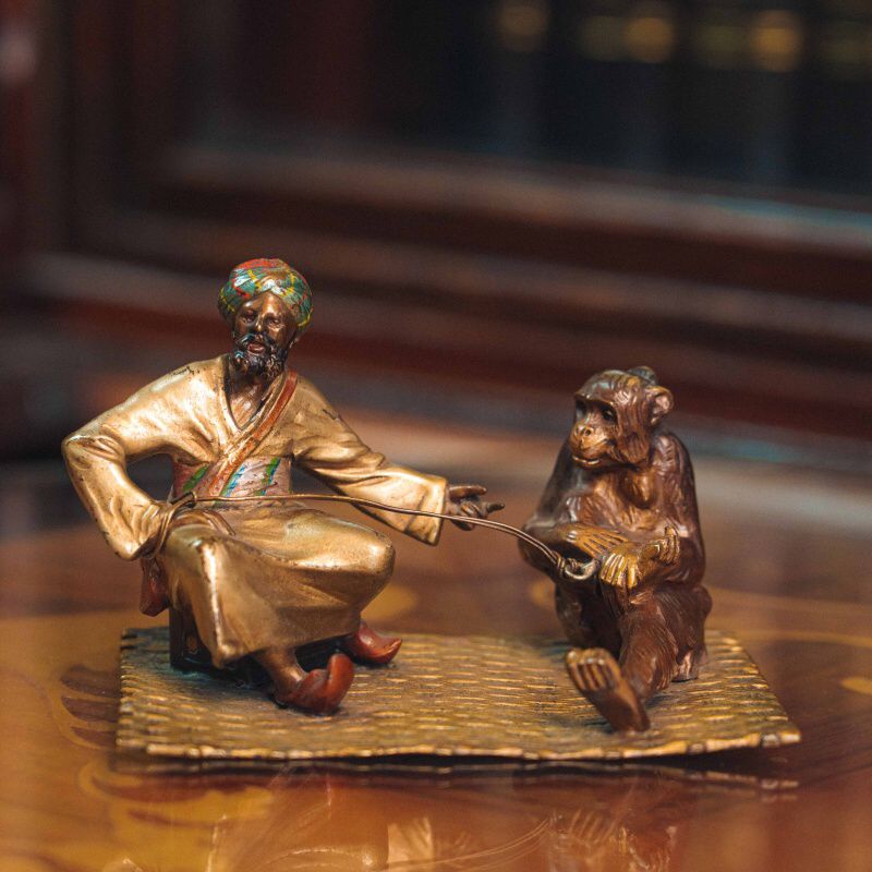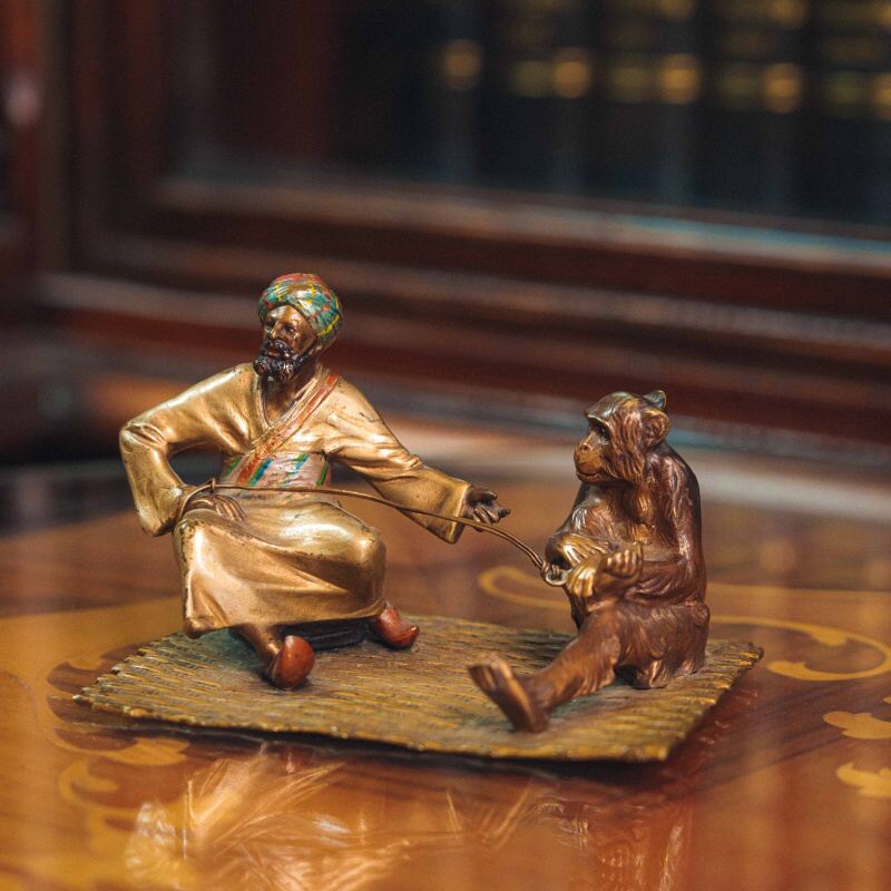 Кабинетная бронзовая композиция, изображающая сцену с участием восточного дрессировщика и обезьяны. Мужская фигура представлена в традиционном восточном одеянии с ярким тюрбаном, в непринужденной позе, сидящей на ковре.