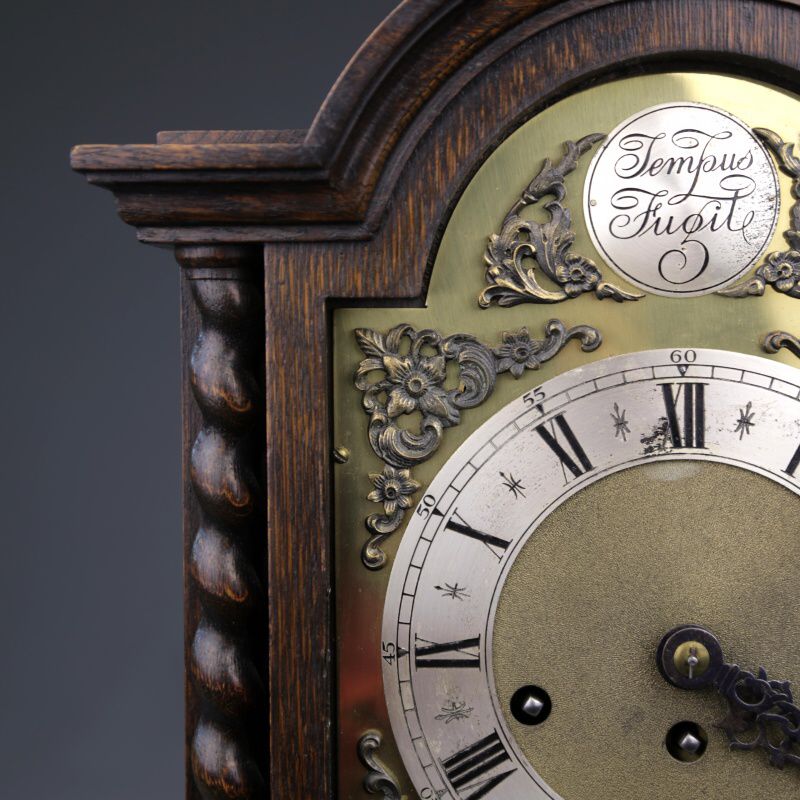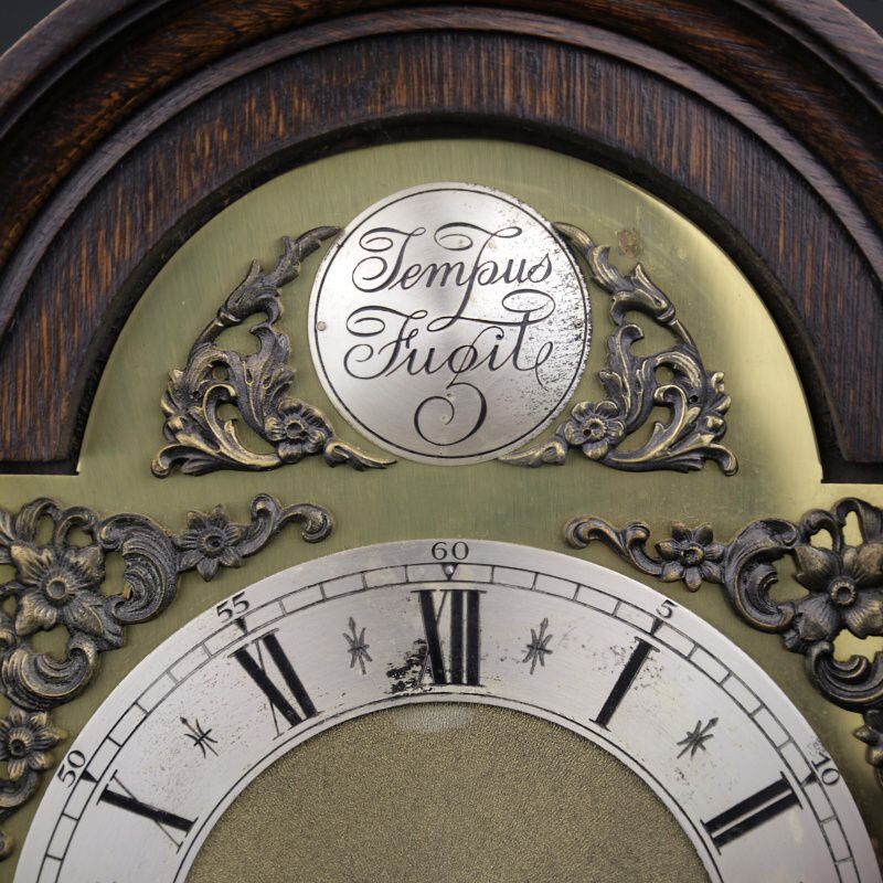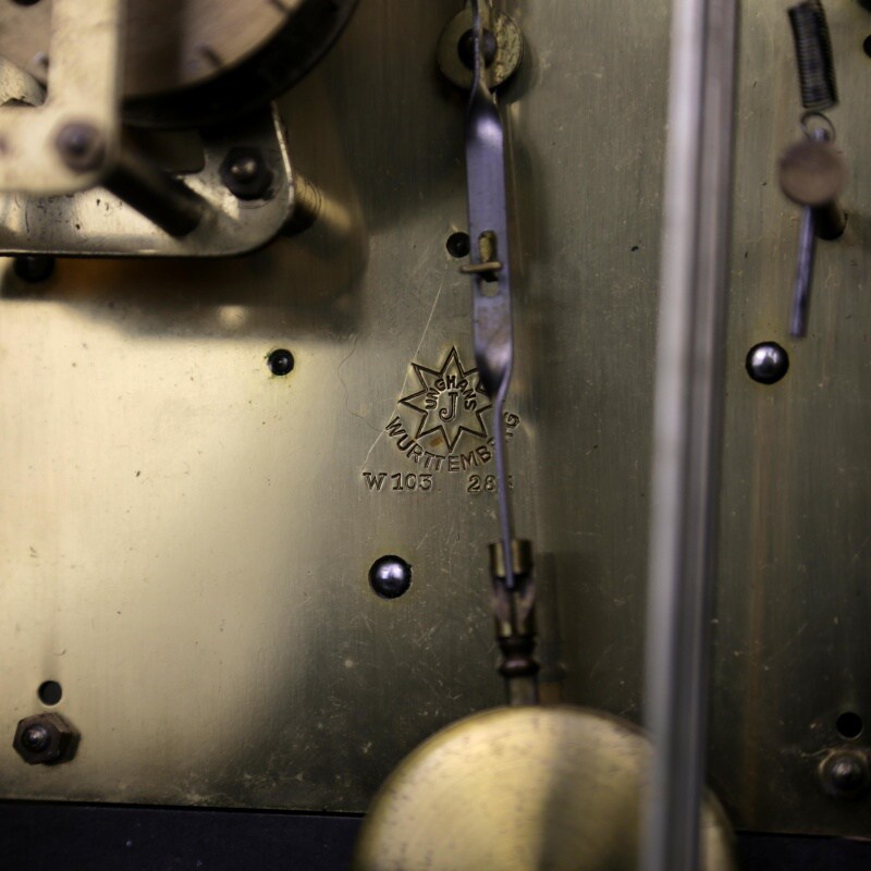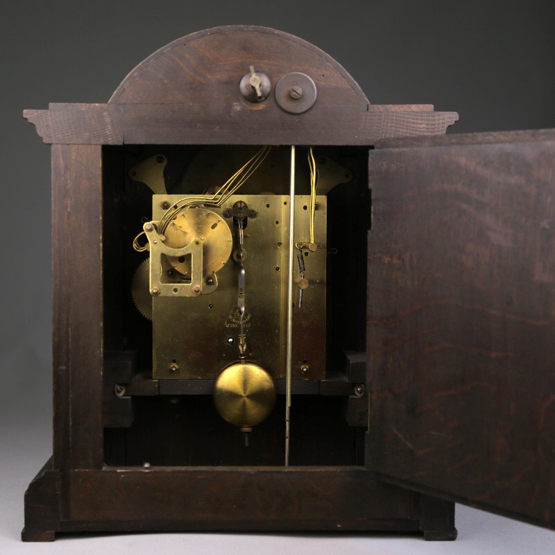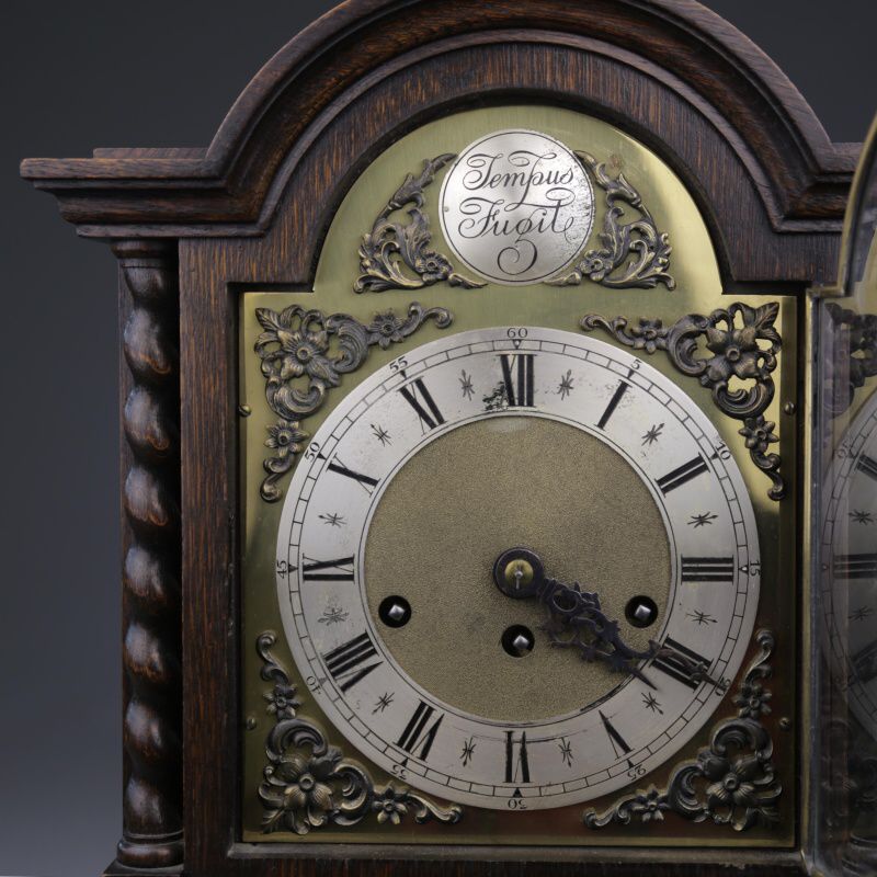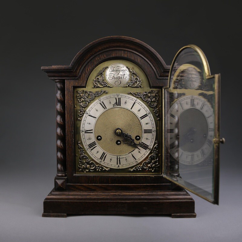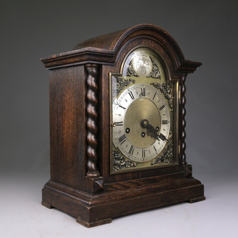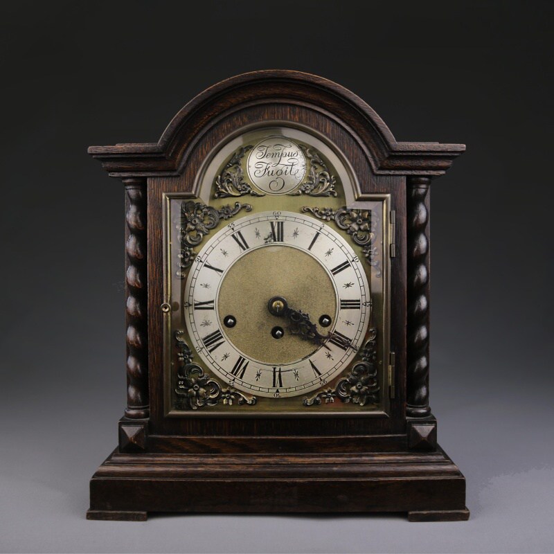 Настольные часы с механизмом часового и получасового боя. Посеребренный циферблат с римскими и арабскими цифрами великолепно сочетается со стрелками классической формы. Над циферблатом расположена накладная табличка с надписью «Tempus Fugit», что в переводе означает «Время летит». Механизм изготовлен на известной немецкой часовой мастерской Junghans в середине ХХ века.