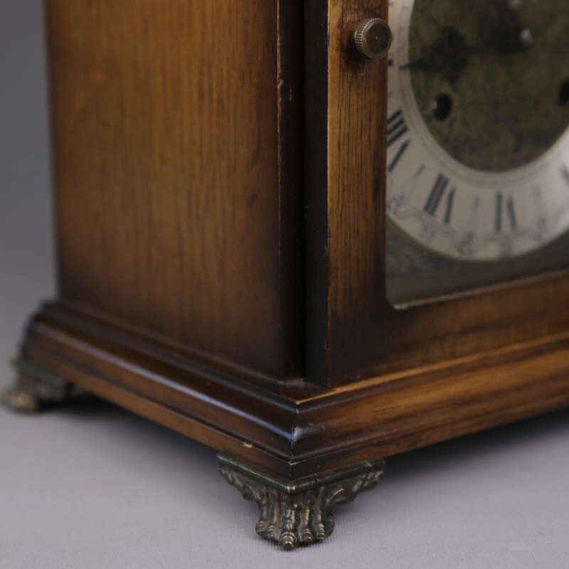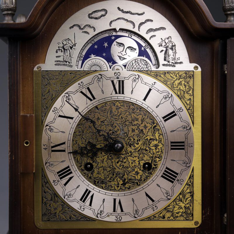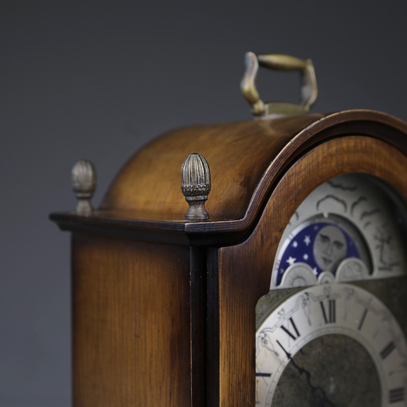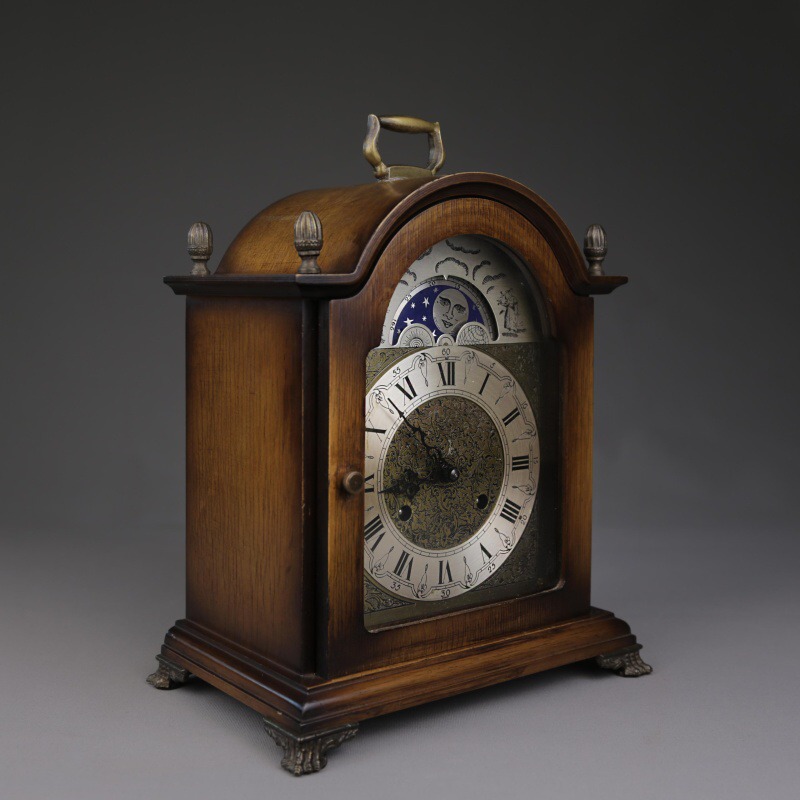 Настольные часы с механизмом часового и получасового боя. Посеребренный циферблат с римскими и арабскими цифрами великолепно сочетается со стрелками классической формы. Над циферблатом расположен лунный календарь с фазами луны. Механизм изготовлен на известной немецкой часовой мастерской Franz Hermle & Sohne в середине ХХ века.