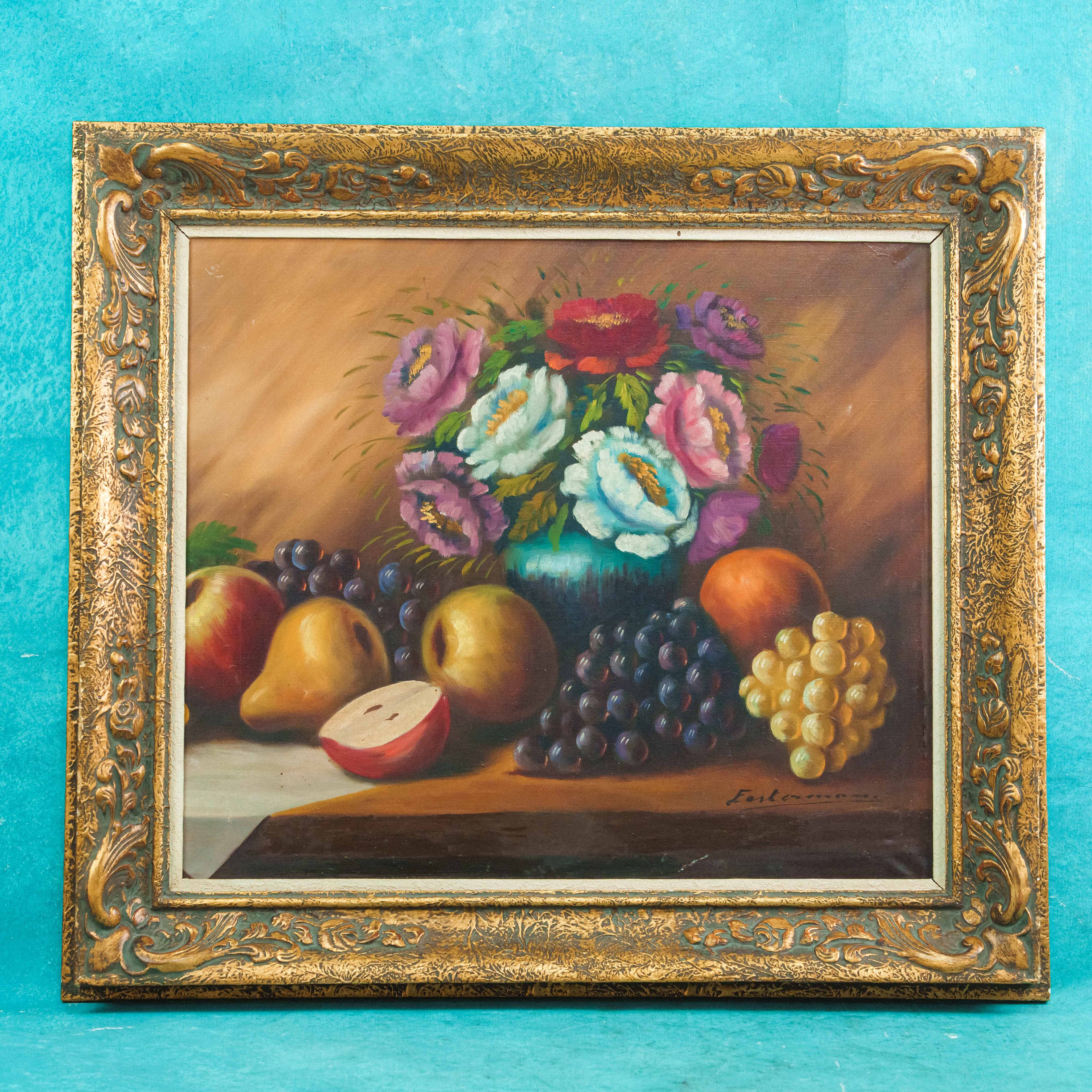 Тёплый, уютный натюрморт в традициях европейской живописной школы. Сочные гроздья винограда, спелые груши и яблоки, дополненные пышным букетом цветов, создают гармоничную и сбалансированную композицию, наполненную ощущением изобилия и спокойствия.