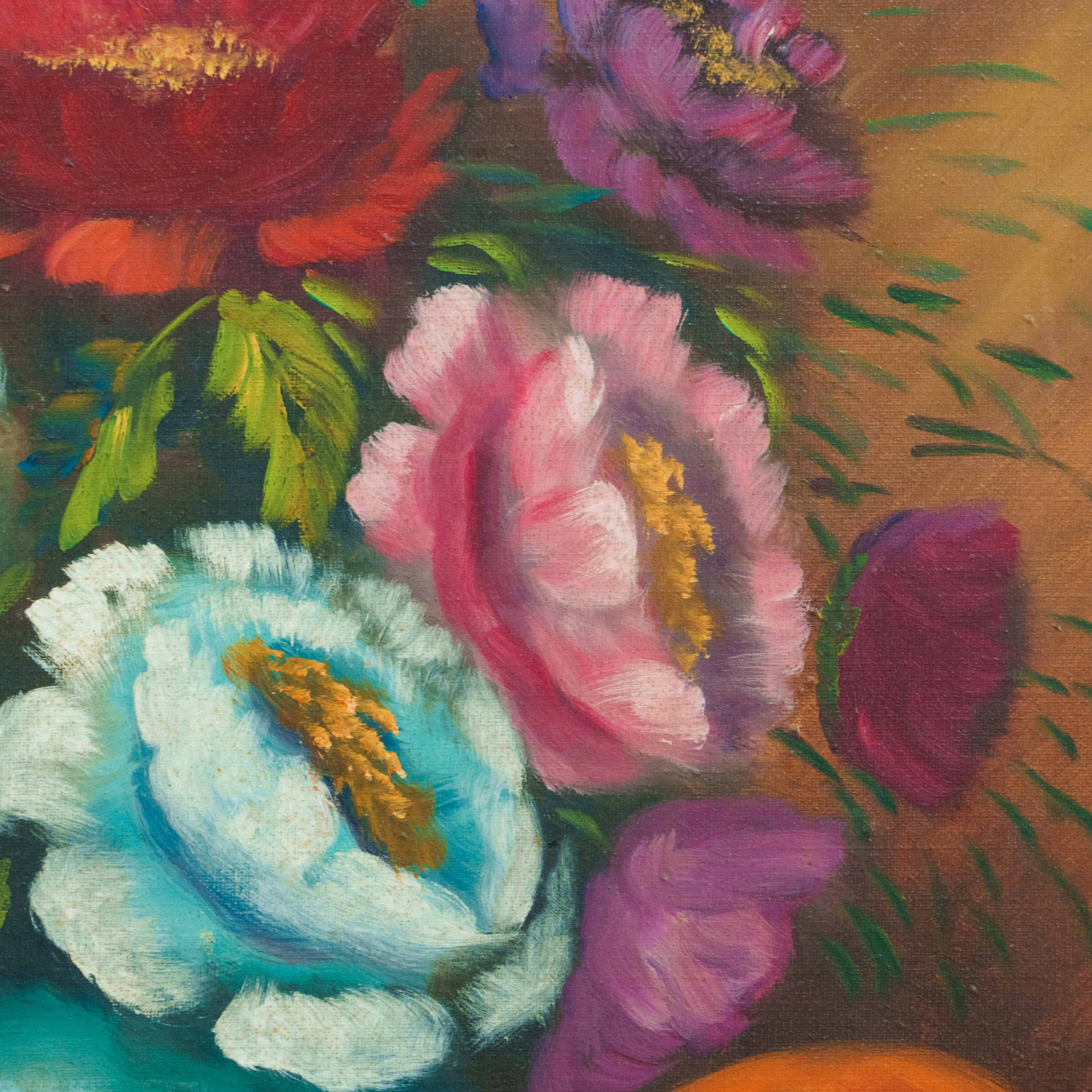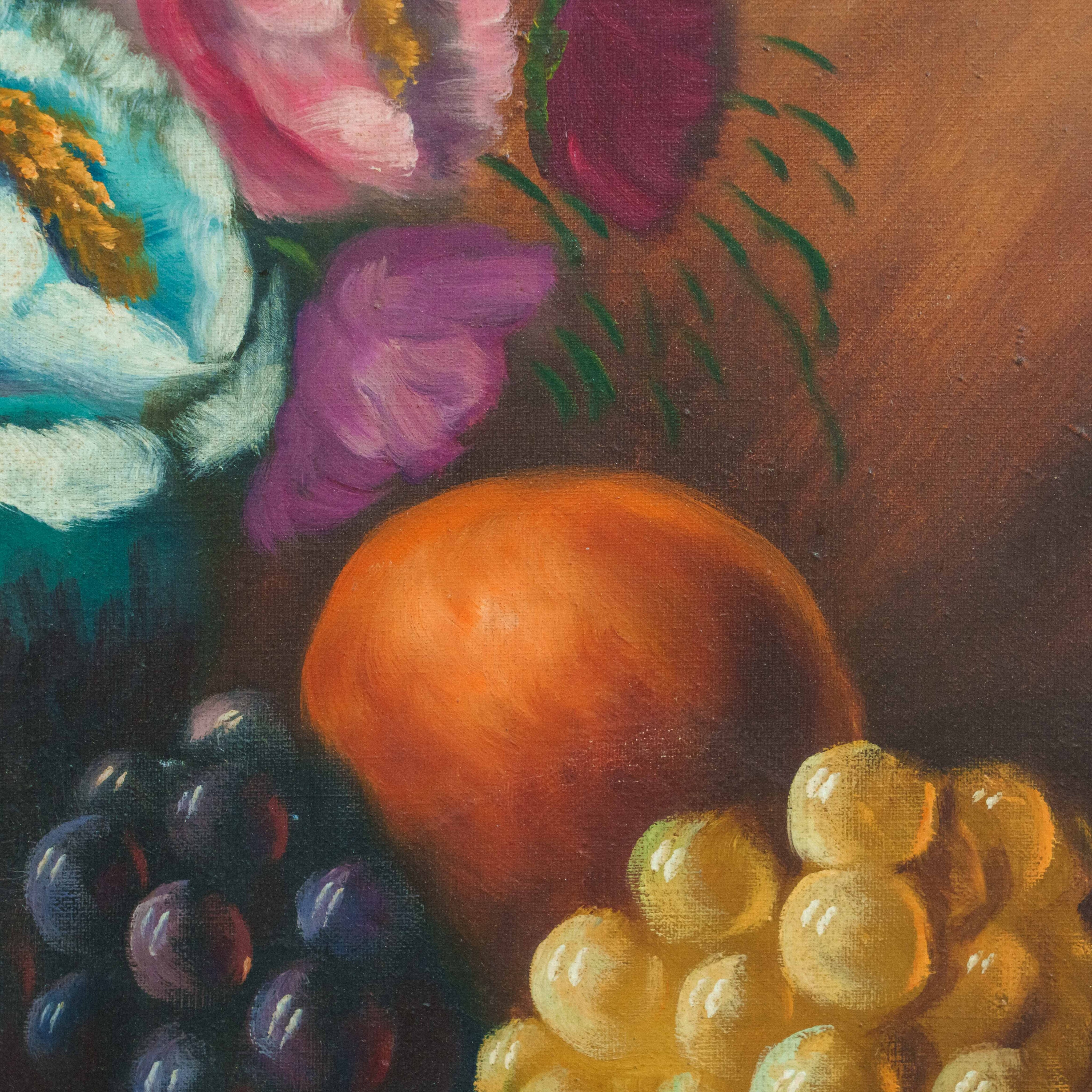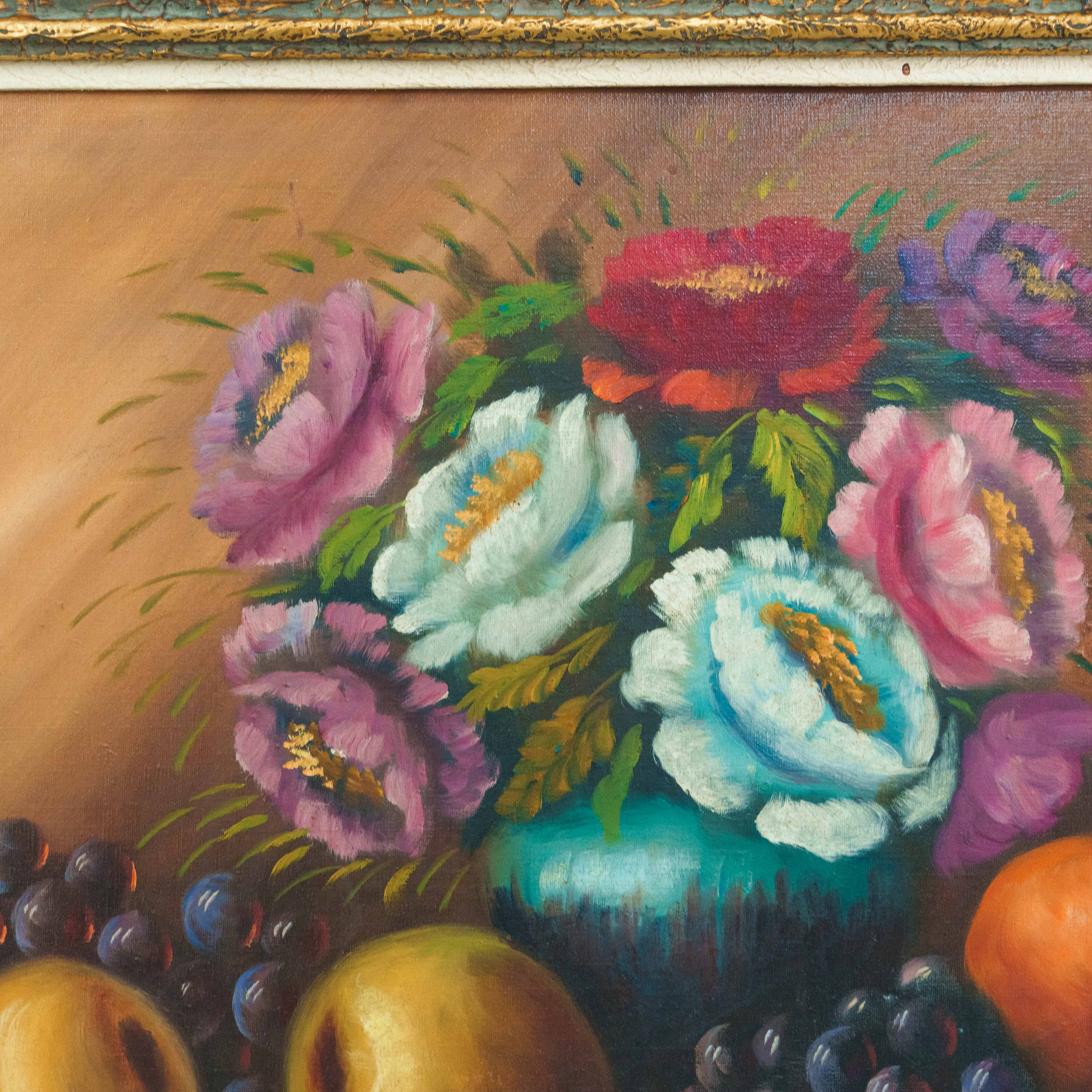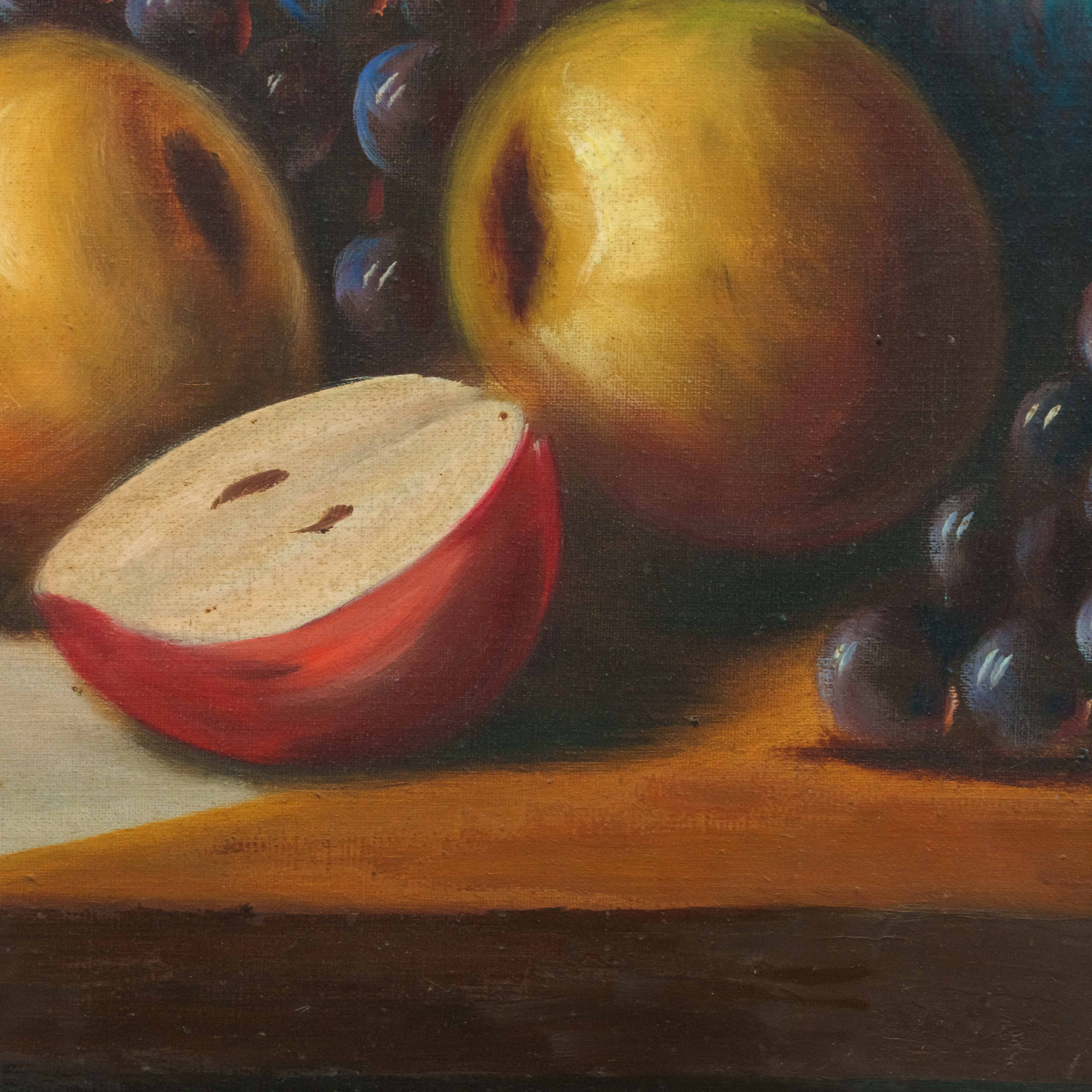 Художник мастерски передаёт фактуру плодов, игру света и мягкие цветовые переходы, благодаря чему изображение выглядит объёмным и «живым». Тёплый фон усиливает глубину пространства, а декоративная рама подчёркивает салонный, интерьерный характер работы.