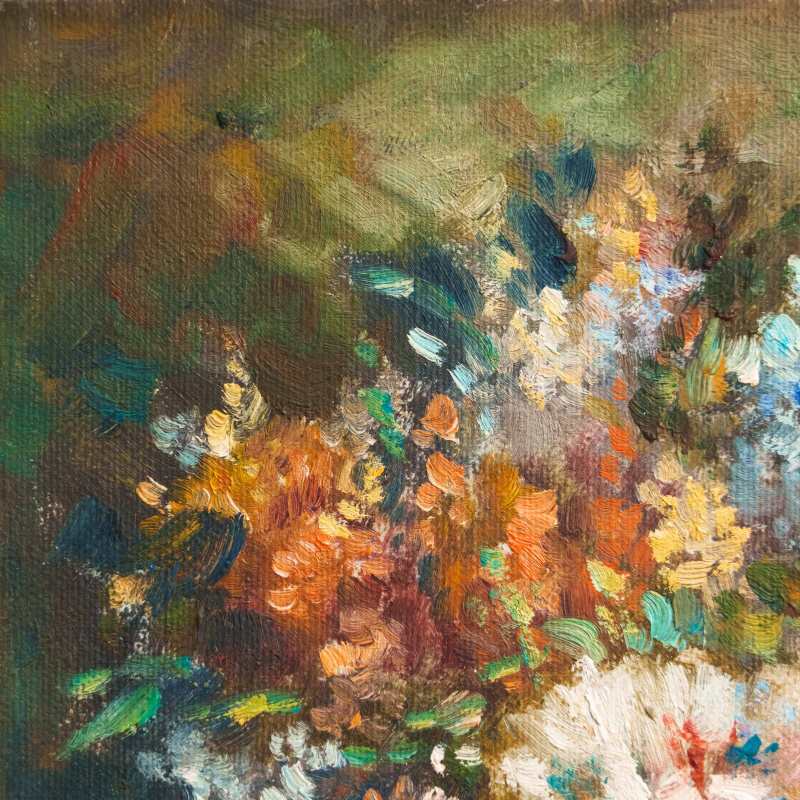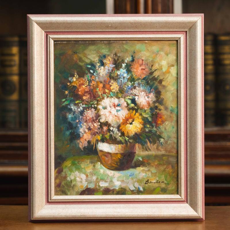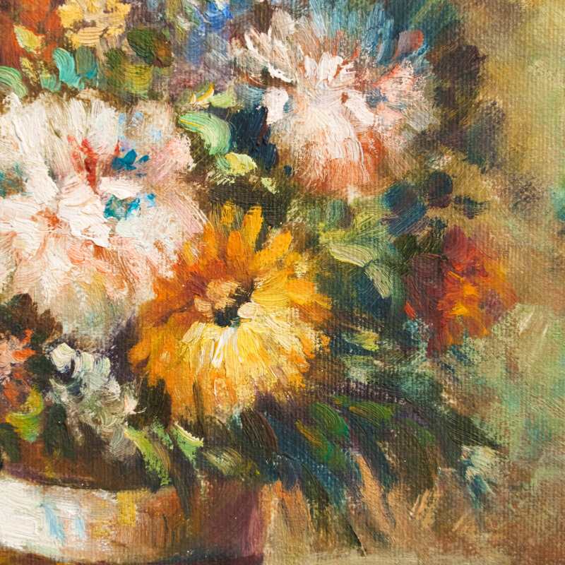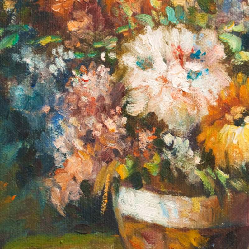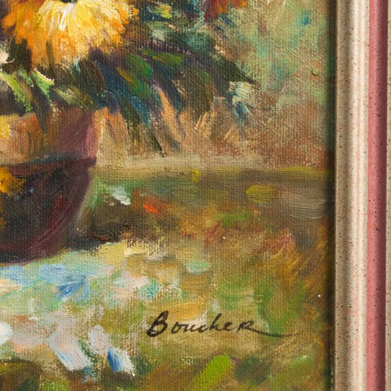 Великолепный солнечный натюрморт с условным названием «Садовые цветы» французского художника Gaston Boucher. Авторская подпись, подтверждающая подлинность данной картины, находится справа внизу.