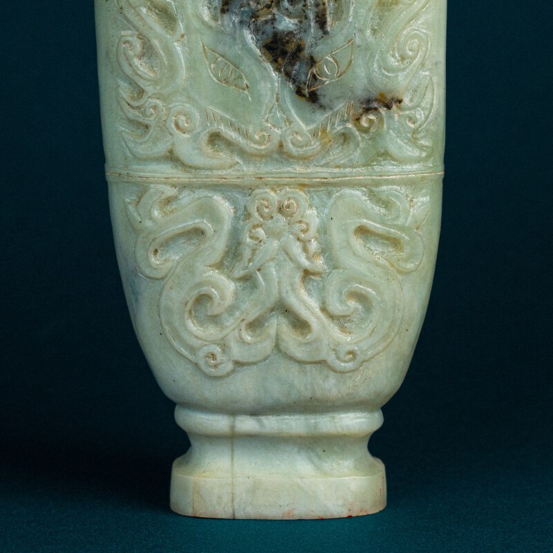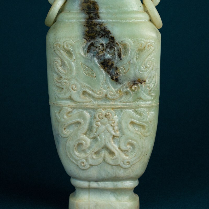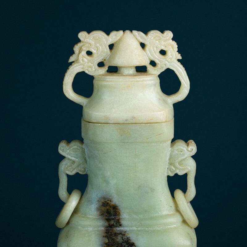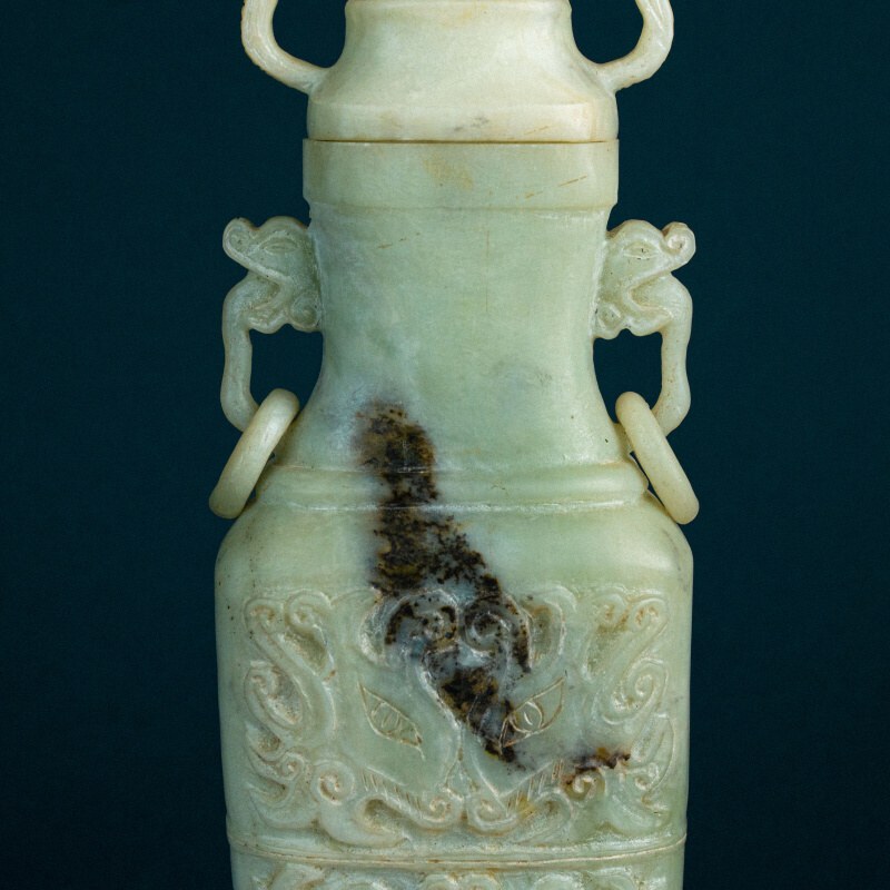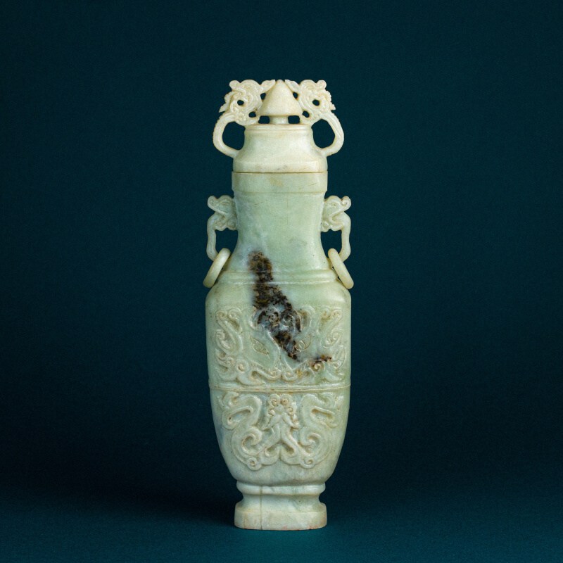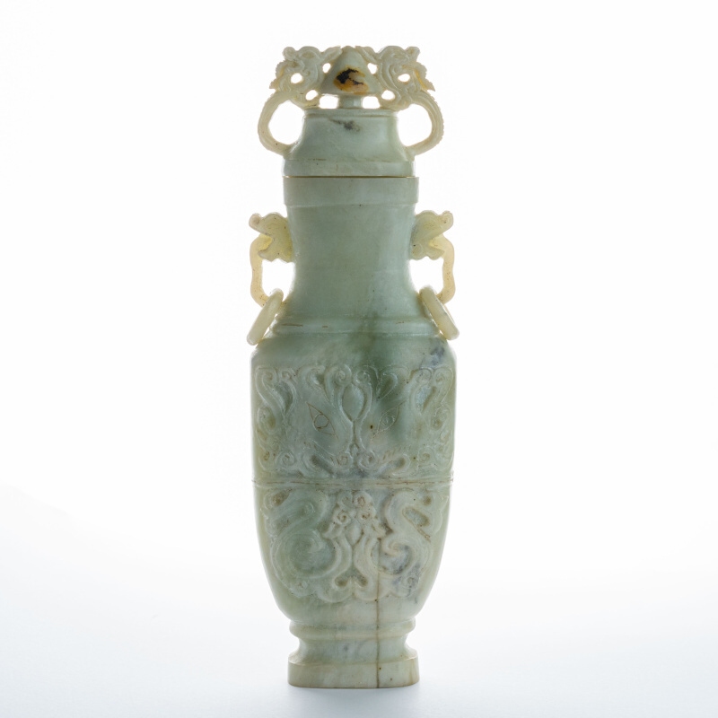 Нефритовая ваза с крышкой — Китай, династия Цин, 19 век. Нефритовая ваза из зеленого нефрита в приплюснутой Ху-образной форме, гравированный декор в архаическом стиле, головы мифических животных с изогнутыми языками по бокам вазы и так же на крышке.