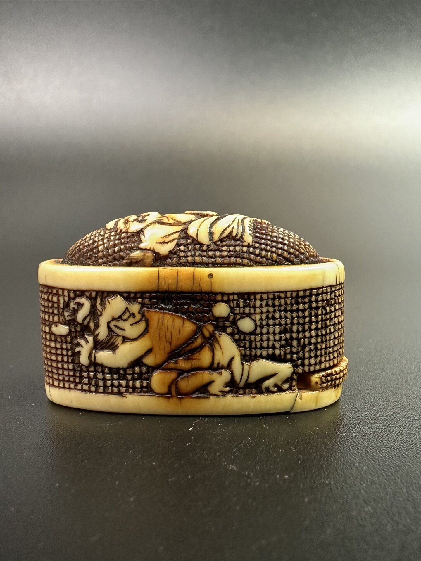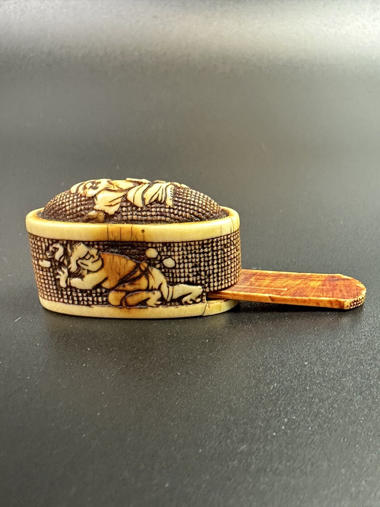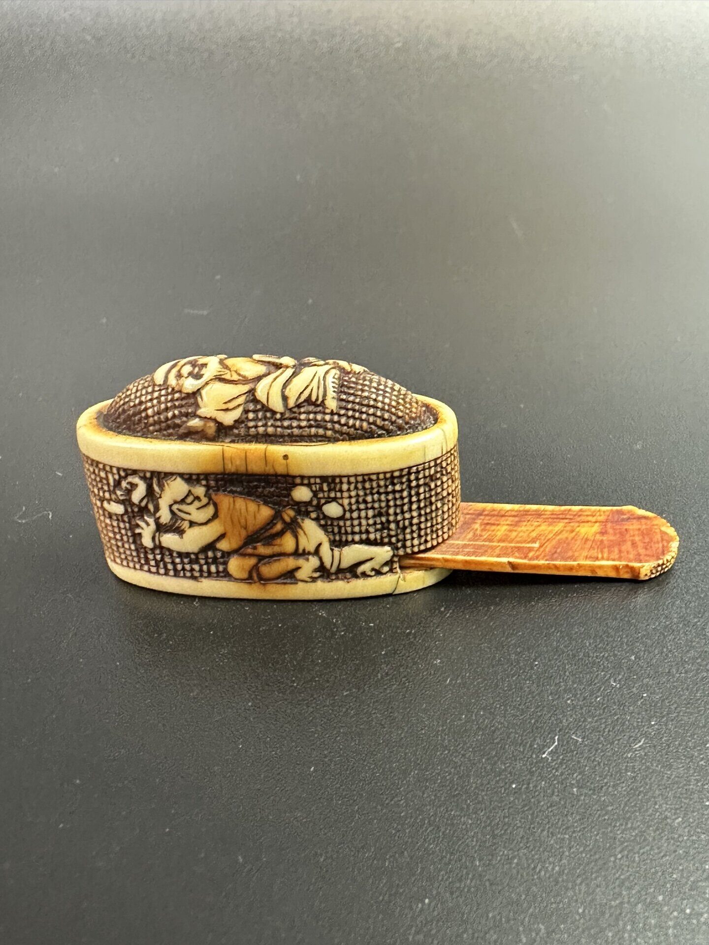 Предмет украшен сложной резьбой с изображением фигур людей в характерном японском стиле.