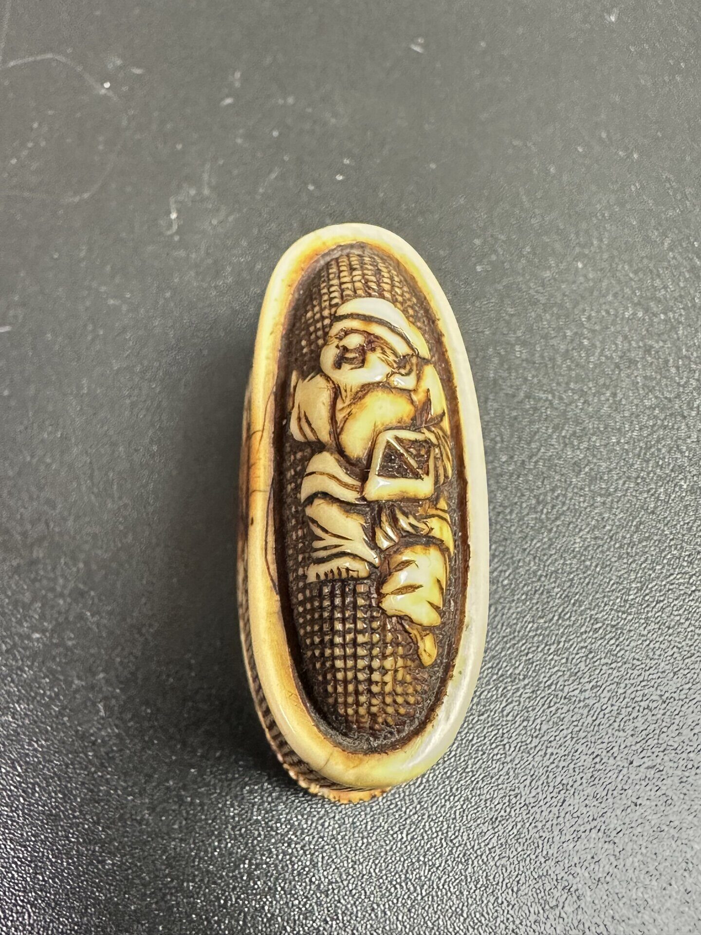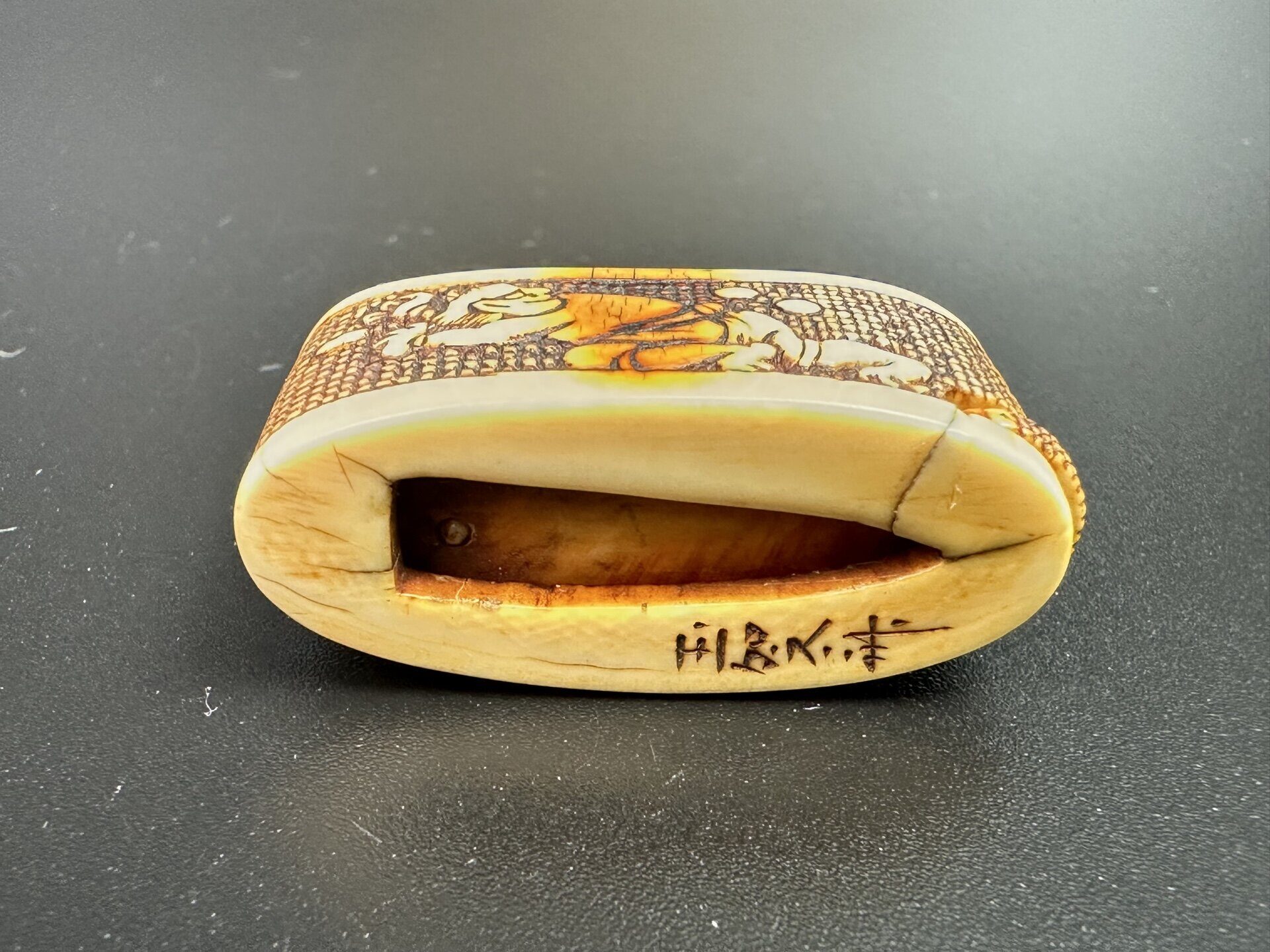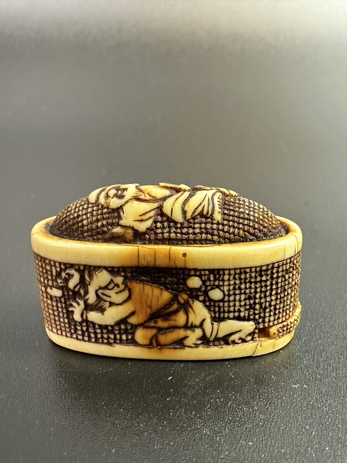 Предмет украшен сложной резьбой с изображением фигур людей в характерном японском стиле.