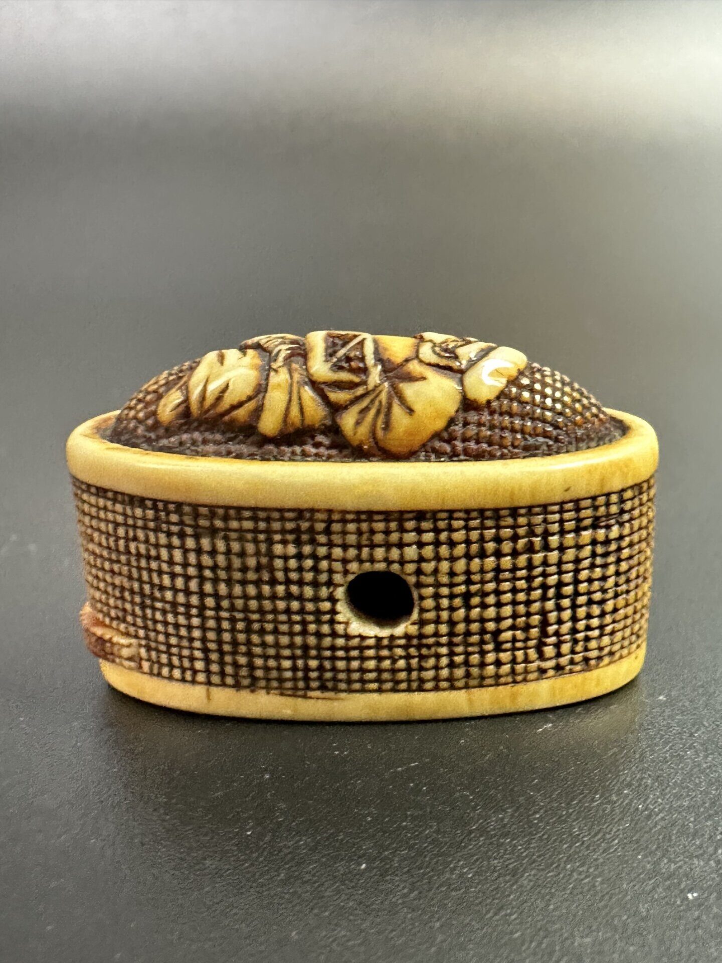 Изделие представляет собой небольшую резную шкатулку (или футляр - тонкацу), вероятно, предназначенную для хранения мелких предметов или в качестве элемента мужского костюма в традиционной Японии.