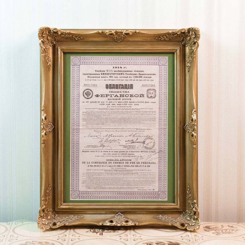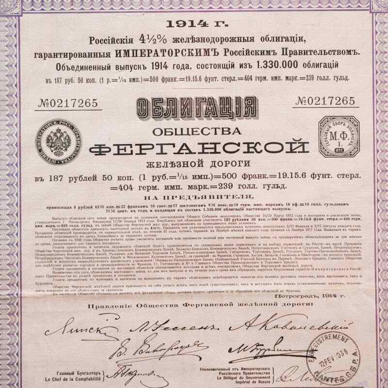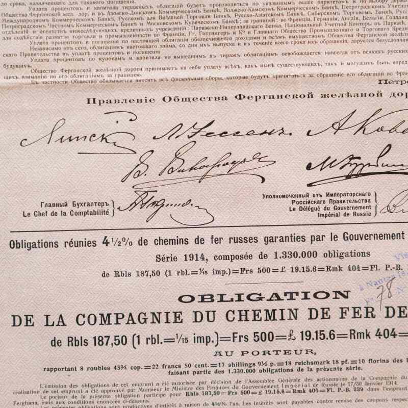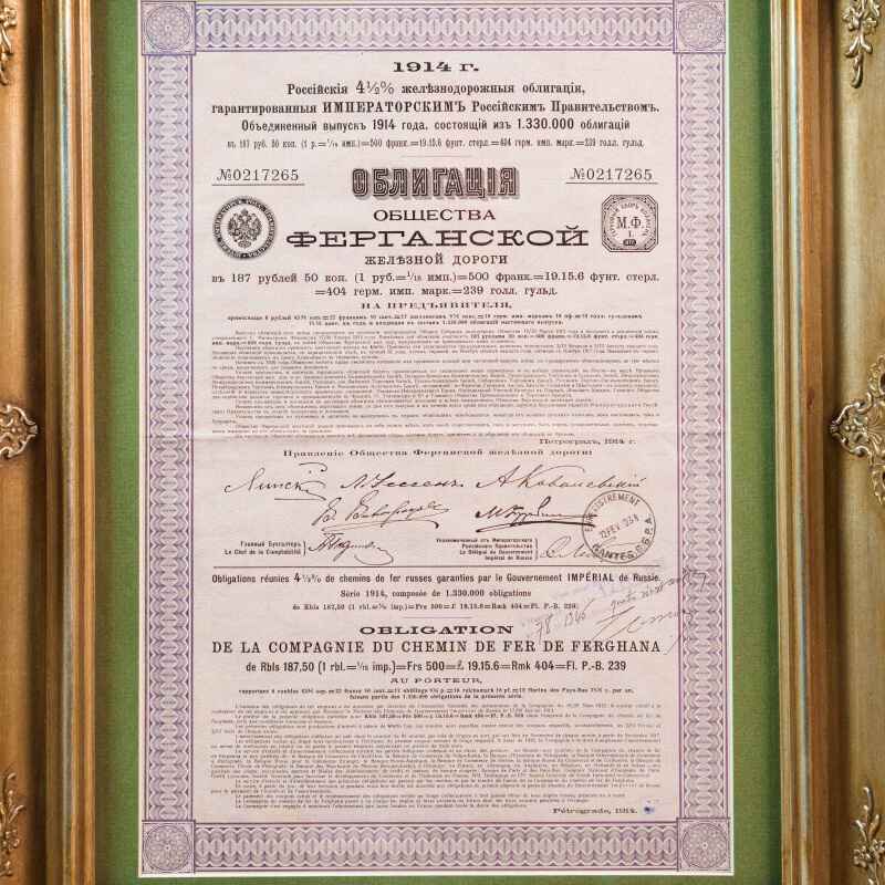 Представлена облигация Общества Ферганской железной дороги номиналом 187 рублей 50 копеек, выпущенная в 1914 году. Облигация на предъявителя с доходностью 4,5% годовых.
