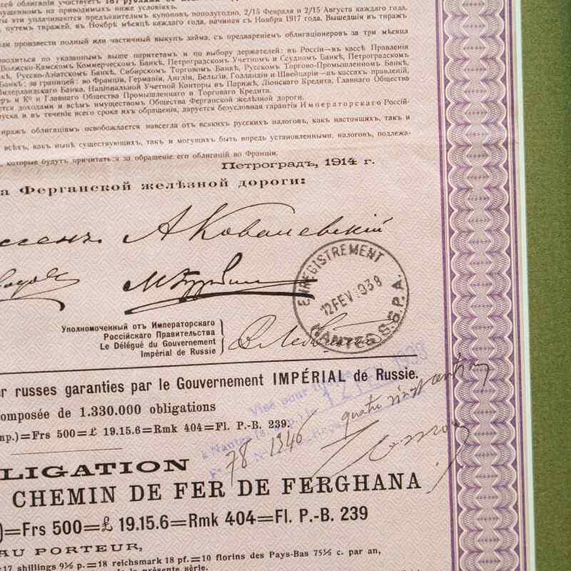 Выплата процентов и капитала гарантировалось Императорским Российским правительством. Текст составлен на двух языках- русском и французском, так как значительная часть Российских железнодорожных займов того времени размещалось на бирже в Париже.