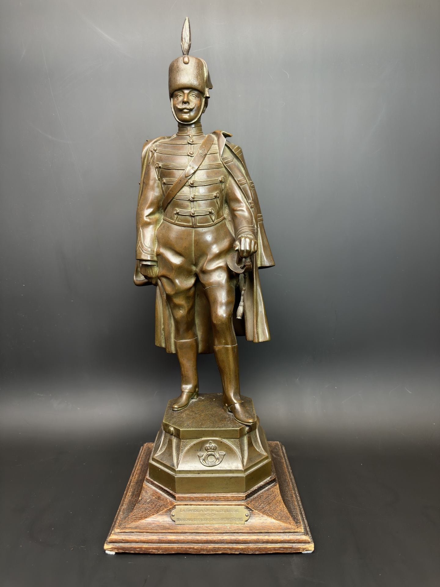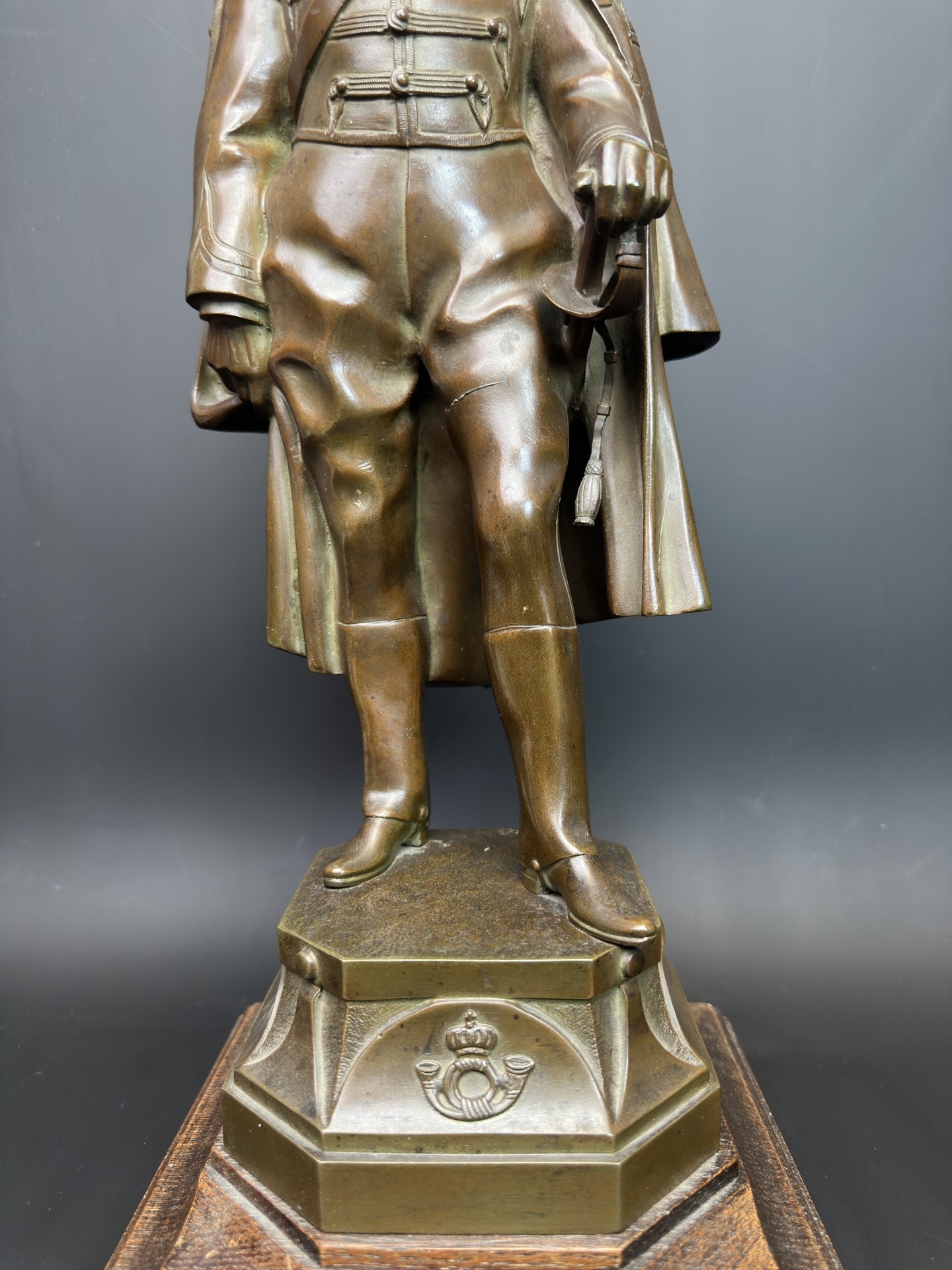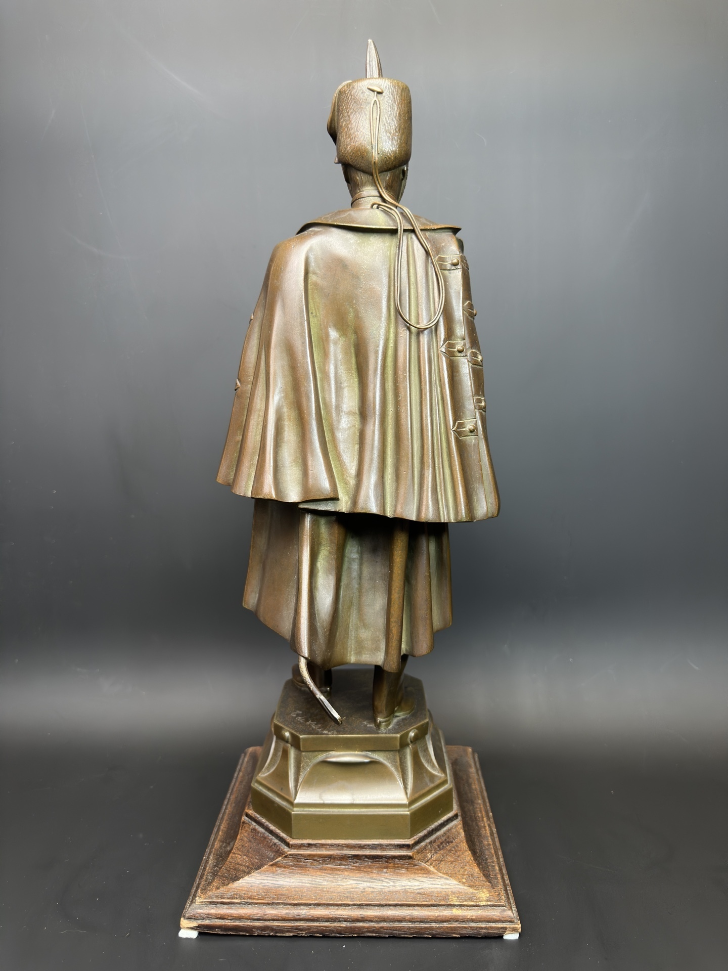 Скульптура выполнена из бронзы и установлена на деревянном постаменте.