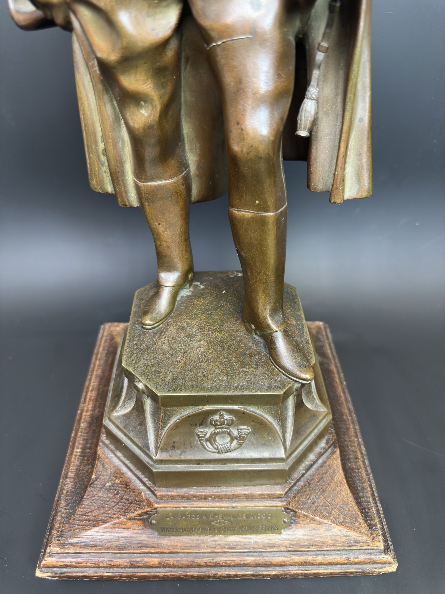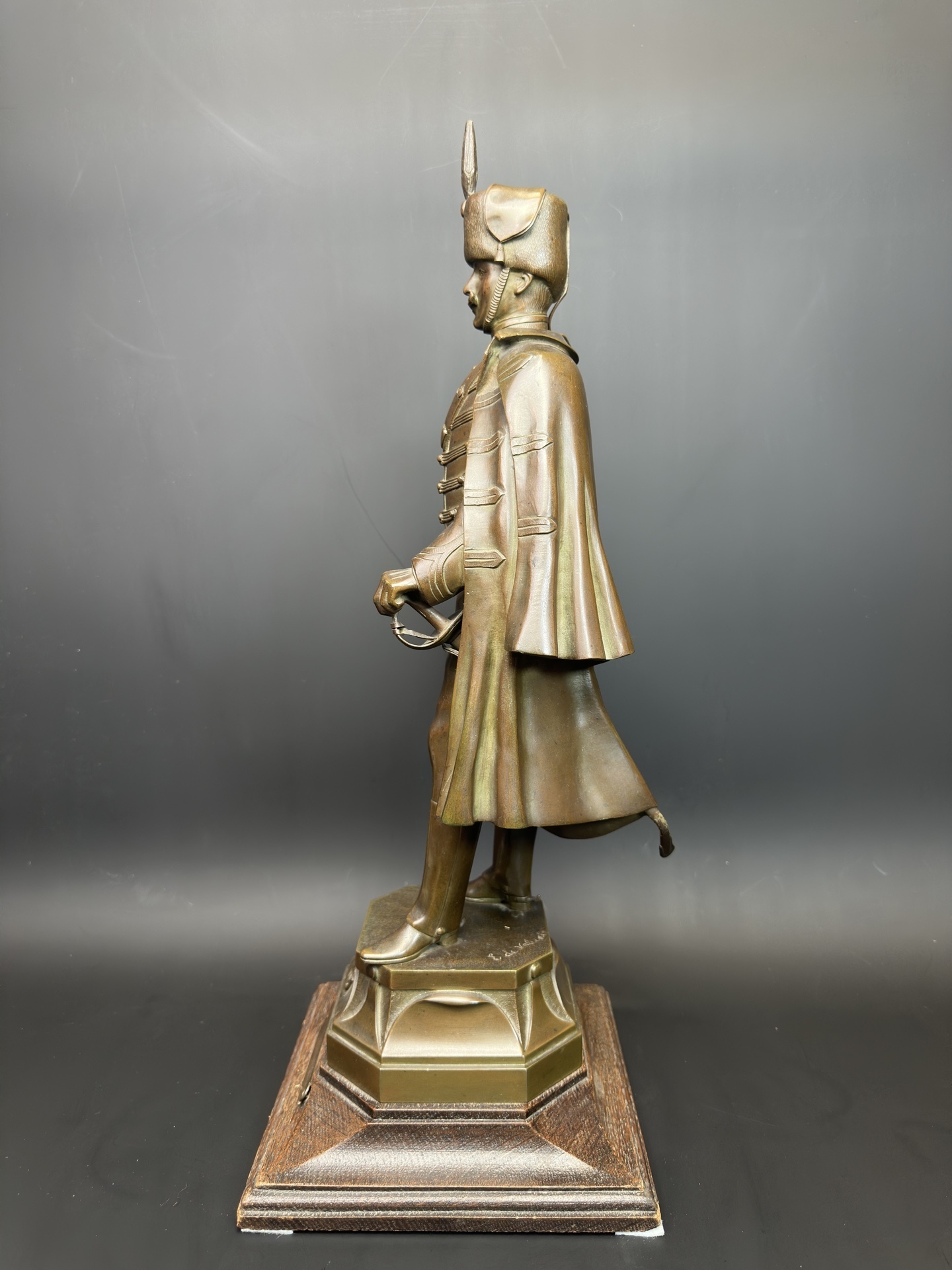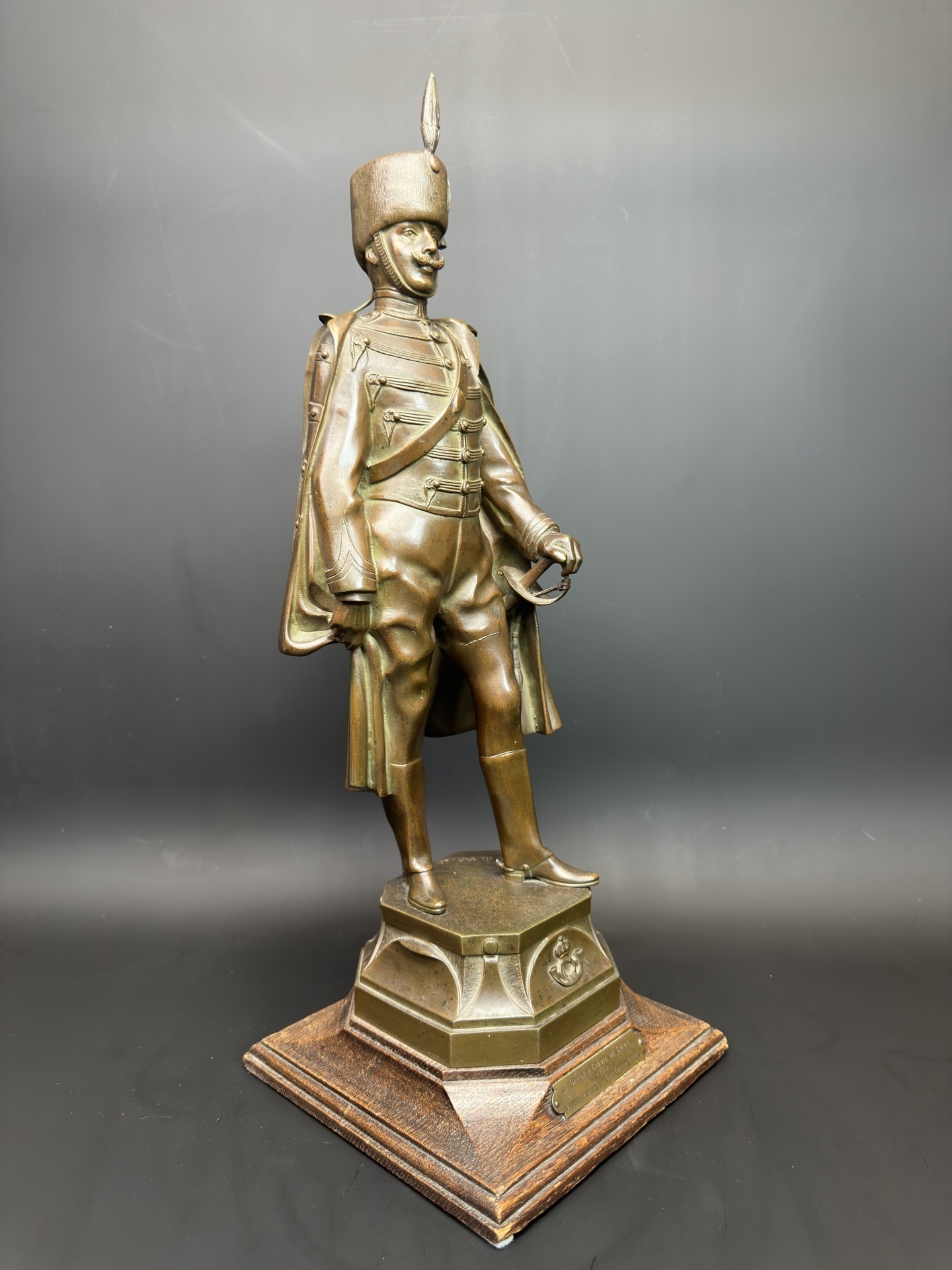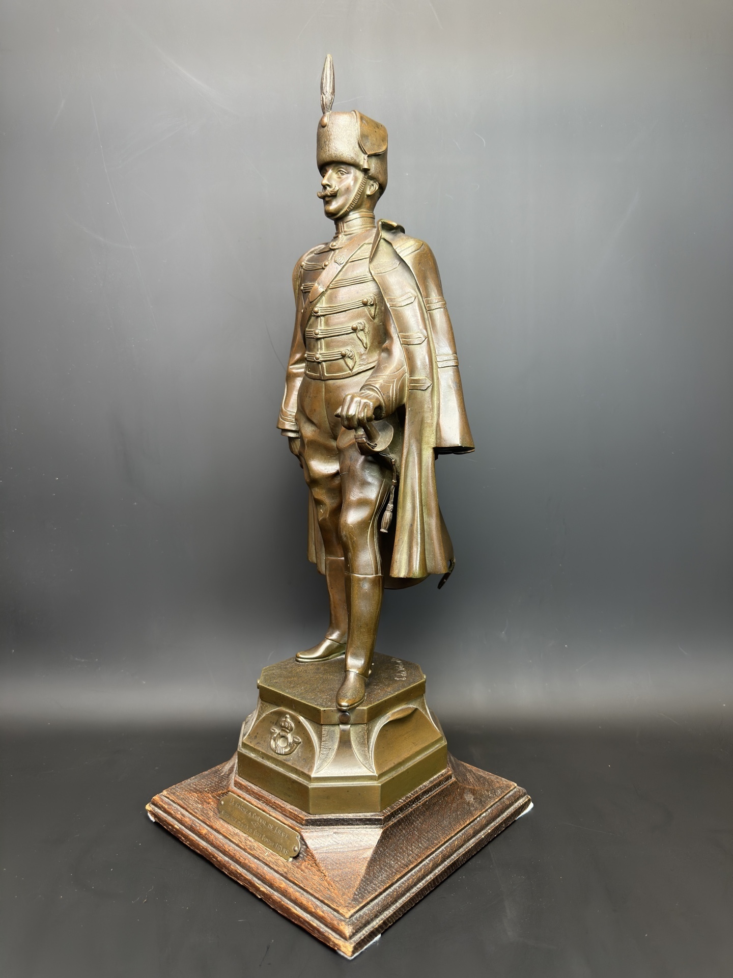 Скульптура выполнена из бронзы и установлена на деревянном постаменте.
