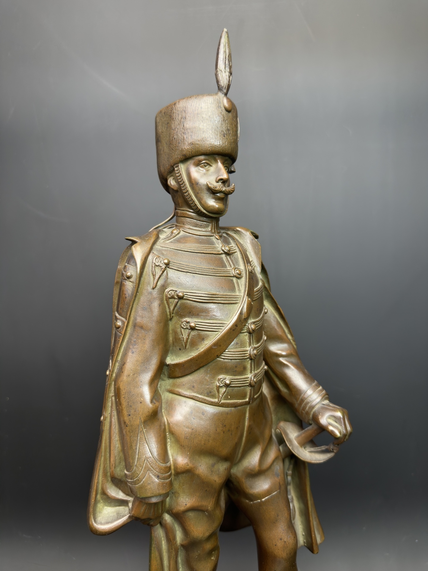 Персонаж одет в униформу, включающую шлем с плюмажем, мундир с эполетами и плащ, наброшенный через плечо.