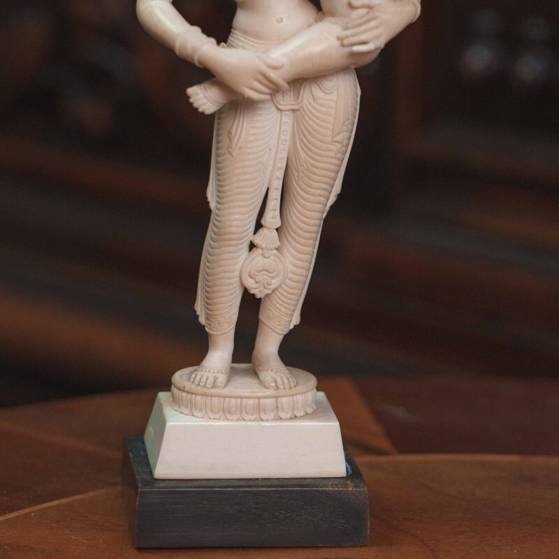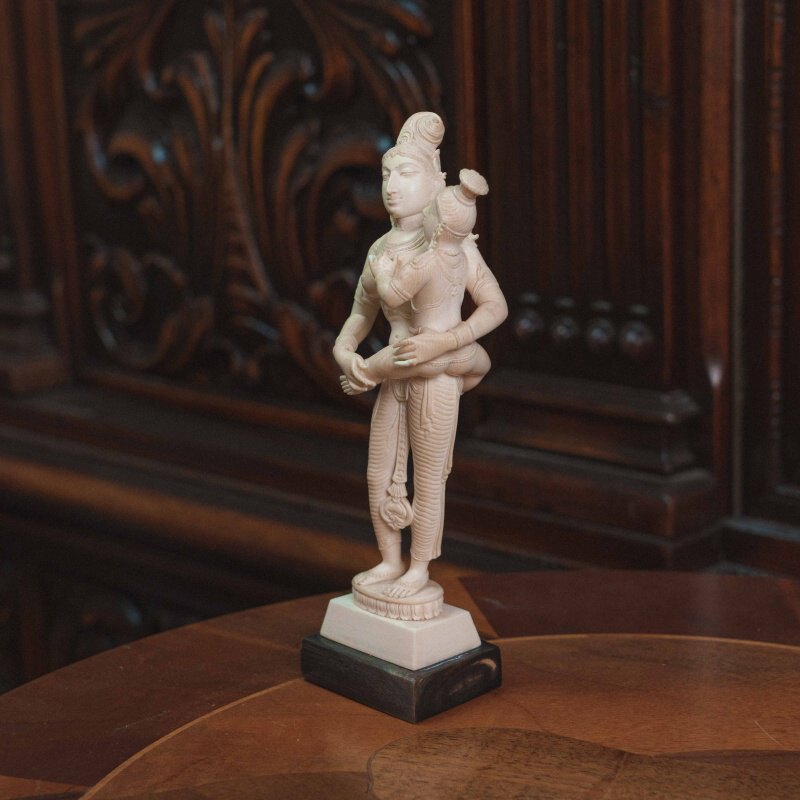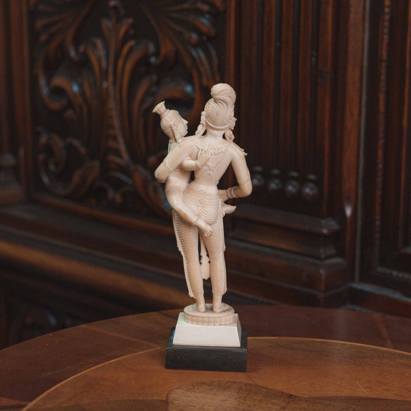 В искусстве индийской резьбы чаше всего встречаются плоские фигуры. Данная композиция выгодно отличается высоким рельефом и объёмностью.