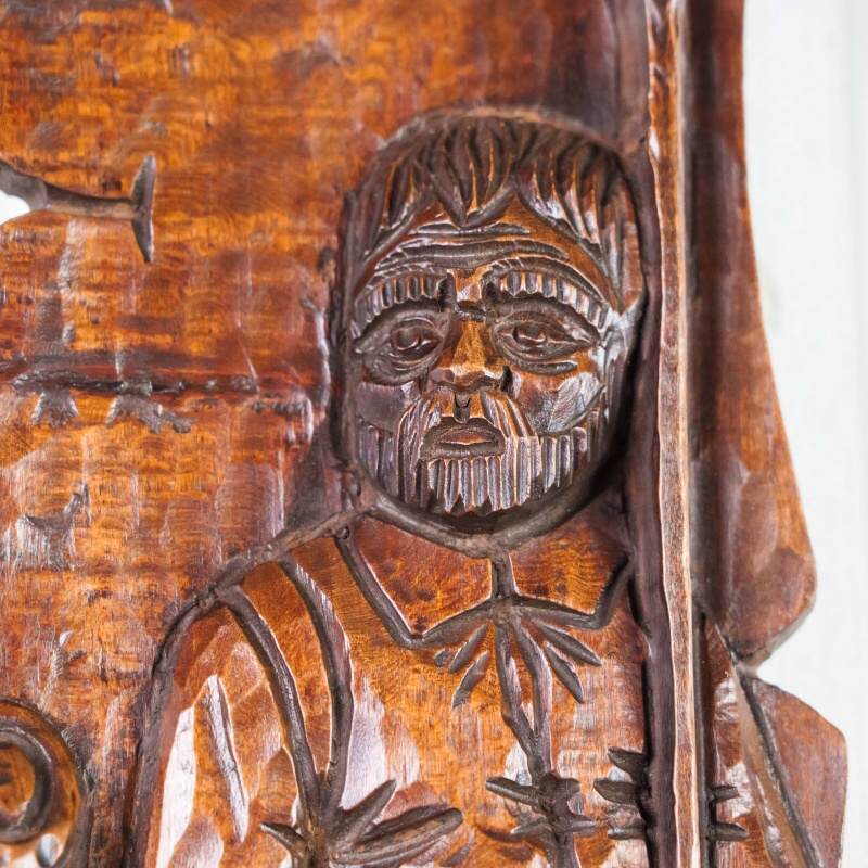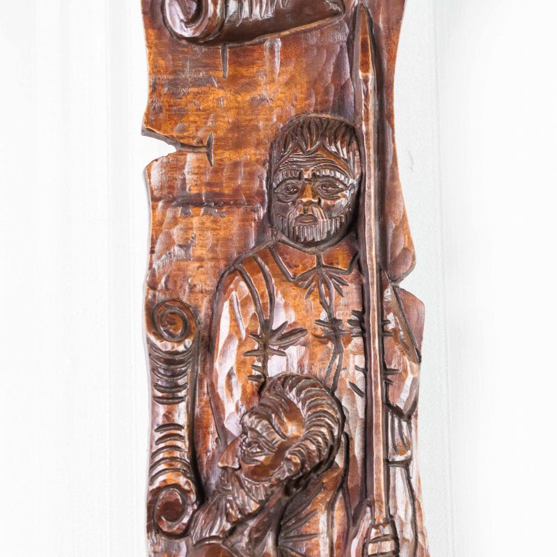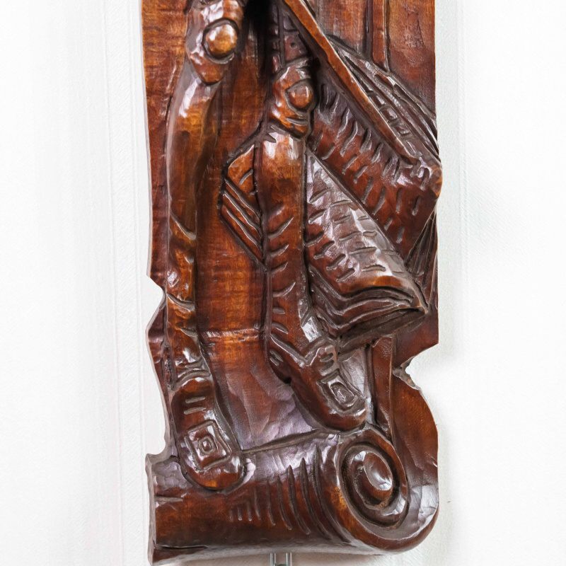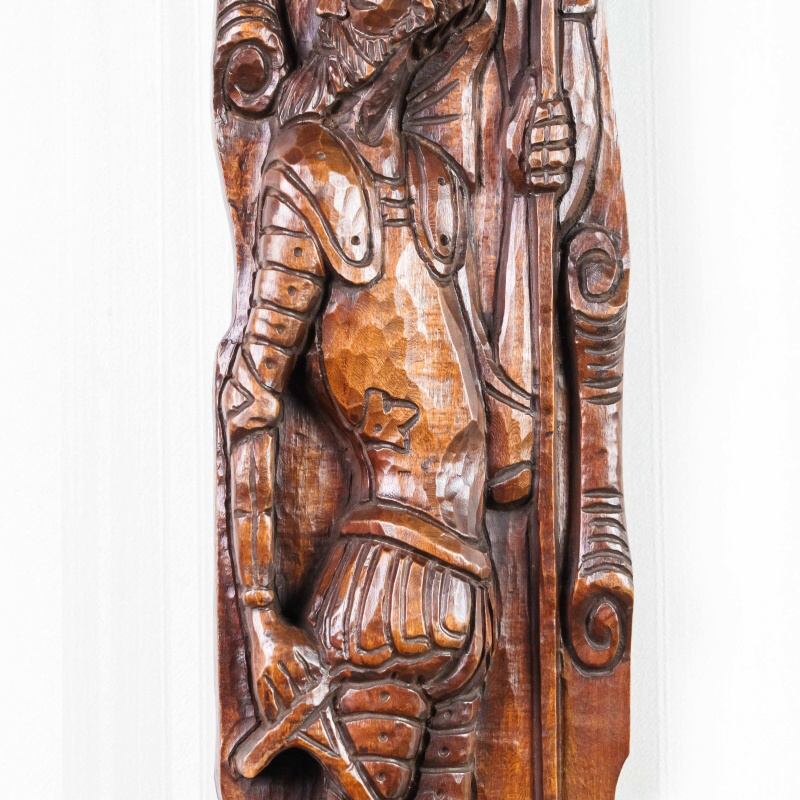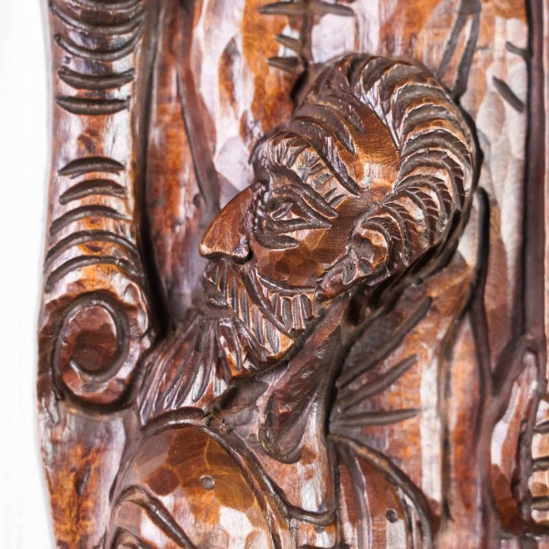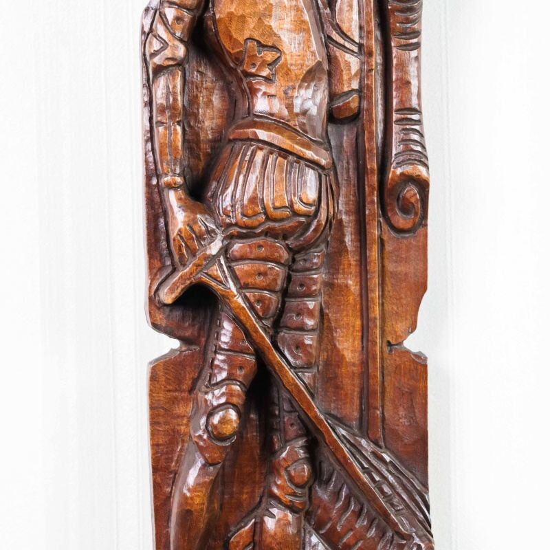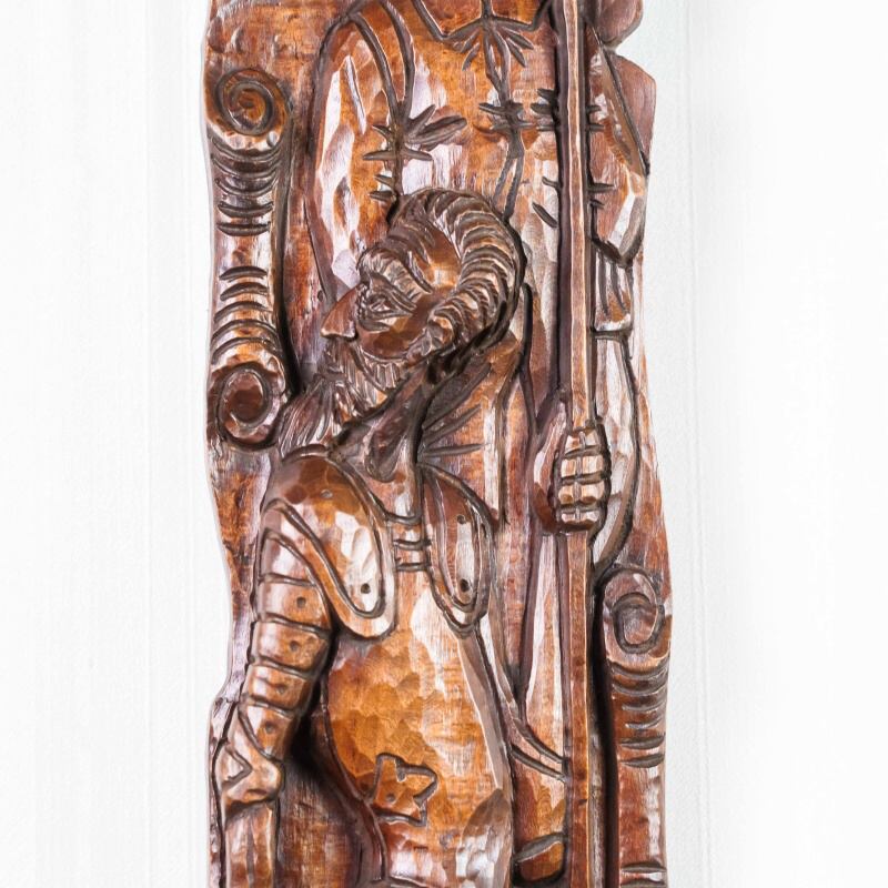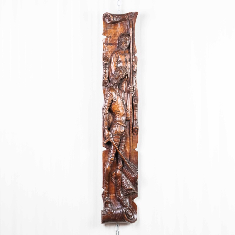 Это вертикальное антикварное панно, выполненное из тёмного дерева, представляет собой образец глубокой и объёмной резьбы на историческую или героическую тему. Резьба выполнена в стиле, напоминающем Неоготику или Неоренессанс, популярные в XIX веке. Объёмная, детализированная проработка доспехов, складок одежды и черт лиц говорит о высоком мастерстве резчика. Композиция обрамлена стилизованными свитками или декоративными колоннами, что придает ей вид рельефной панели. Пано выполнено из темного дерева с богатой патиной, что подчеркивает его возраст и историческую ценность.