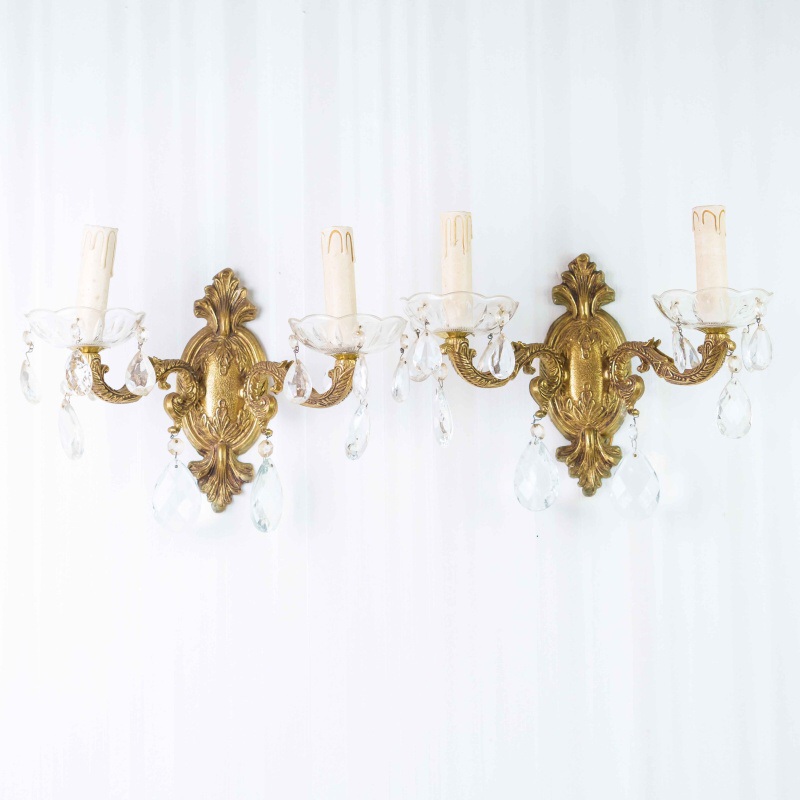Элегантная пара настенных бра, выполненных в стиле Людовика XV, отличается утончённым силуэтом и изысканной отделкой. Основание изготовлено из бронзы с позолоченным покрытием, украшено рельефным орнаментом с элементами рокайля и растительных завитков.