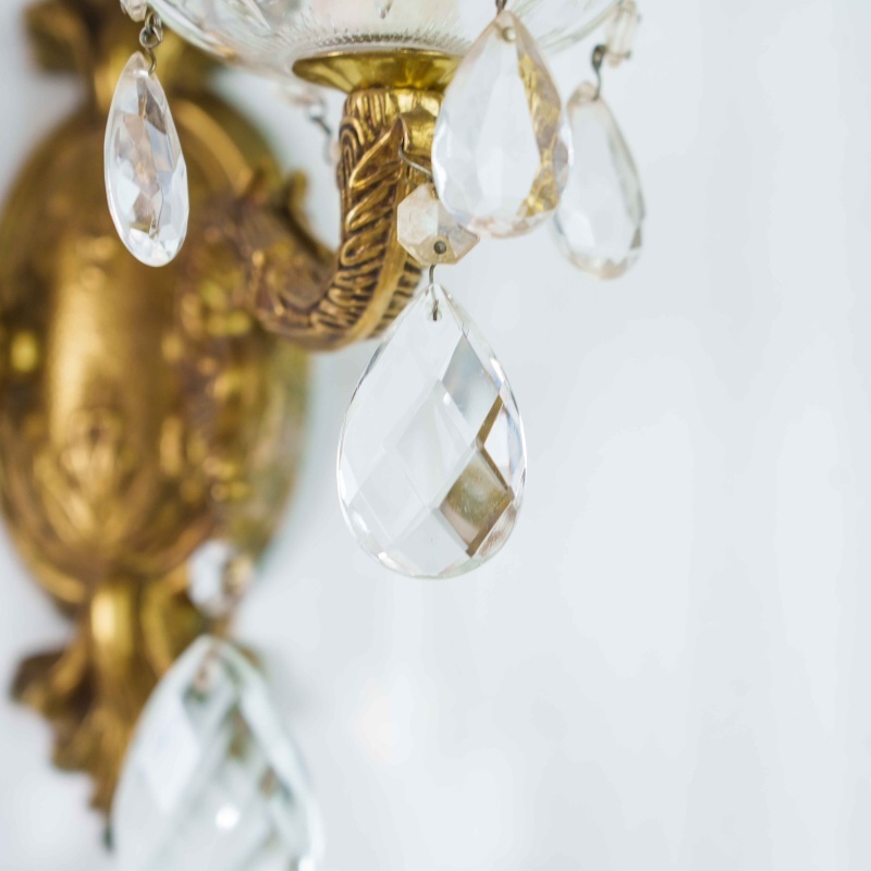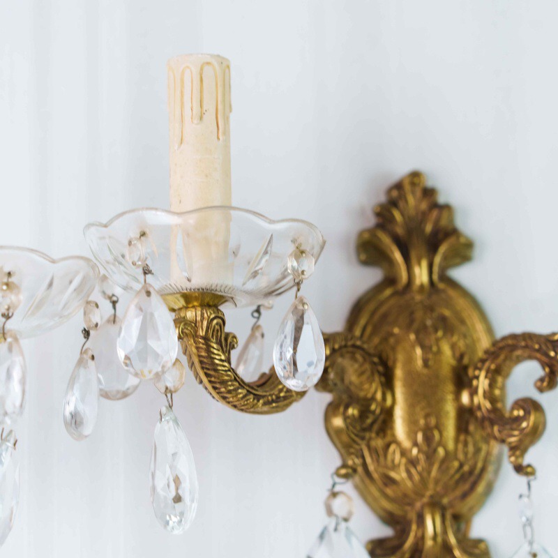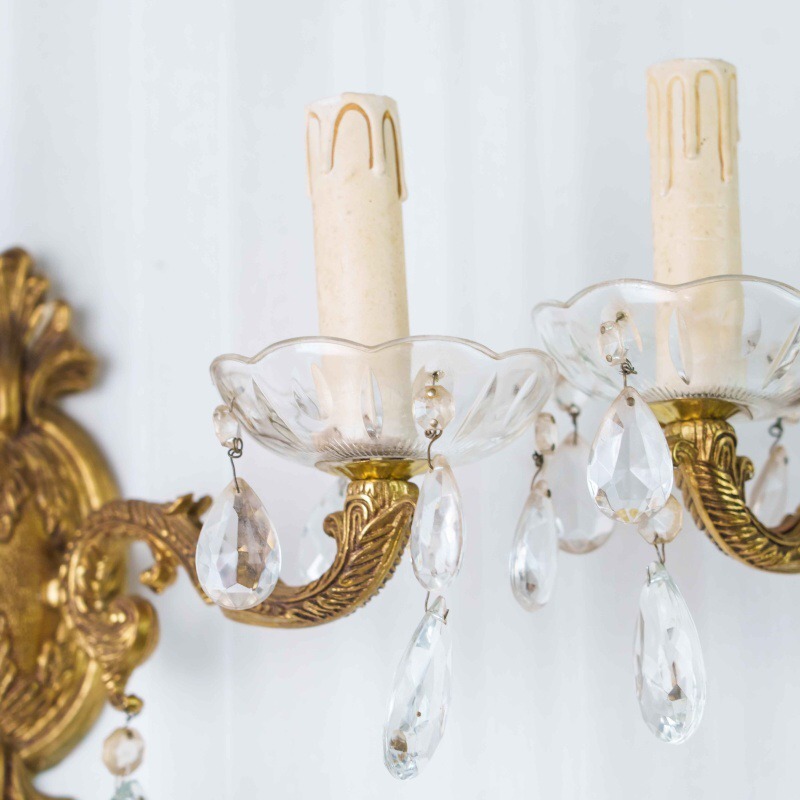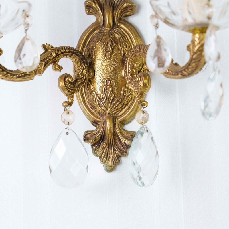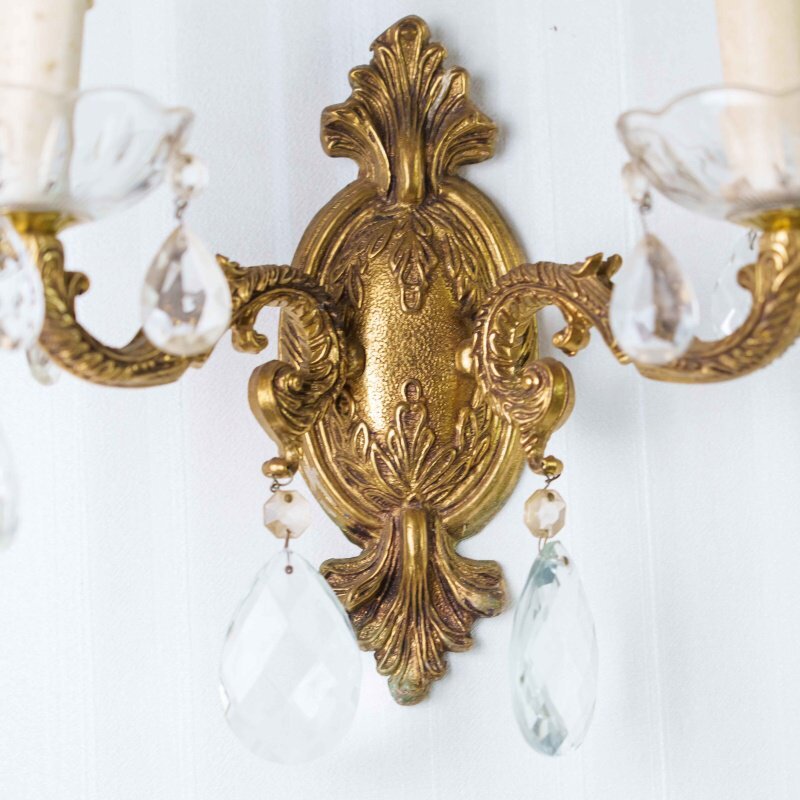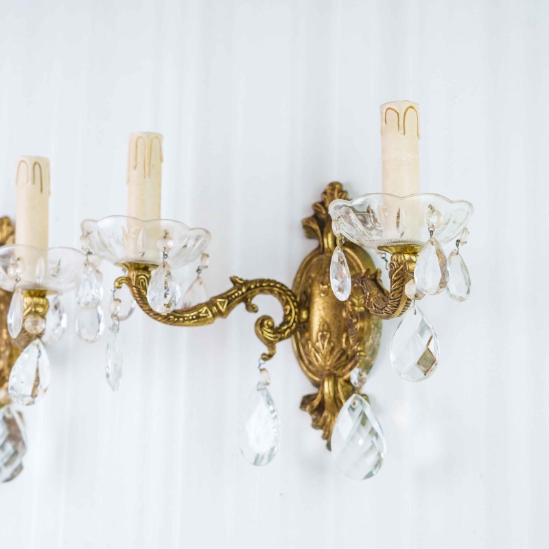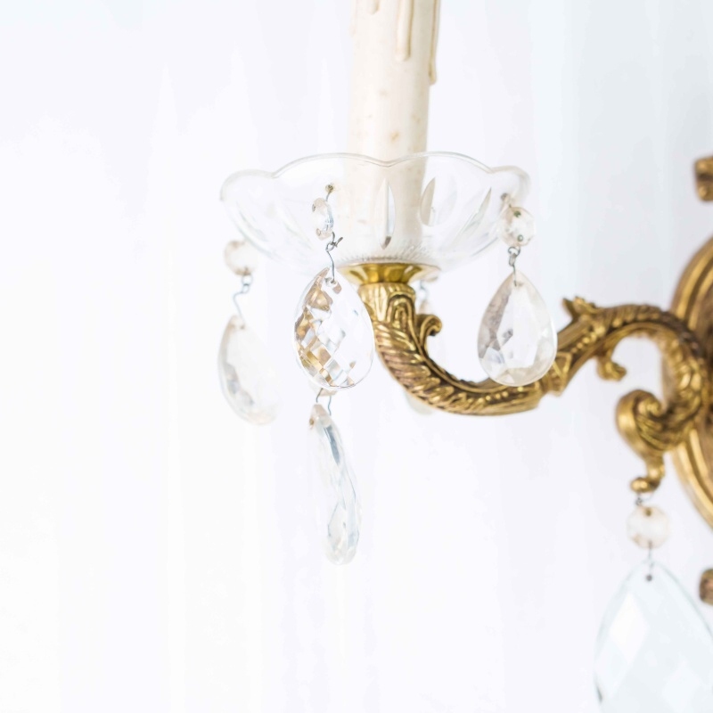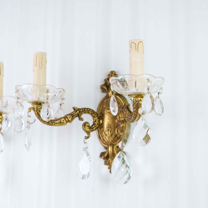 Каждое бра имеет два изогнутых рожка, декорированных стеклянными чашами и хрустальными подвесками каплевидной формы, которые мягко отражают свет, создавая игру бликов и тёплую атмосферу. Патроны стилизованы под свечи с потёками воска, что усиливает антикварный характер изделия.