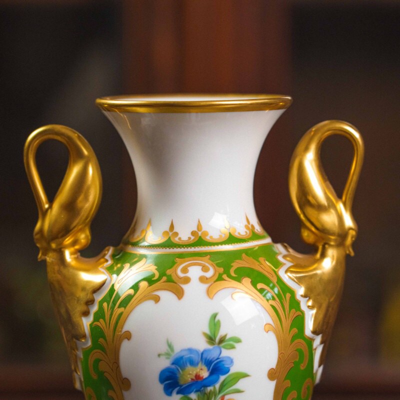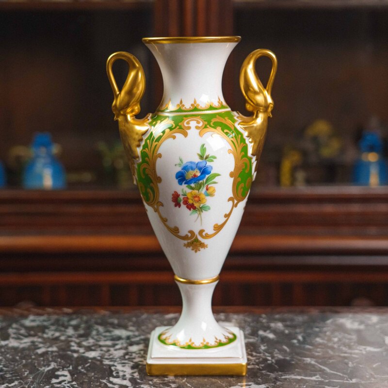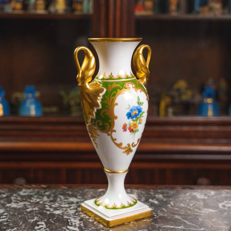 Стройный силуэт на высокой ножке придаёт ей аристократическую лёгкость, а симметричные золочёные ручки в форме лебедей добавляют ощущение дворцовой торжественности.