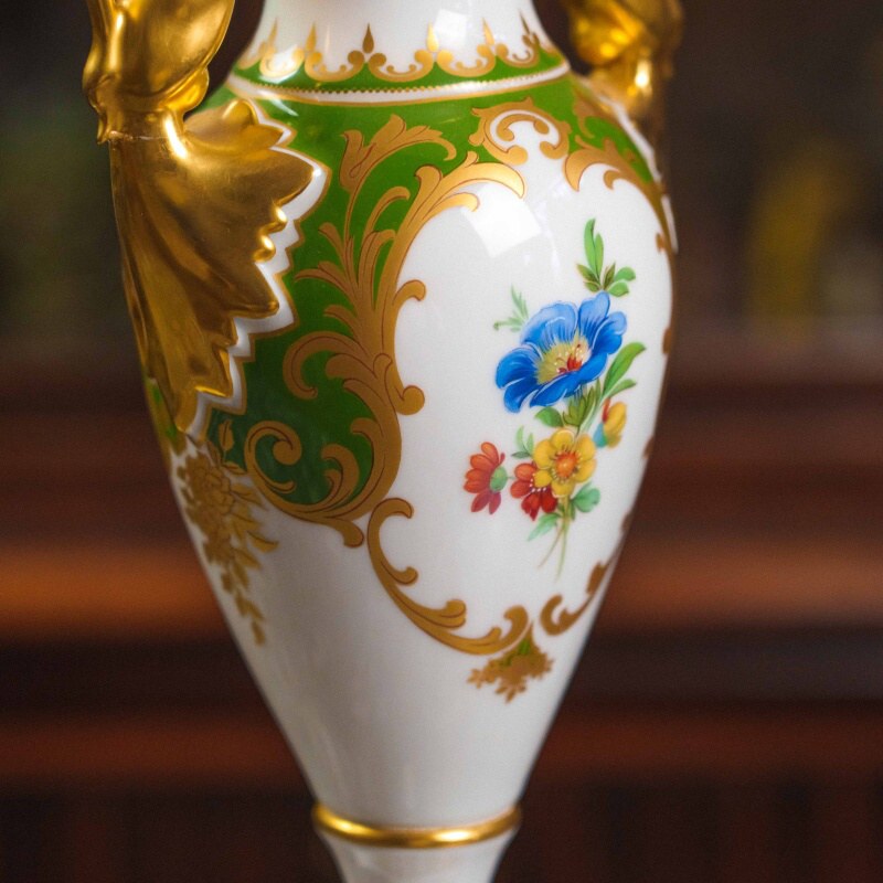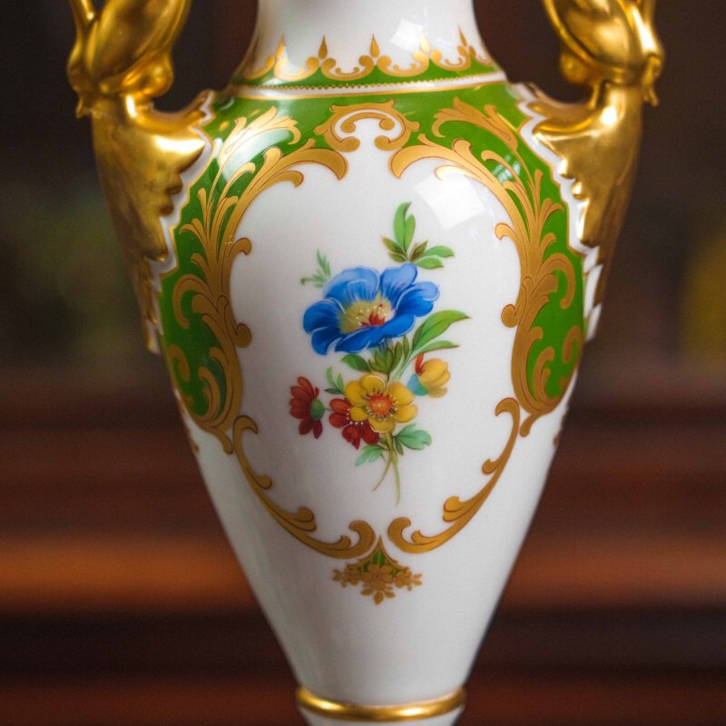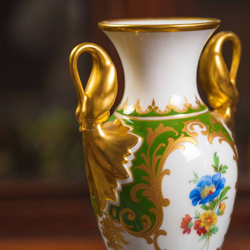Белоснежный фарфор служит идеальным фоном для насыщенного орнамента: сочная зелень, тонко прописанные цветы и щедрая позолота образуют гармоничную композицию, навеянную традициями европейского классицизма.