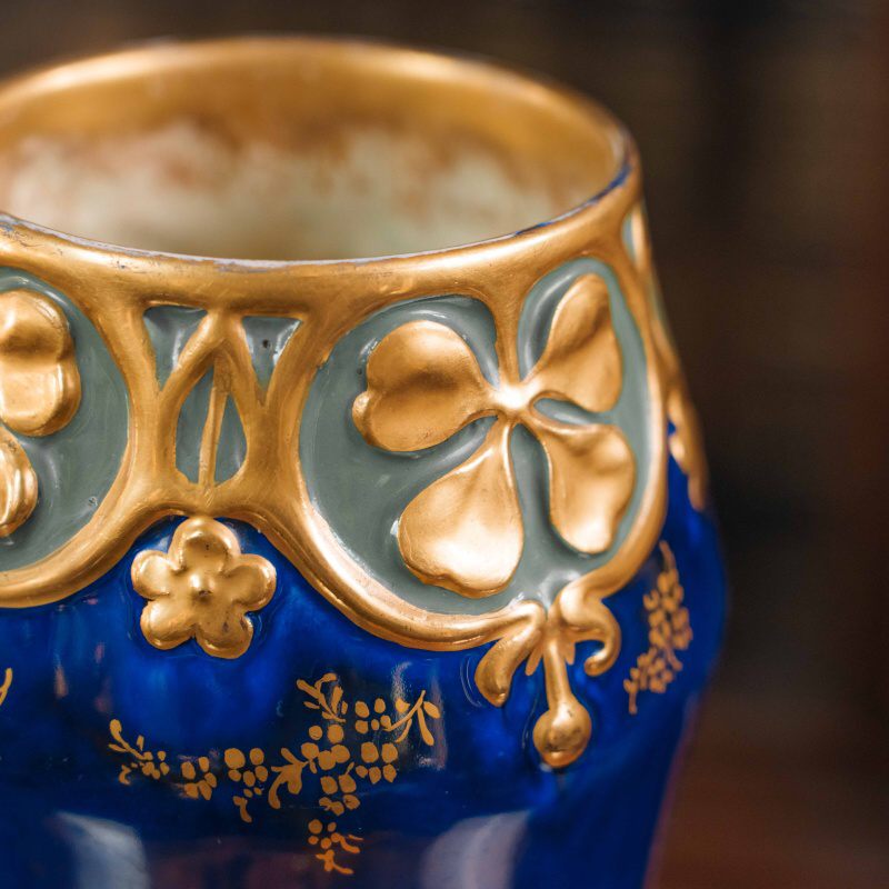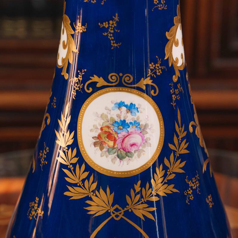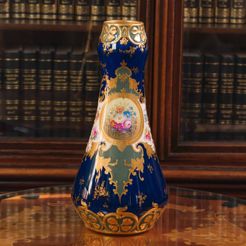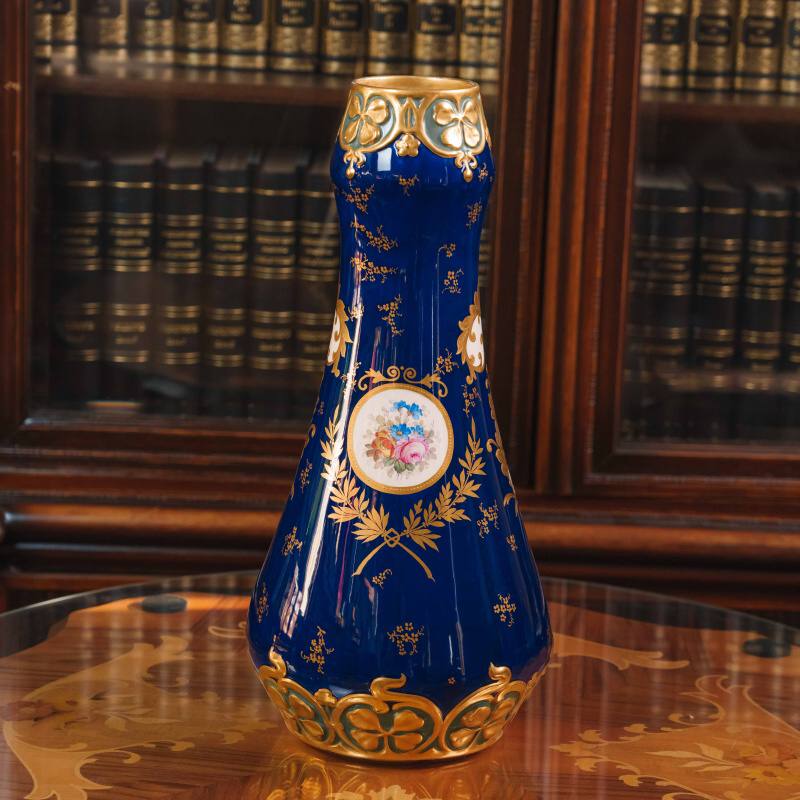 Ваза выполнена в элегантной вытянутой форме с плавными линиями, благодаря чему смотрится стройно и эффектно в любом интерьере. Глубокий кобальтовый цвет сразу притягивает взгляд, а золотой декор красиво играет на свету, создавая ощущение благородства и стиля. Растительный орнамент мягко обрамляет форму, не перегружая её, а наоборот — подчёркивая изящество силуэта.