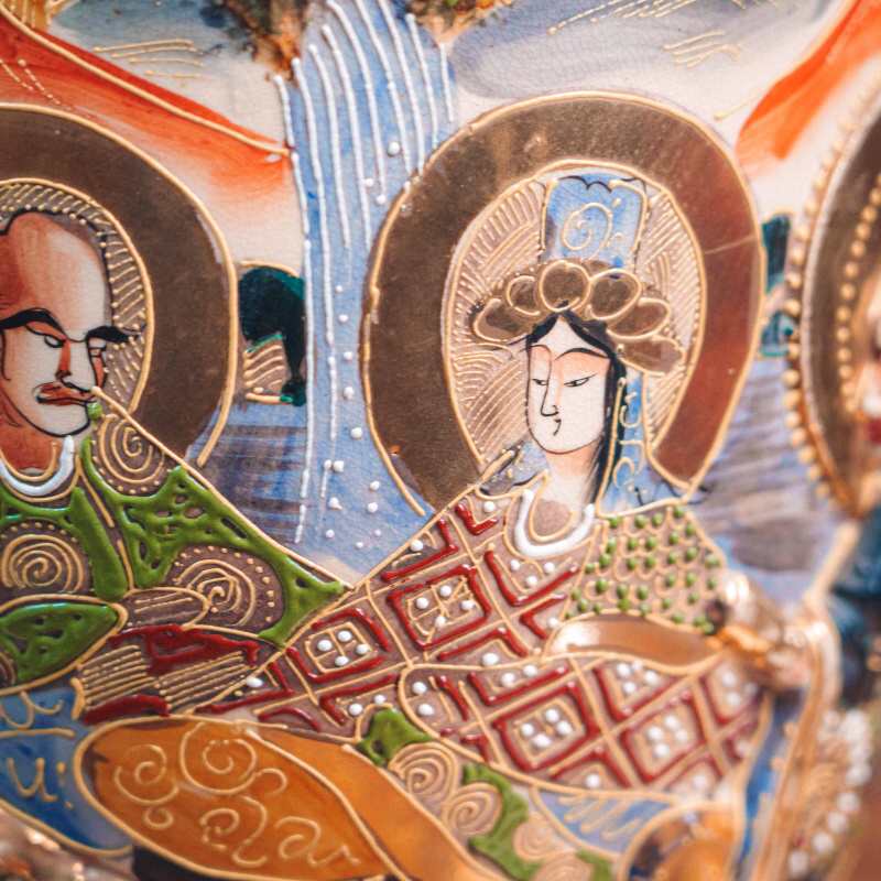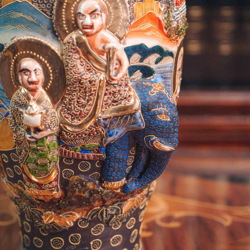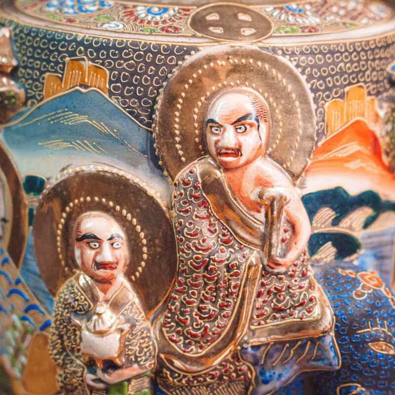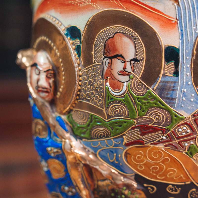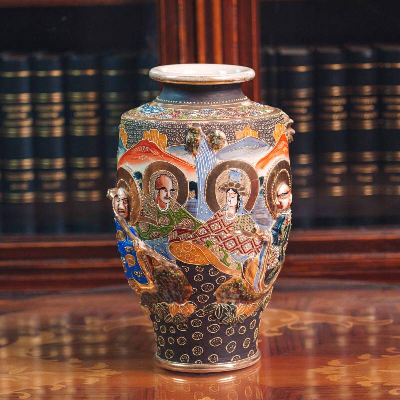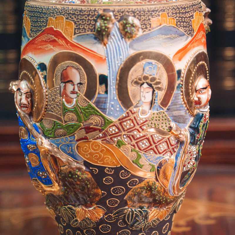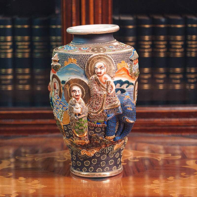 Парадная ваза, выполненная в традициях знаменитой японской керамики Сацума — одного из самых узнаваемых художественных направлений эпохи Мэйдзи. Композиция росписи посвящена буддийской тематике: на поверхности вазы изображены архаты — просветленные ученики Будды, а также центральная фигура — богиня милосердия Каннон. Ее образ выделяется спокойствием, утонченностью и особой гармонией. Каннон в японской традиции является воплощением сострадания, защиты и духовной помощи, к ней обращаются за утешением и покровительством.