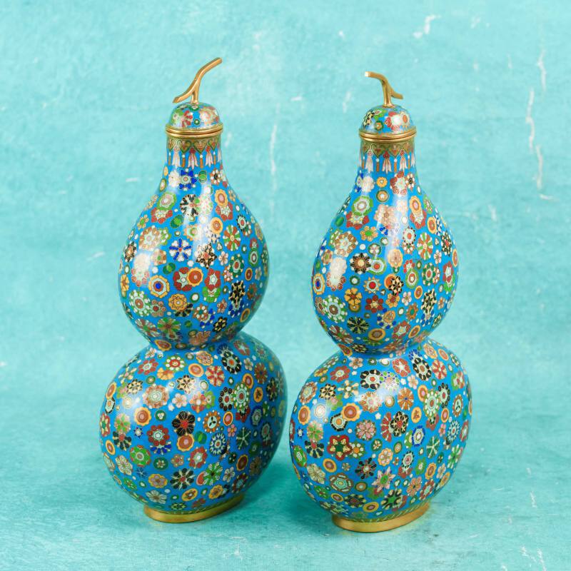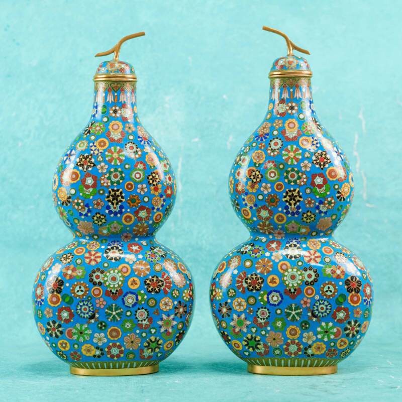 Парные декоративные вазы выполнены в традиционной форме тыквы Ву-Лу, символа долголетия, благополучия и защиты в восточной культуре. Характерный двойной силуэт с плавным переходом объёмов подчёркивает гармонию пропорций и придаёт предметам выразительный декоративный силуэт.