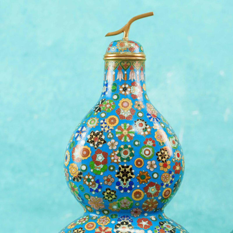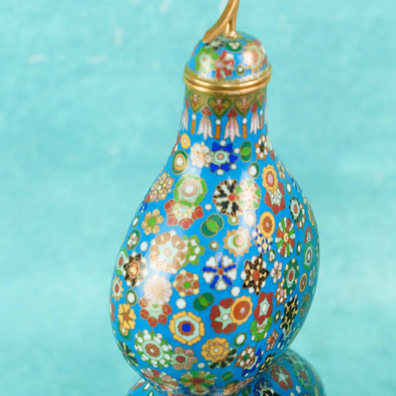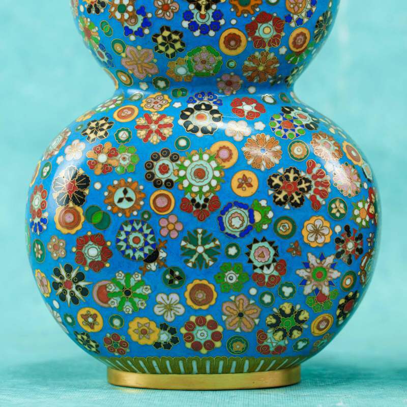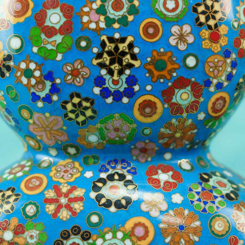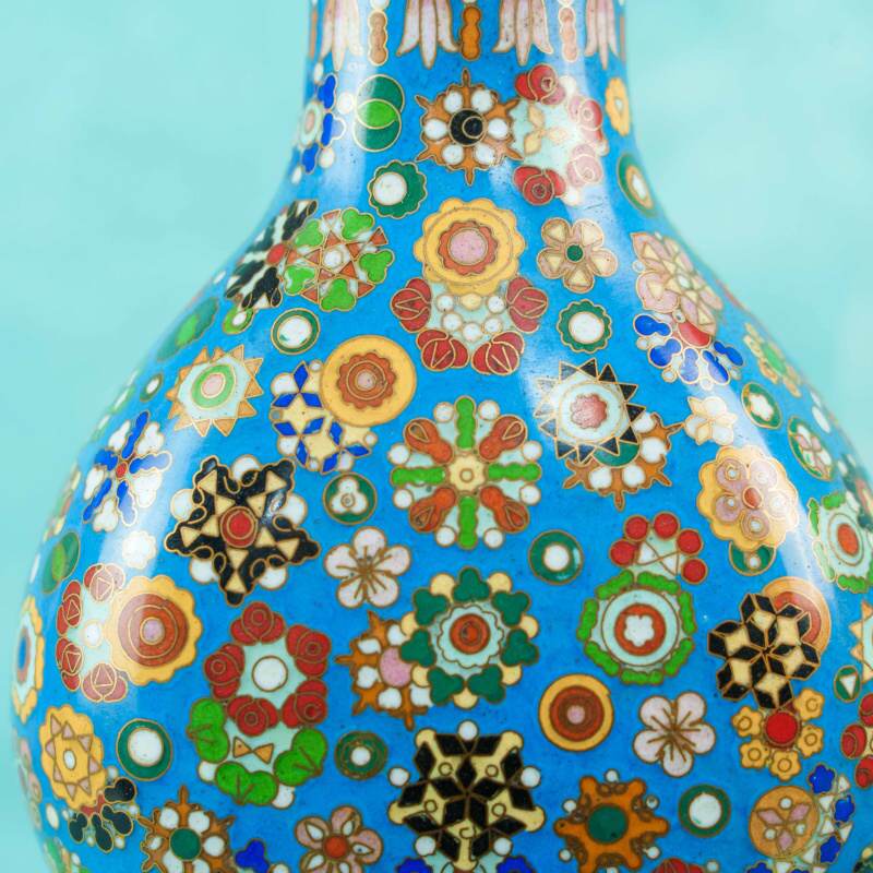 Поверхность ваз покрыта насыщенной бирюзово-синей эмалью и полностью украшена сложным орнаментом в технике, имитирующей millefiori — многоцветные розетты, геометрические и цветочные мотивы, выполненные в красных, зелёных, белых, жёлтых и чёрных тонах с тонкими золотыми контурами. Плотность узора создаёт эффект драгоценной мозаики и придаёт предметам особую декоративную насыщенность.