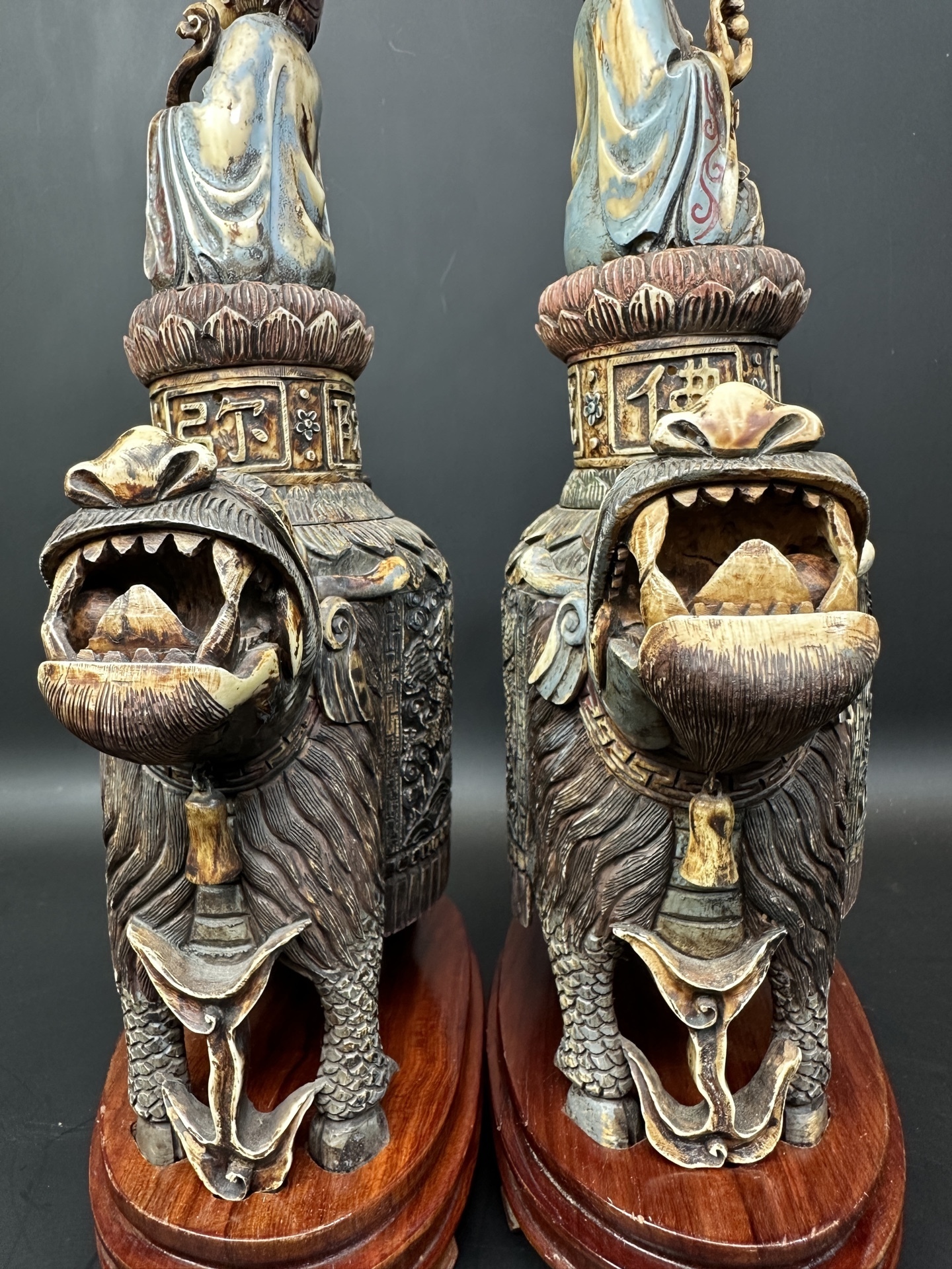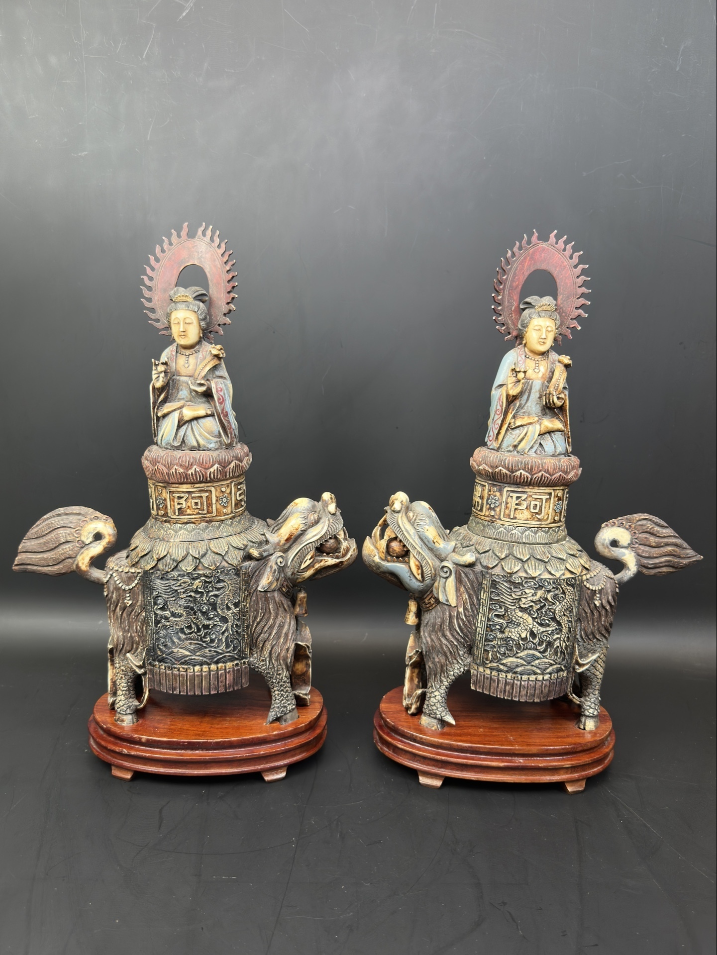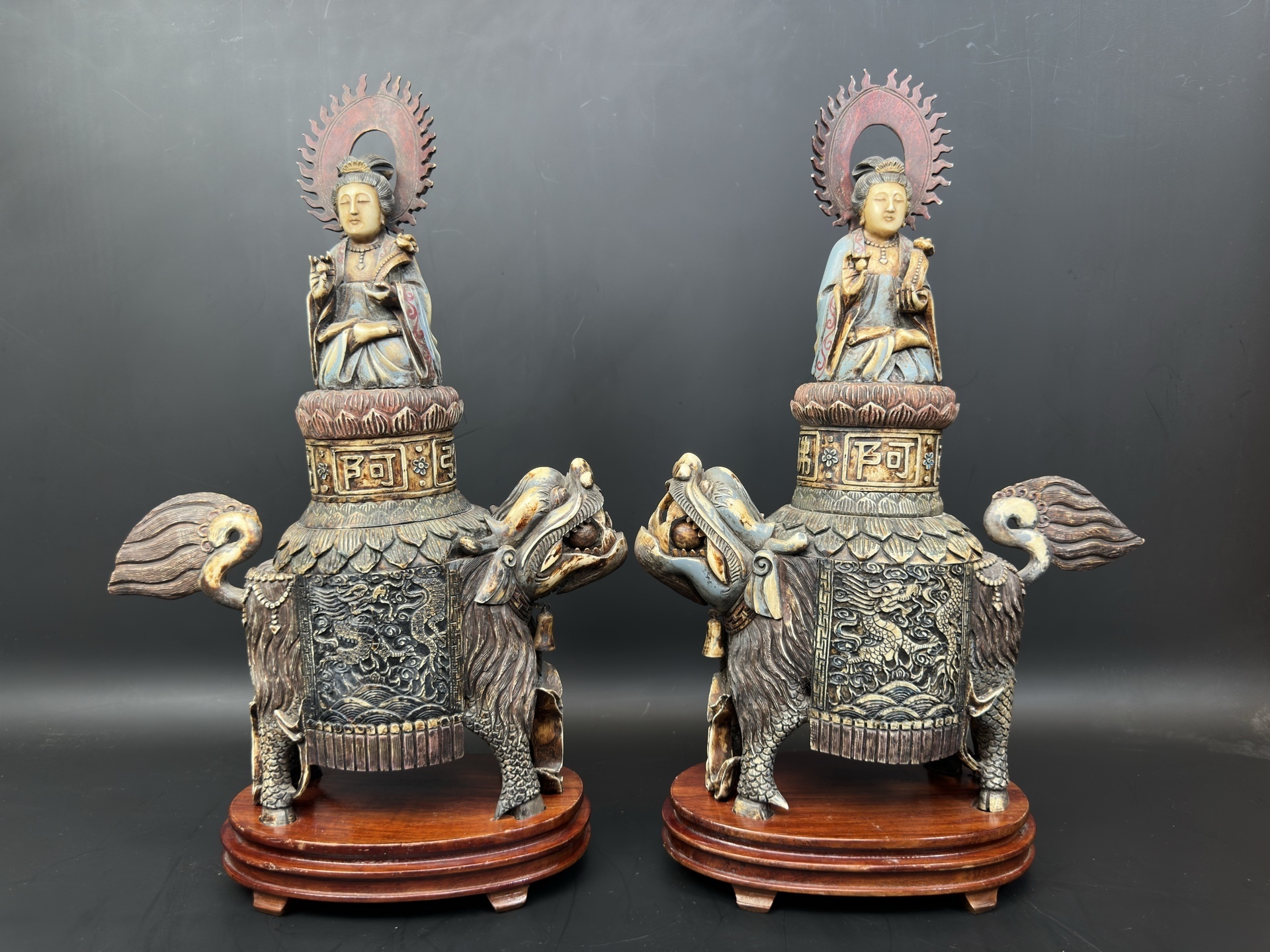 Парные фигуры из кости — Гуань Инь верхом на Цилинь
