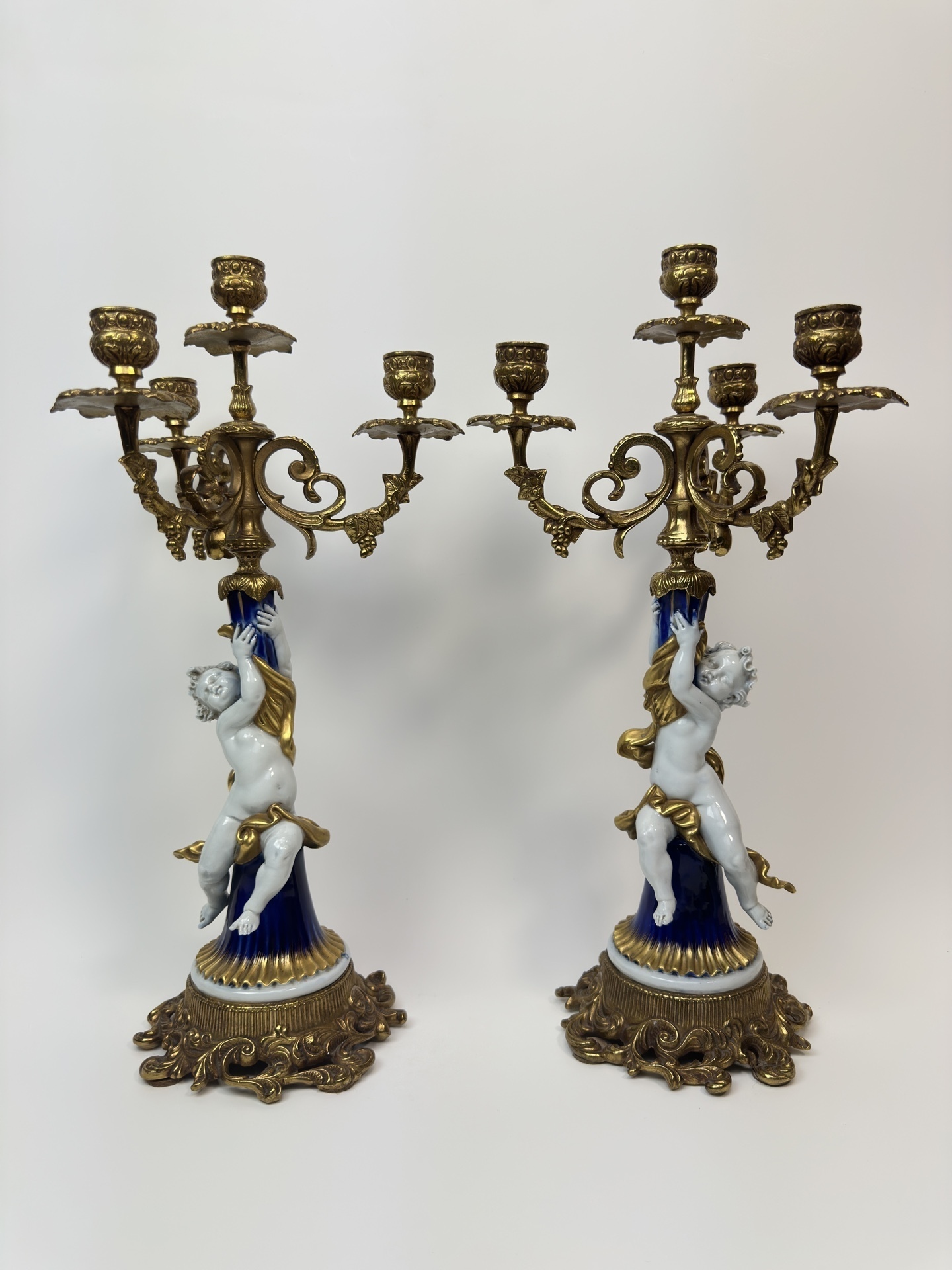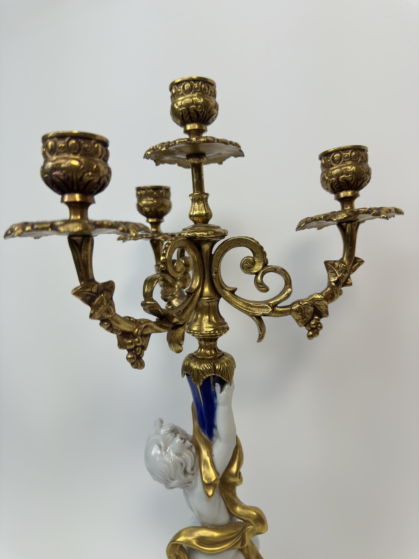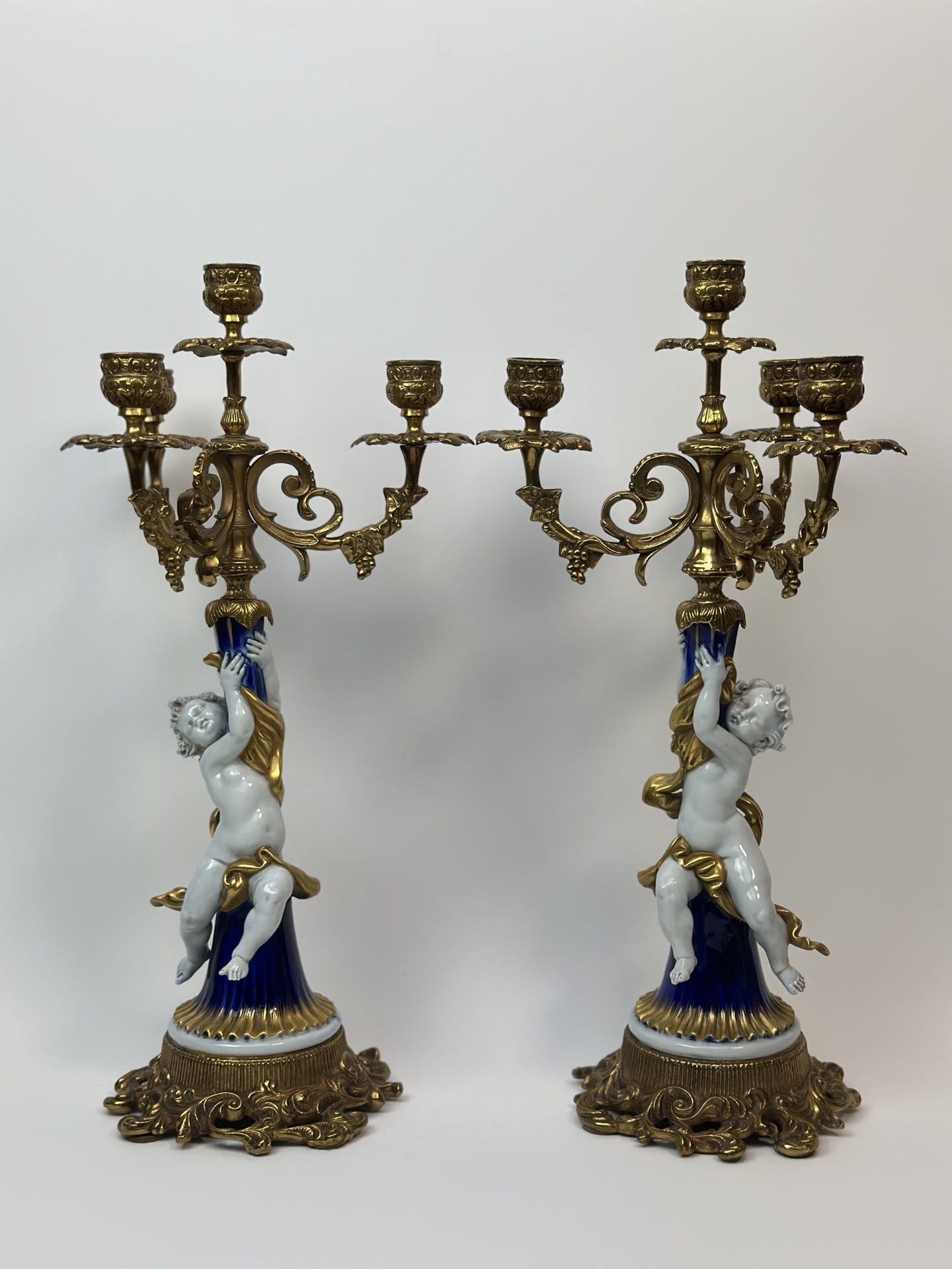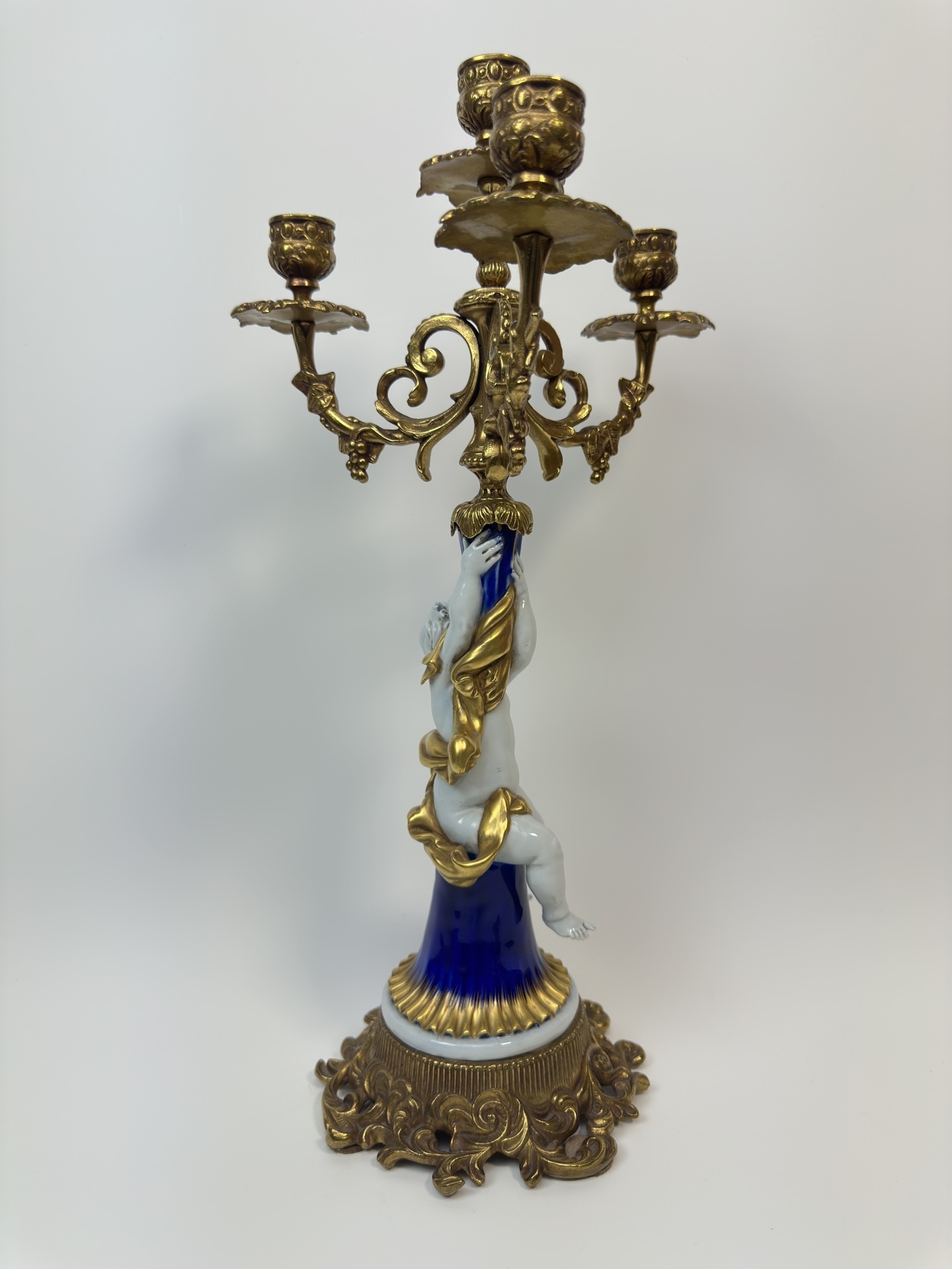 Центральным элементом дизайна являются искусно выполненные фарфоровые фигуры путти, обвивающие колонну канделябра, добавляя изделиям игривости и утонченности.