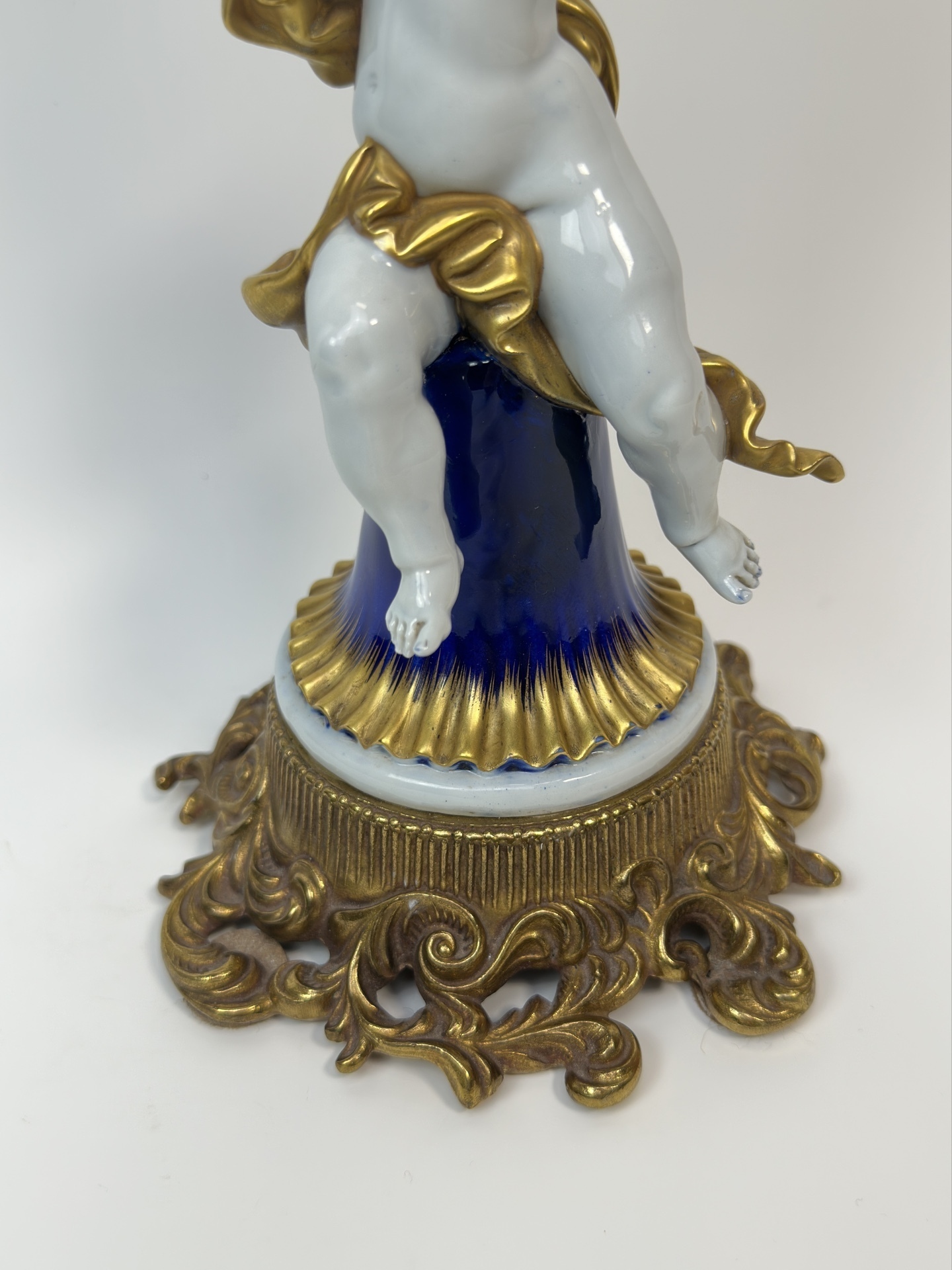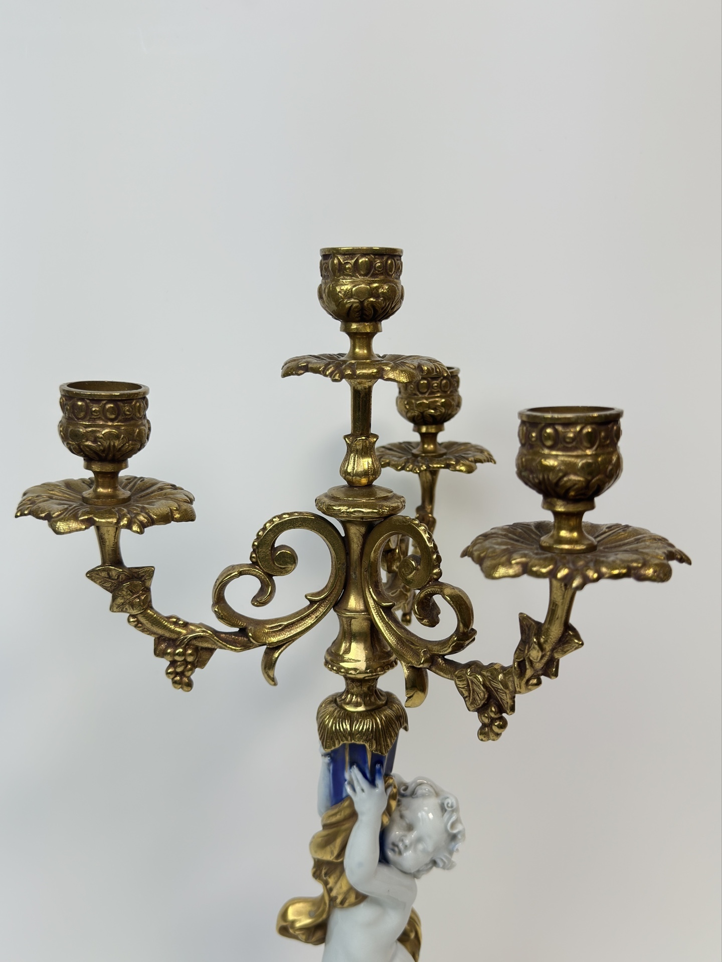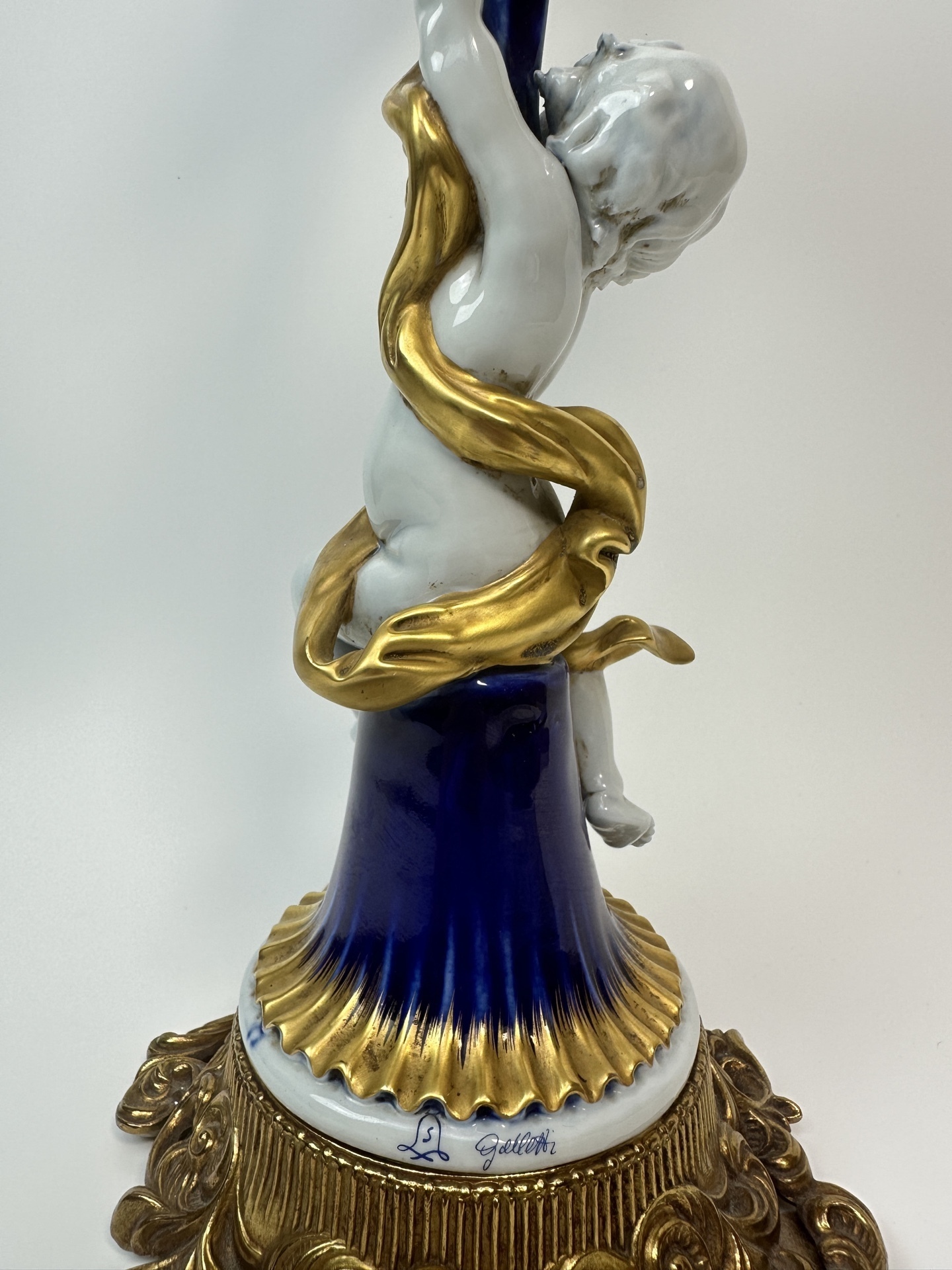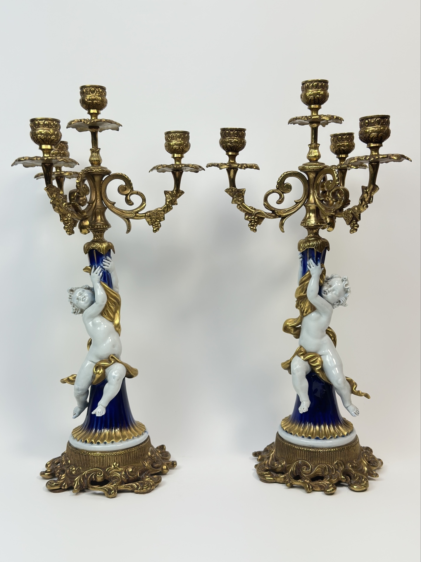 Центральным элементом дизайна являются искусно выполненные фарфоровые фигуры путти, обвивающие колонну канделябра, добавляя изделиям игривости и утонченности.