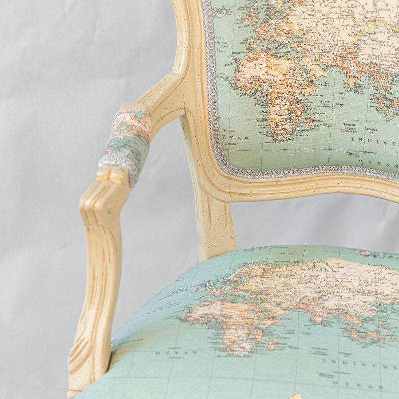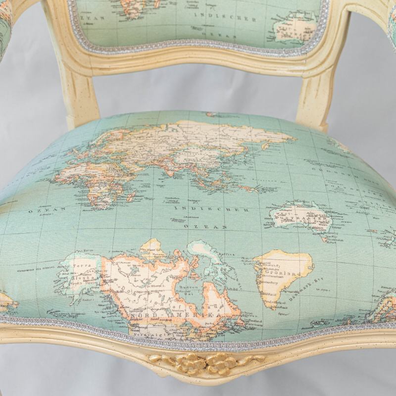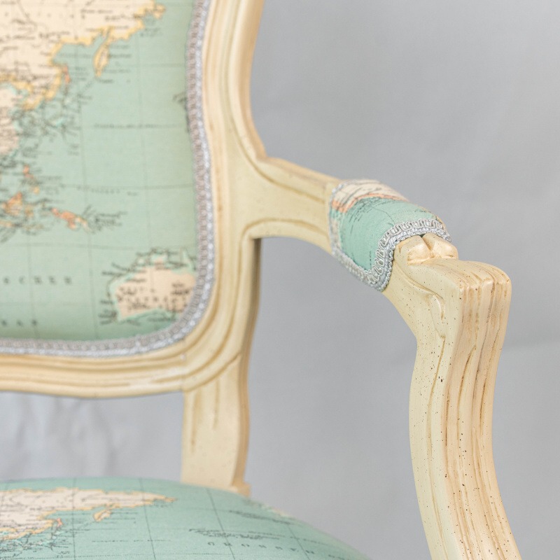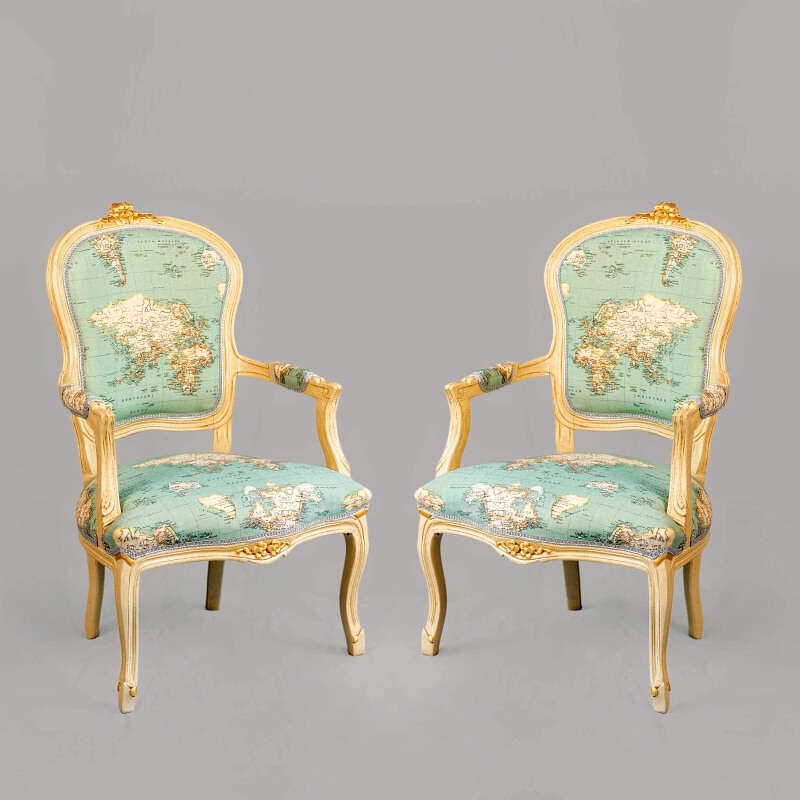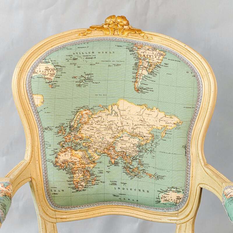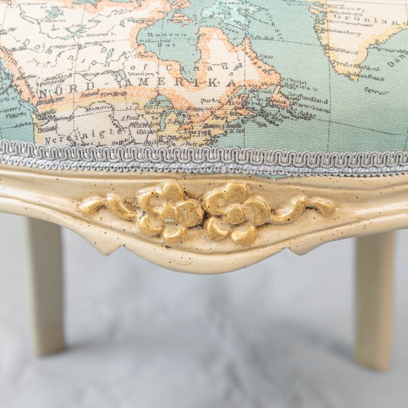 Материал: Дерево, ручная резьба. Цвет - слоновая кость с позолотой и патиной. Обиты испанской дорогой тканью в виде карты Мира. Очень хорошее состояние.