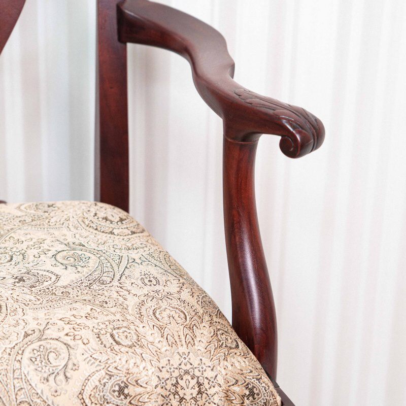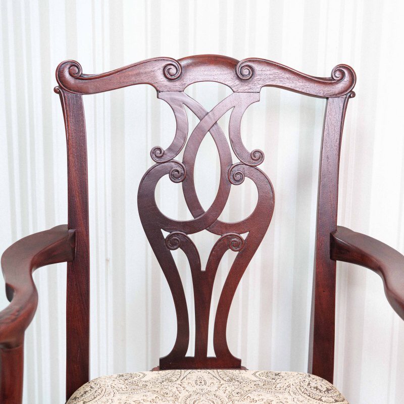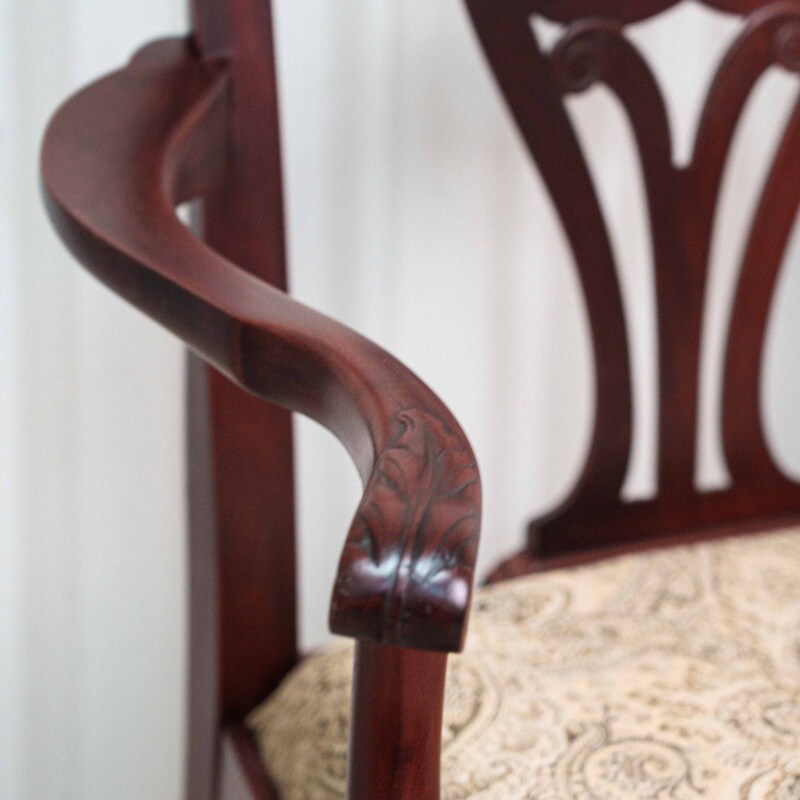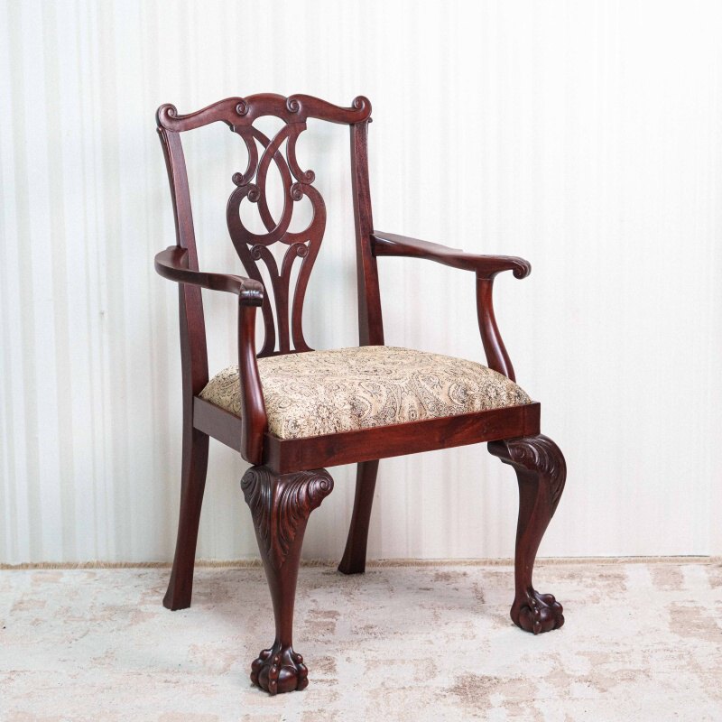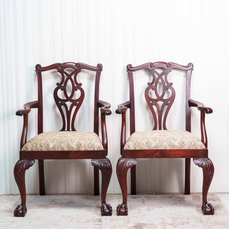 Эта пара антикварных кресел представляет собой классический образец мебельного искусства в стиле Чиппендейл, отличающийся изысканностью линий и виртуозной резьбой по дереву. Основой конструкции служит массив темного благородного дерева с глубоким красноватым оттенком, что подчеркивает статусность предметов.