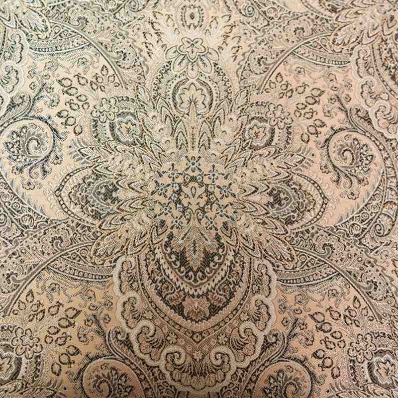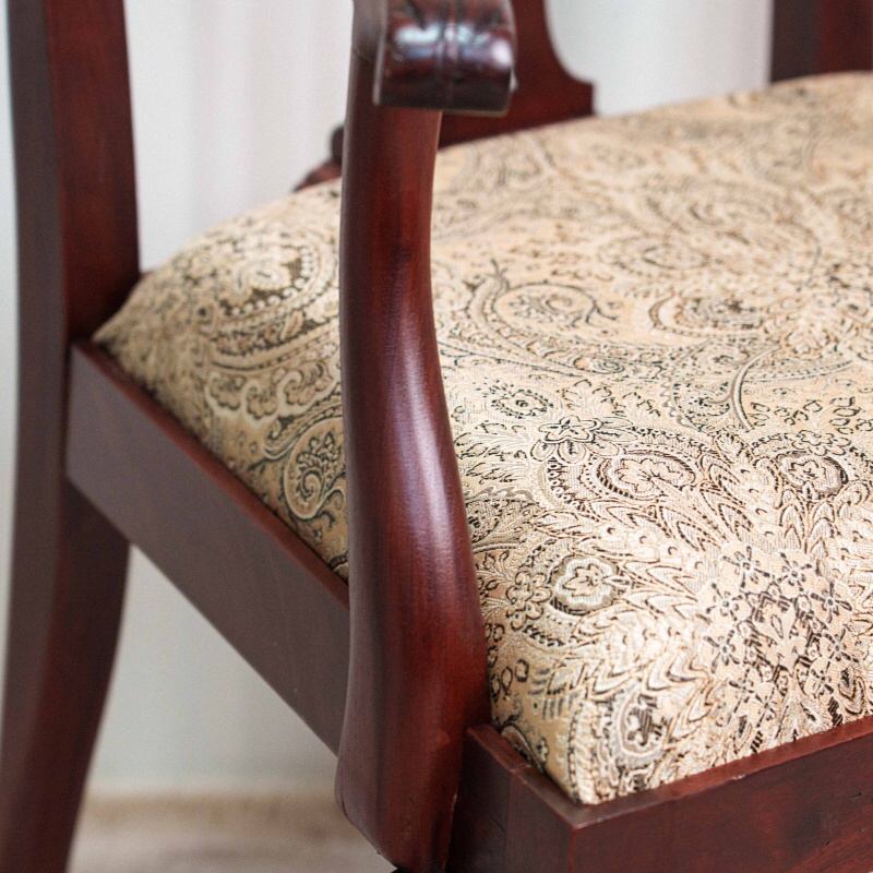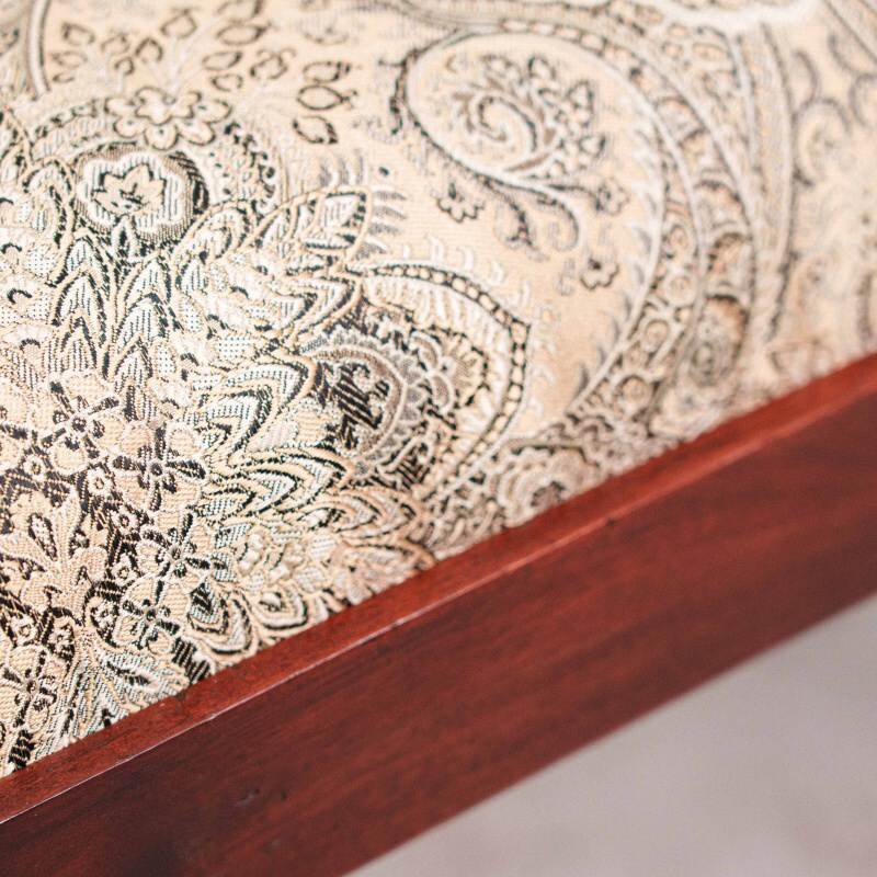 Трапециевидные сиденья обиты плотной жаккардовой тканью со спокойным растительным орнаментом в светлых бежевых тонах, который гармонично контрастирует с темным каркасом.