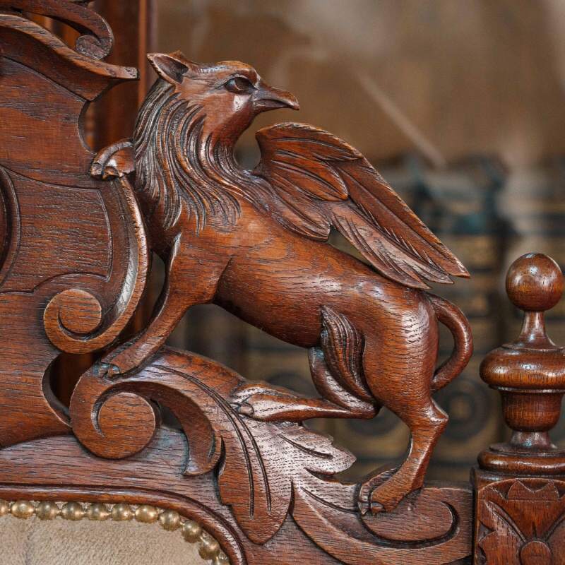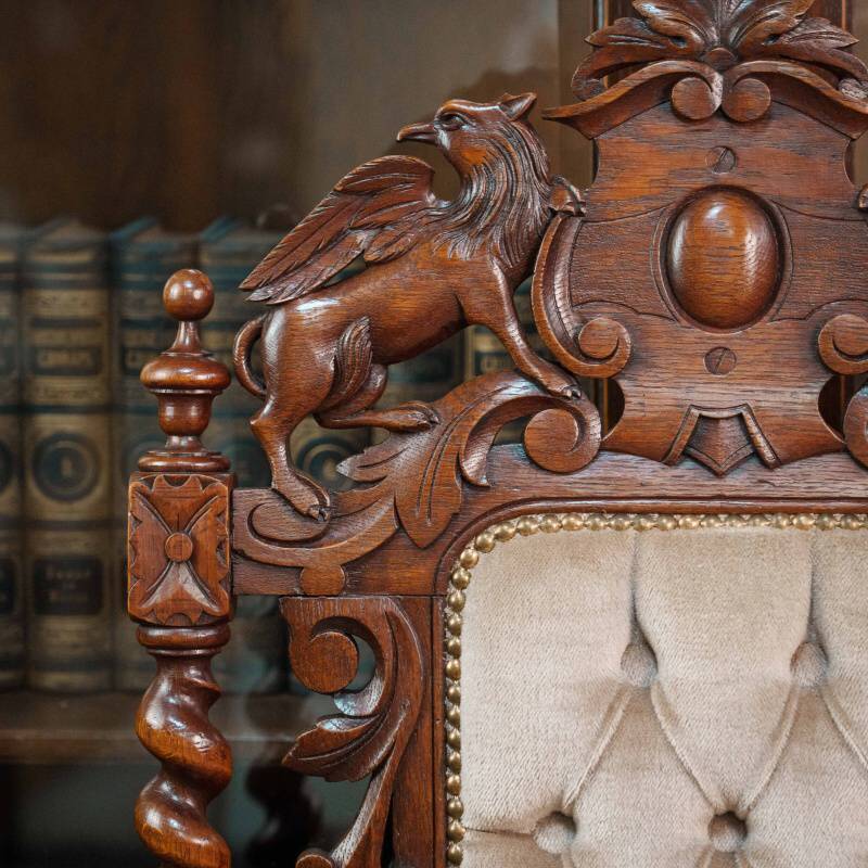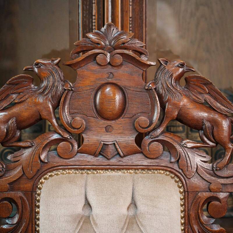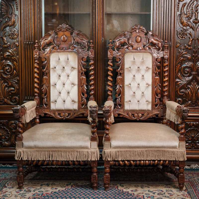 Антикварные парные кресла представляют собой великолепный образец европейского мебельного искусства конца XIX — начала XX века, созданный в лучших традициях ренессансного стиля. Конструкция выполнена из массива тёмного дерева — прочного и благородного, с глубоким оттенком и тонкой полировкой, подчёркивающей фактуру древесины. Каждое кресло поражает богатством резного декора и монументальностью формы, олицетворяя величие и торжественность классических интерьеров.