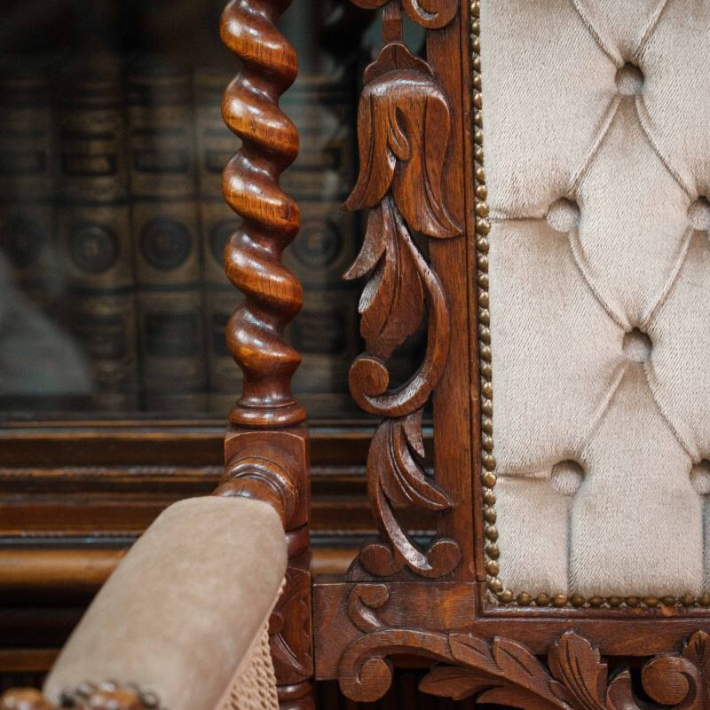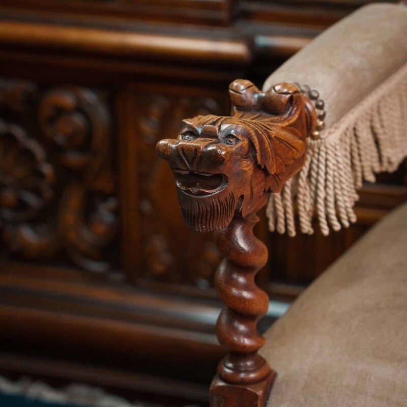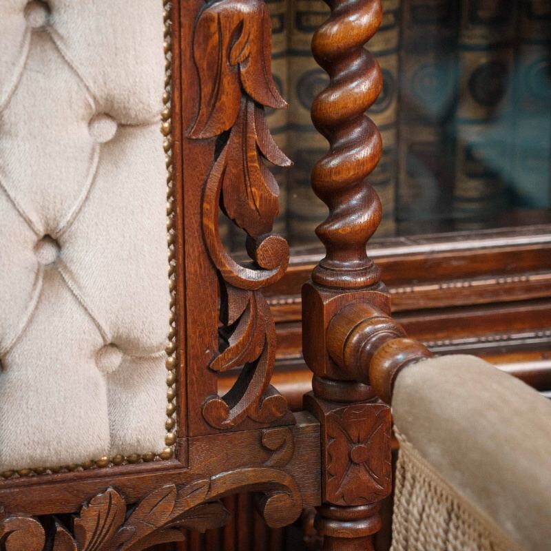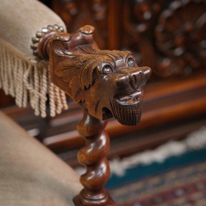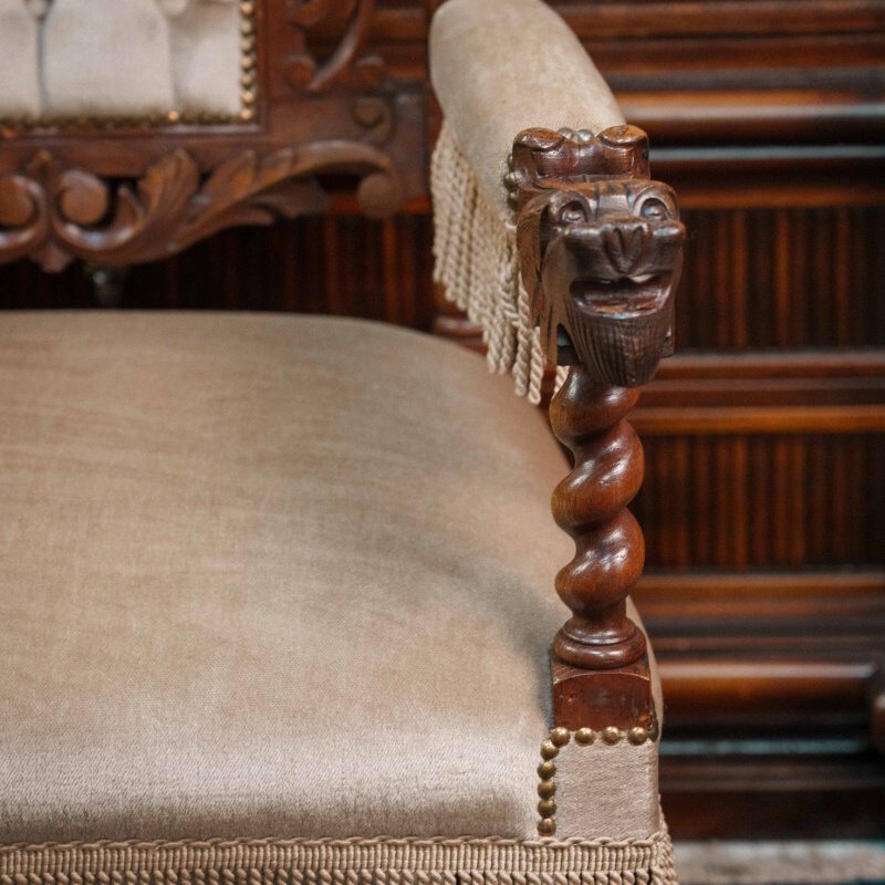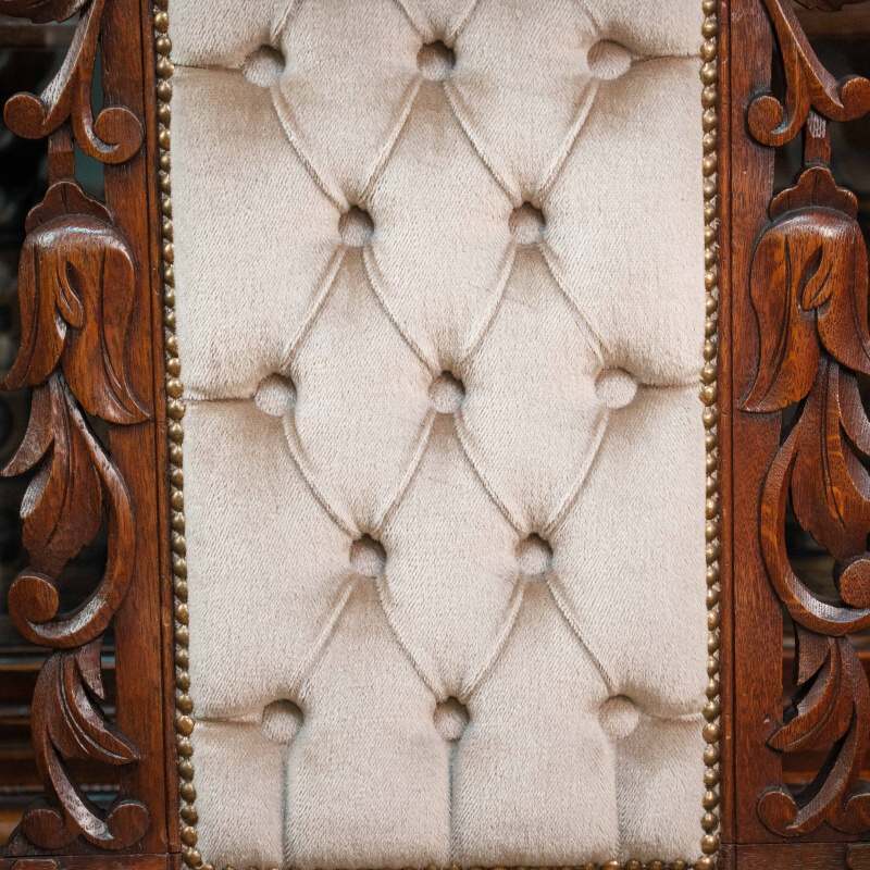 Высокие спинки украшены сложной резьбой ручной работы: в верхней части размещён картуш с симметричными завитками и изображением геральдических львов — символов силы и достоинства. Боковые стойки оформлены в виде массивных колонн с витой спиральной формой, характерной для барочной мебели. Центральная часть спинки обтянута тканью благородного бежевого оттенка, декорированной каретной стяжкой с пуговицами, что придаёт изделию мягкость и визуальную глубину.