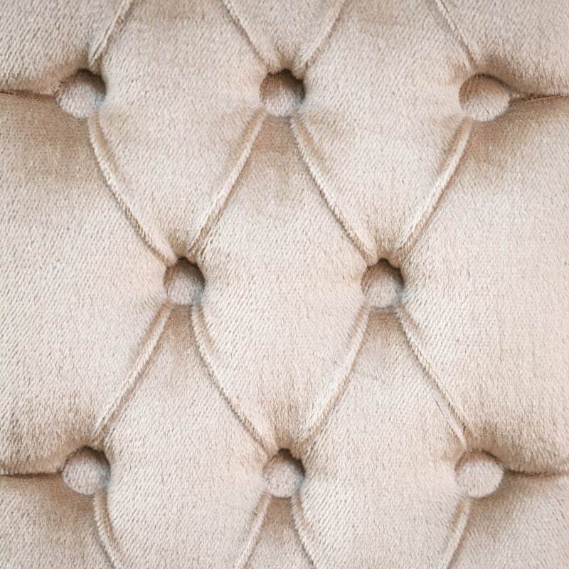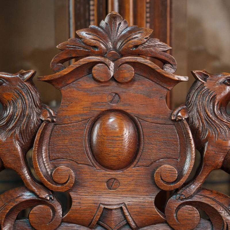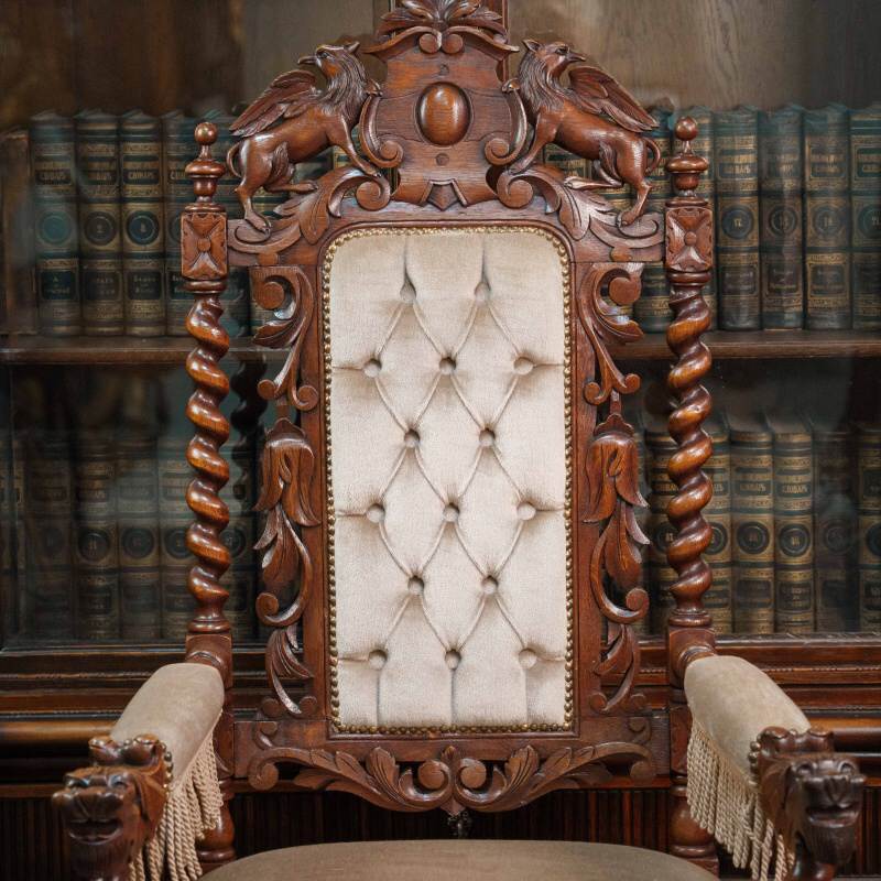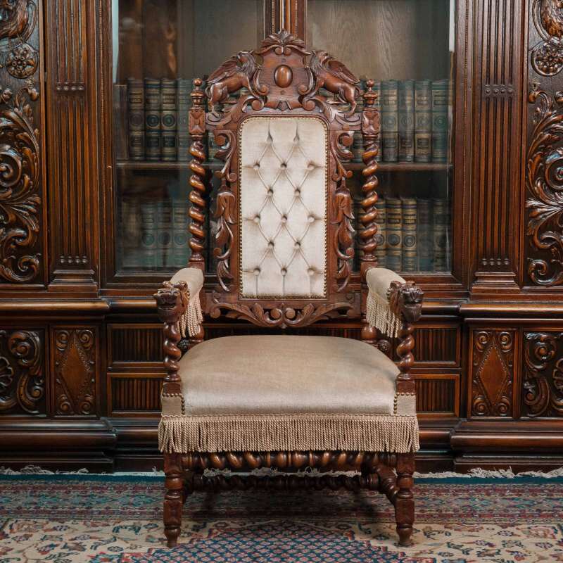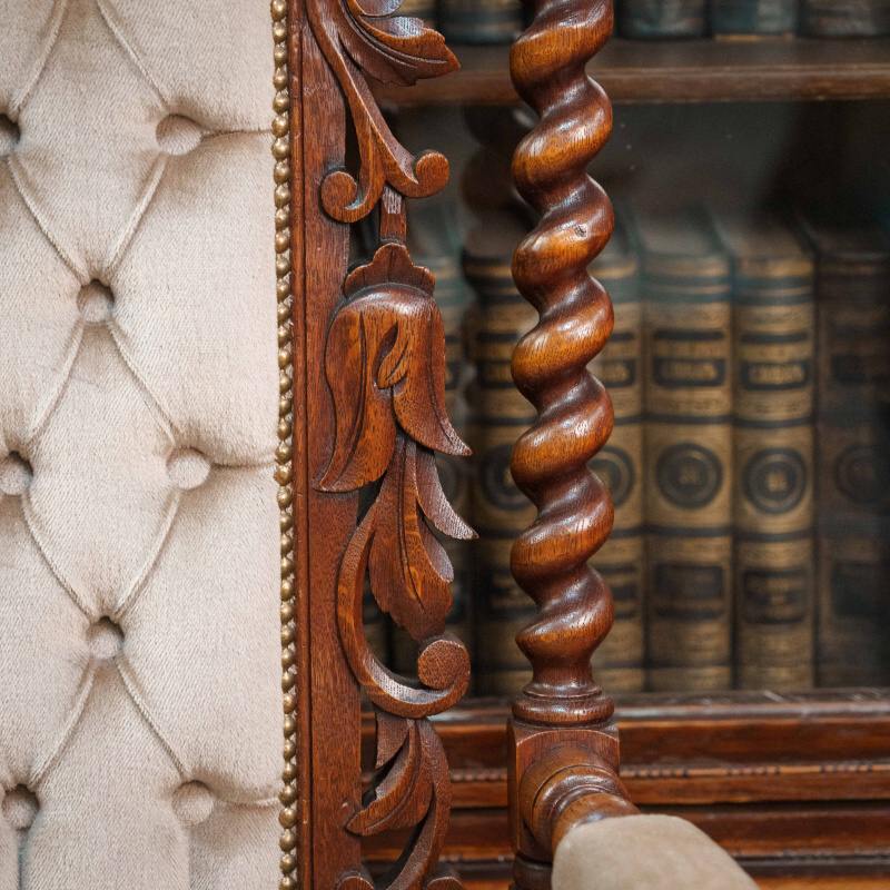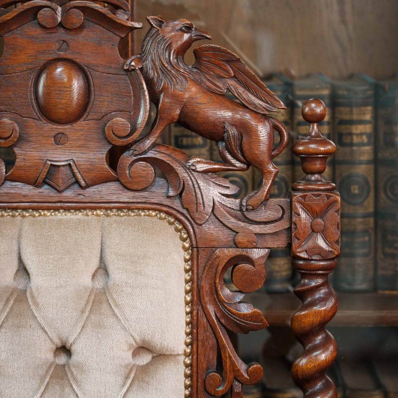 Высокие спинки украшены сложной резьбой ручной работы: в верхней части размещён картуш с симметричными завитками и изображением геральдических львов — символов силы и достоинства. Боковые стойки оформлены в виде массивных колонн с витой спиральной формой, характерной для барочной мебели. Центральная часть спинки обтянута тканью благородного бежевого оттенка, декорированной каретной стяжкой с пуговицами, что придаёт изделию мягкость и визуальную глубину.