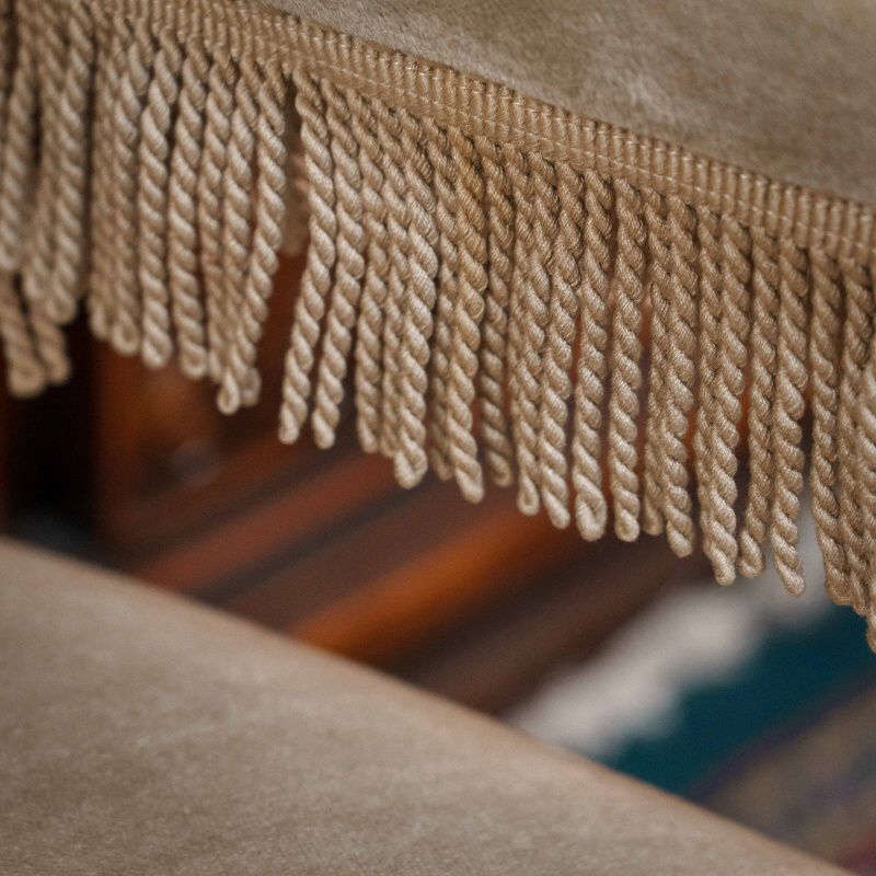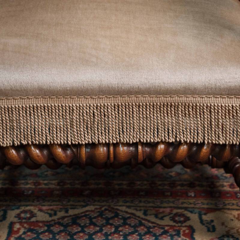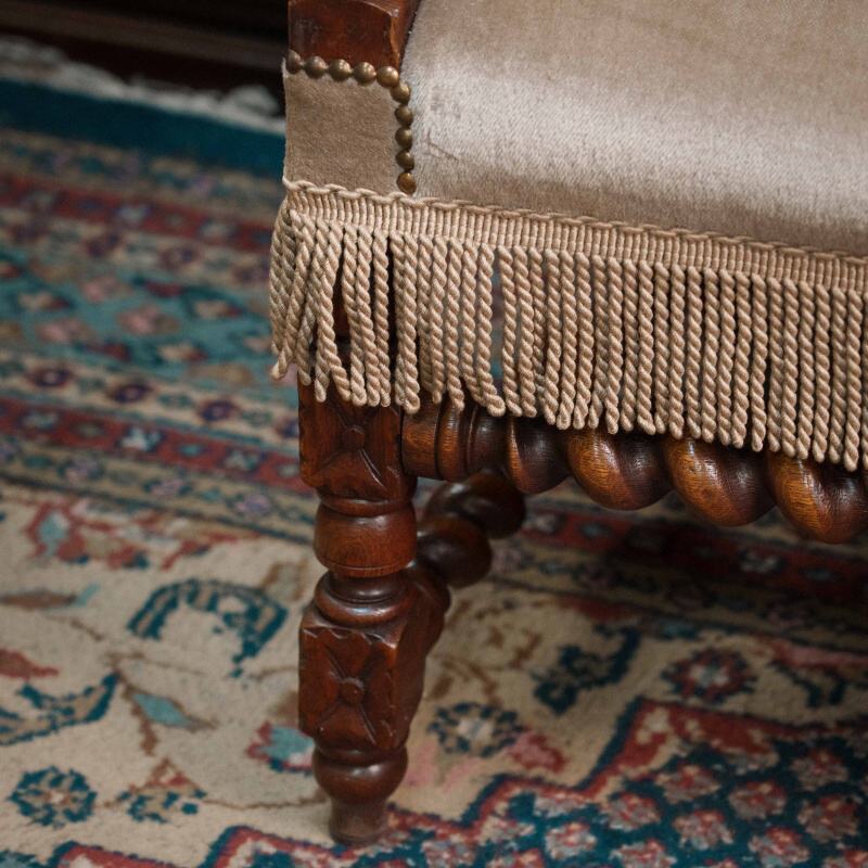 Подлокотники и сиденья также обиты тканью в тон спинки, а по краю сидений проходит декоративная бахрома, добавляющая ансамблю изысканности и завершённости. Ножки кресел — точёные, прочные, соединённые резными перекладинами, что усиливает устойчивость конструкции и подчёркивает внимание мастера к каждой детали.