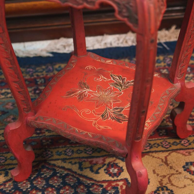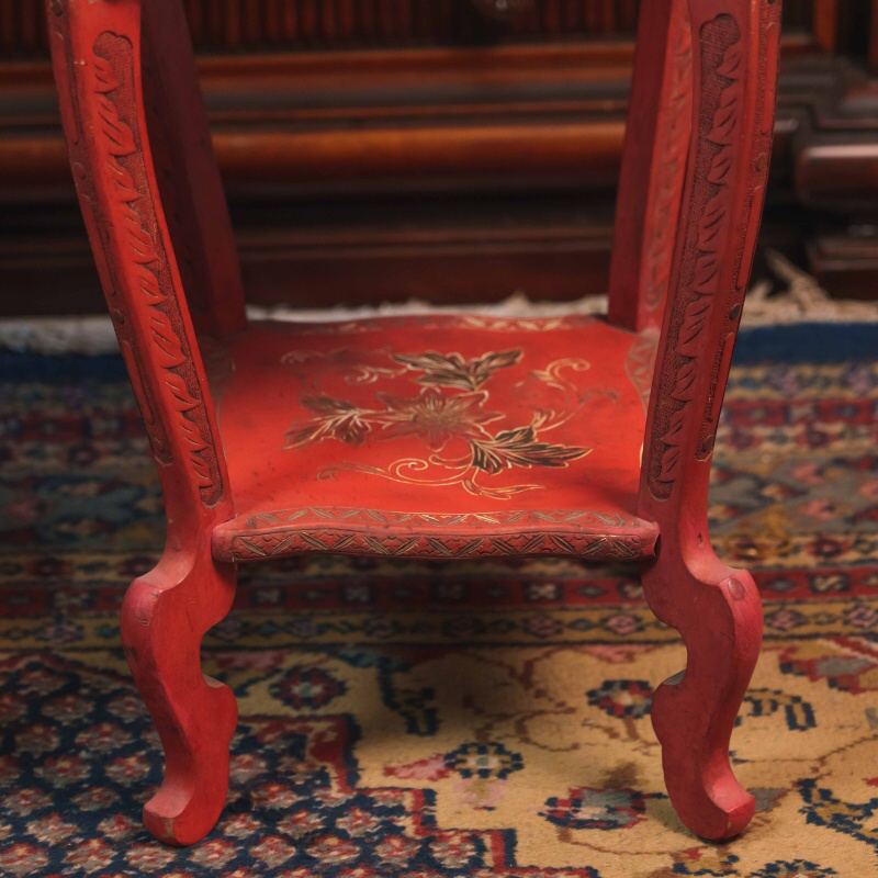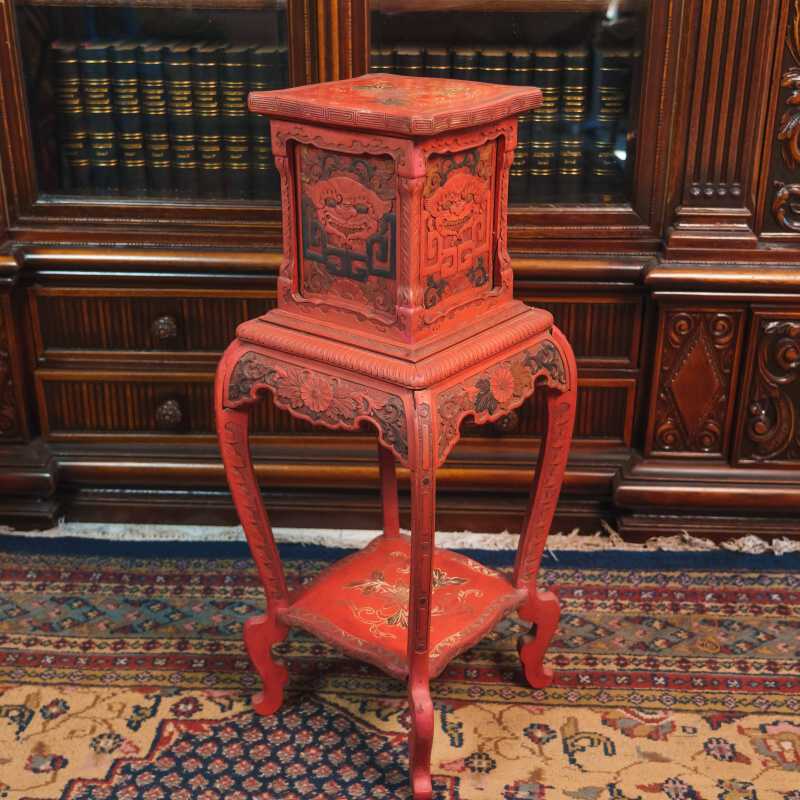 Эти парные антикварные подставки — подлинное воплощение восточной экзотики, выполненное в традиционной технике китайского резного лака (цинций). Это редкие и невероятно декоративные предметы, которые в XIX веке служили для украшения парадных залов, удерживая на себе драгоценный фарфор, нефритовые вазы или храмовые статуэтки.