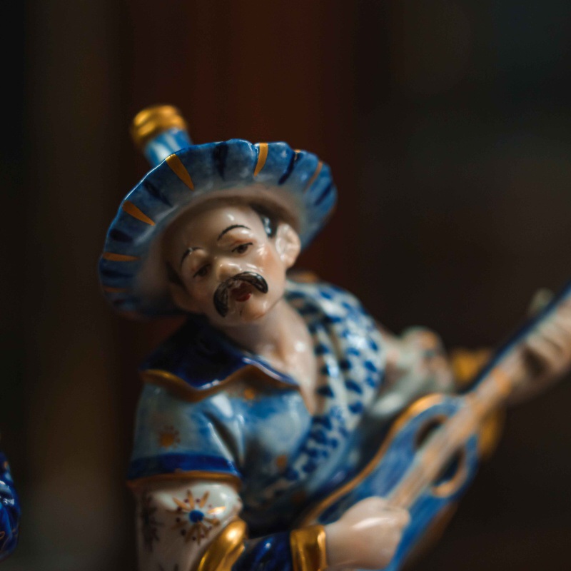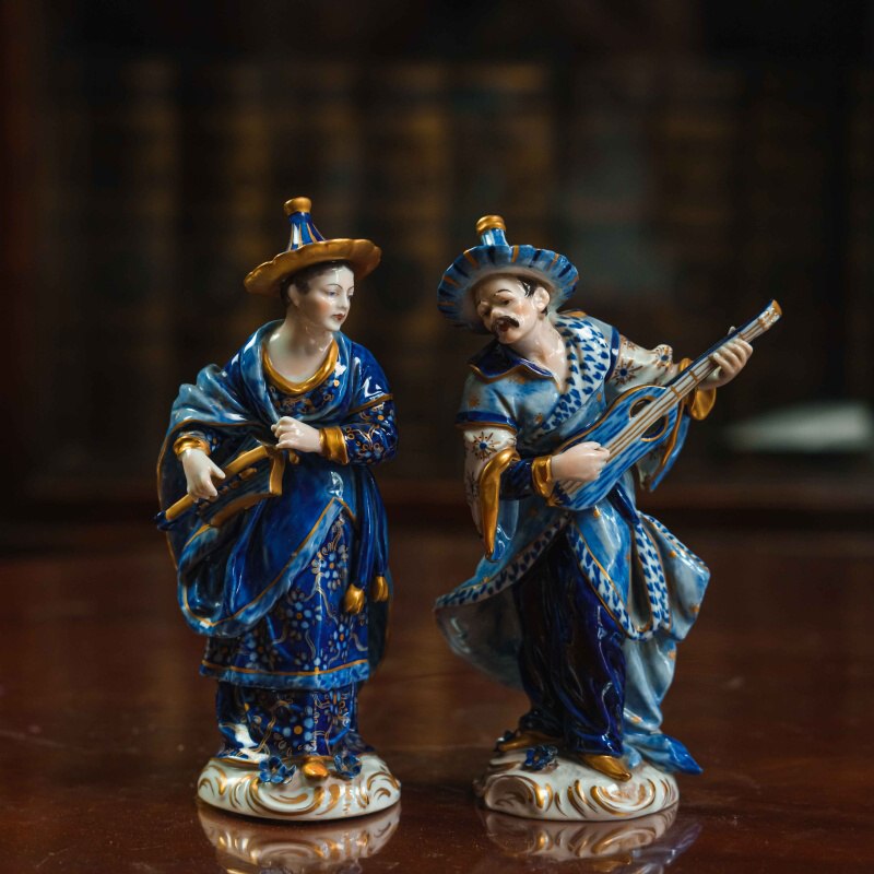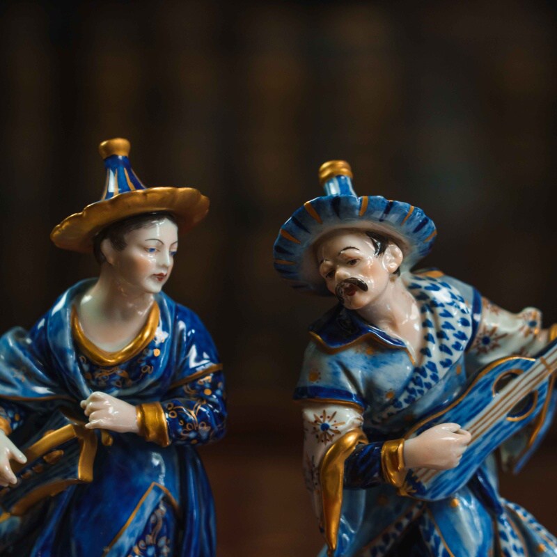 Фигуры изображают малабара и малабарку в традиционных одеждах с музыкальными инструментами.