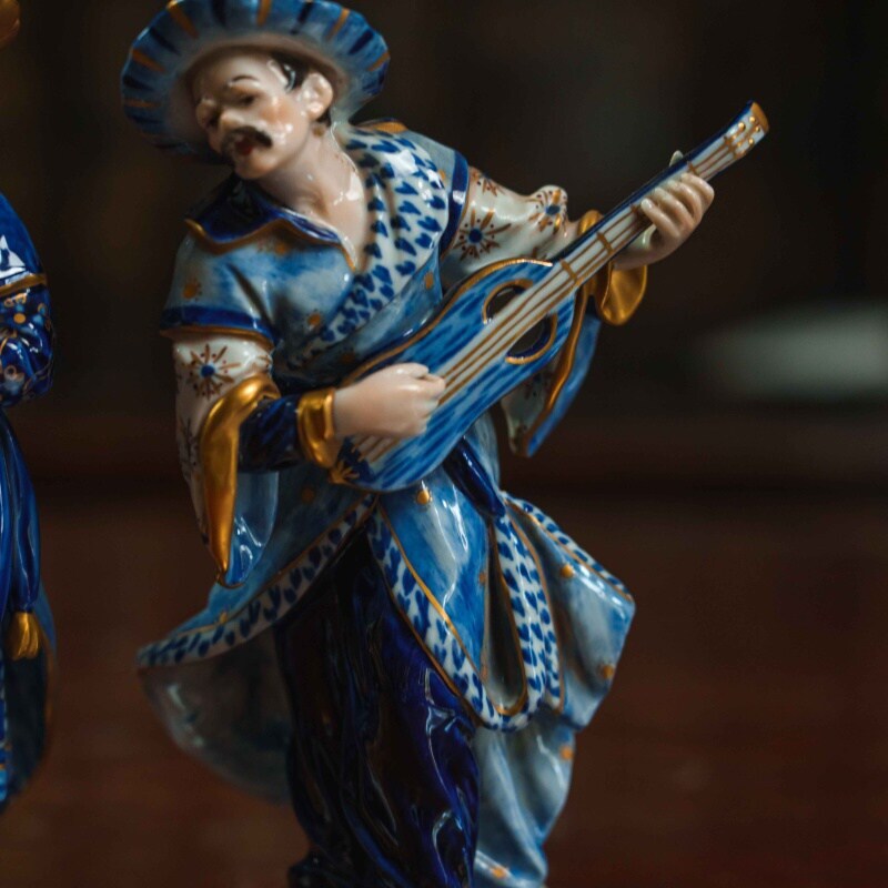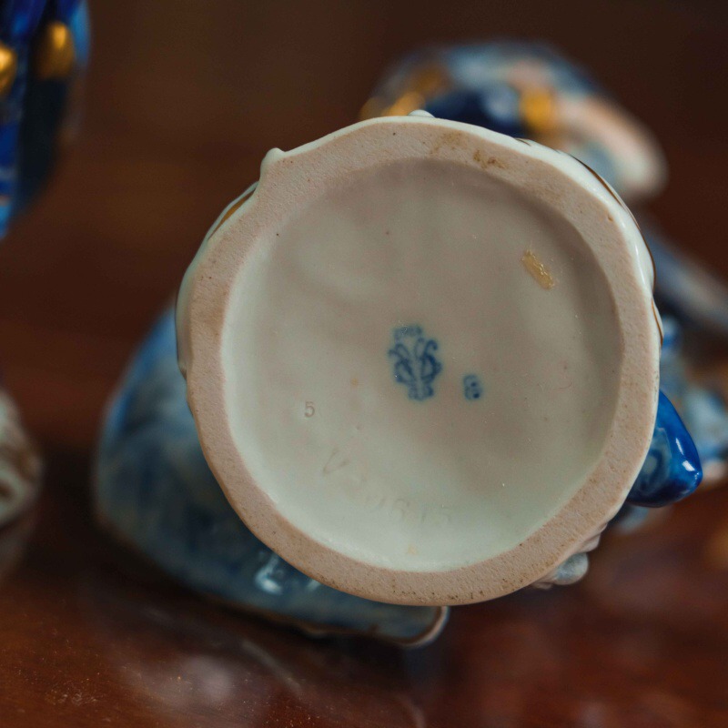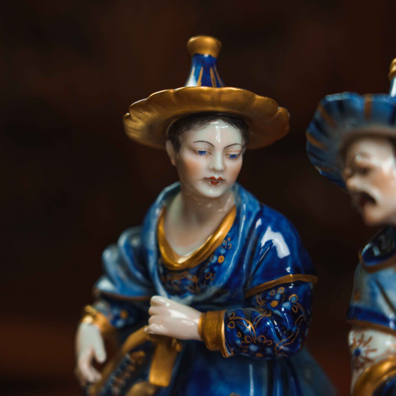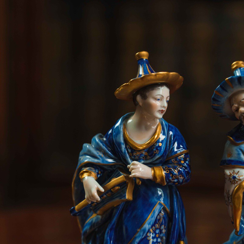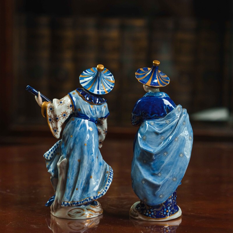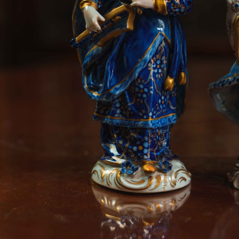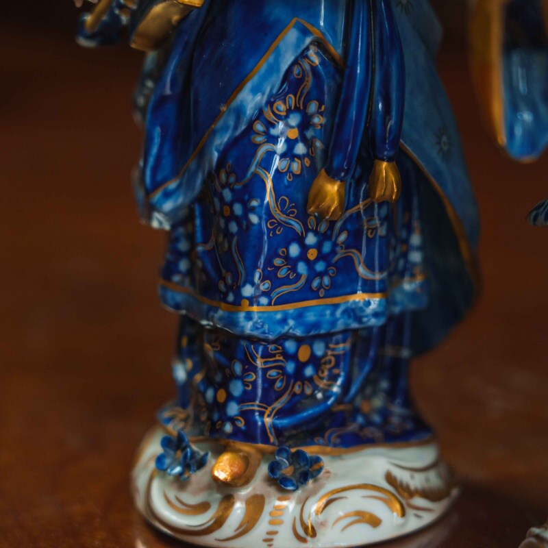 Каждая деталь подчеркивает мастерство художников Aelteste Volkstedt: изысканные складки одежды, тщательно прорисованные лица, декоративные элементы и яркая цветовая гамма с контрастом синего, белого и золотого создают ощущение торжественности и утончённости.
