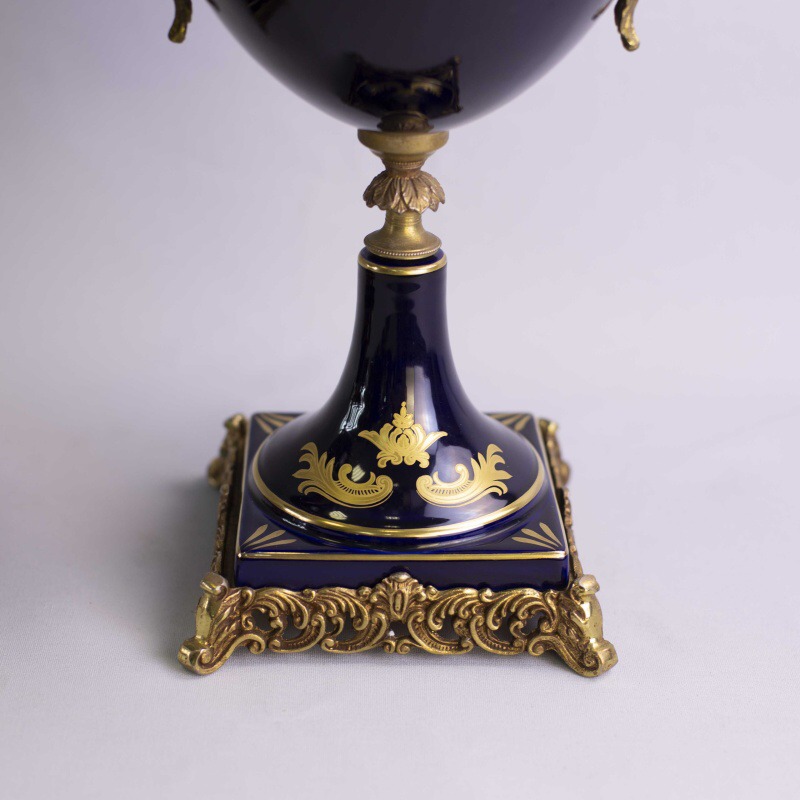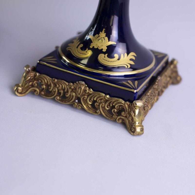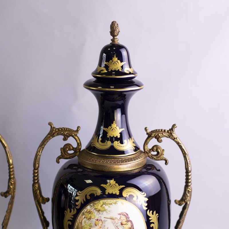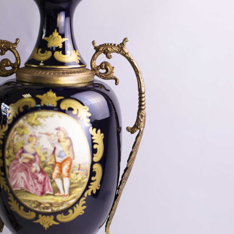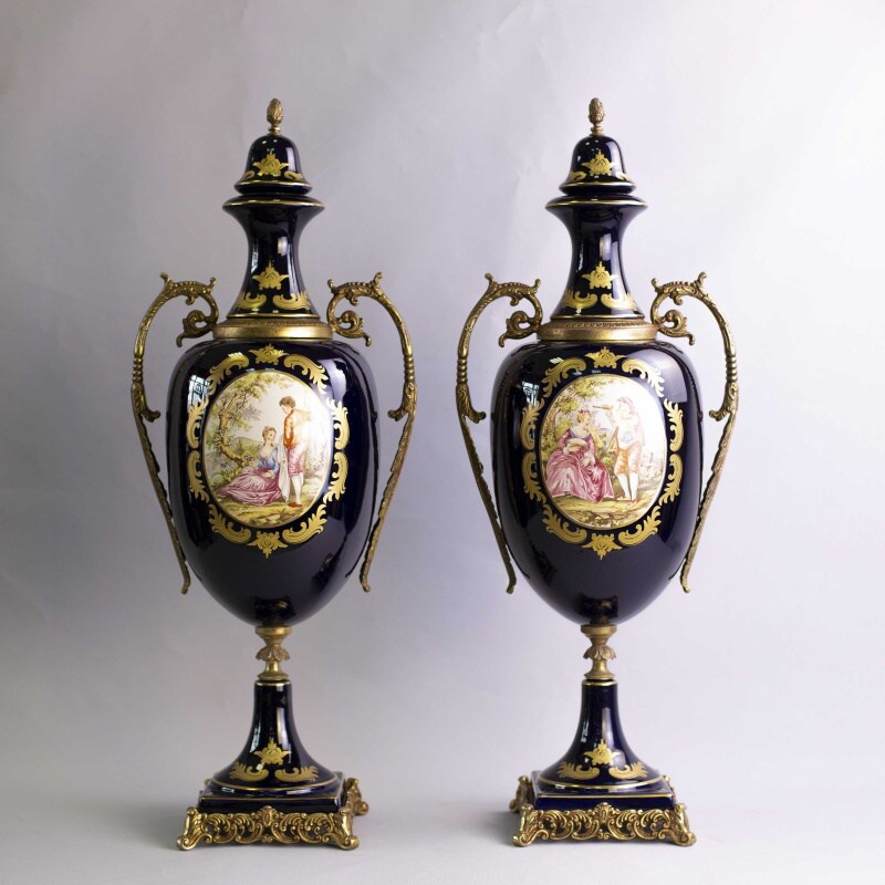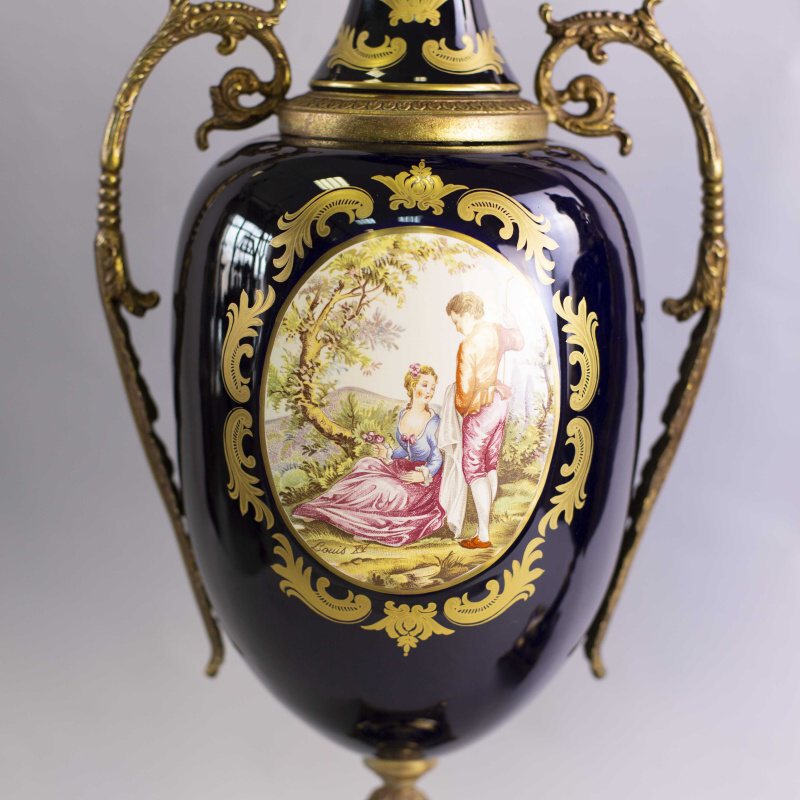 Пара изящных ваз в дворцовом стиле. Основной фон предметов представлен глубоким темным цветом синего кобальта, насыщенность которого великолепно подчеркнута позолотой. Центральные части ваз украшены живописными композициями с галантными сценами.