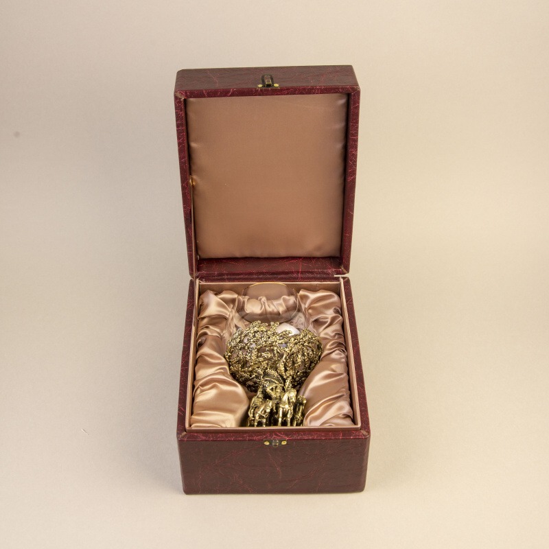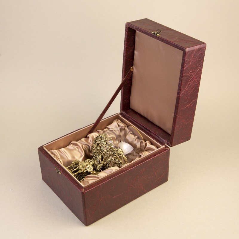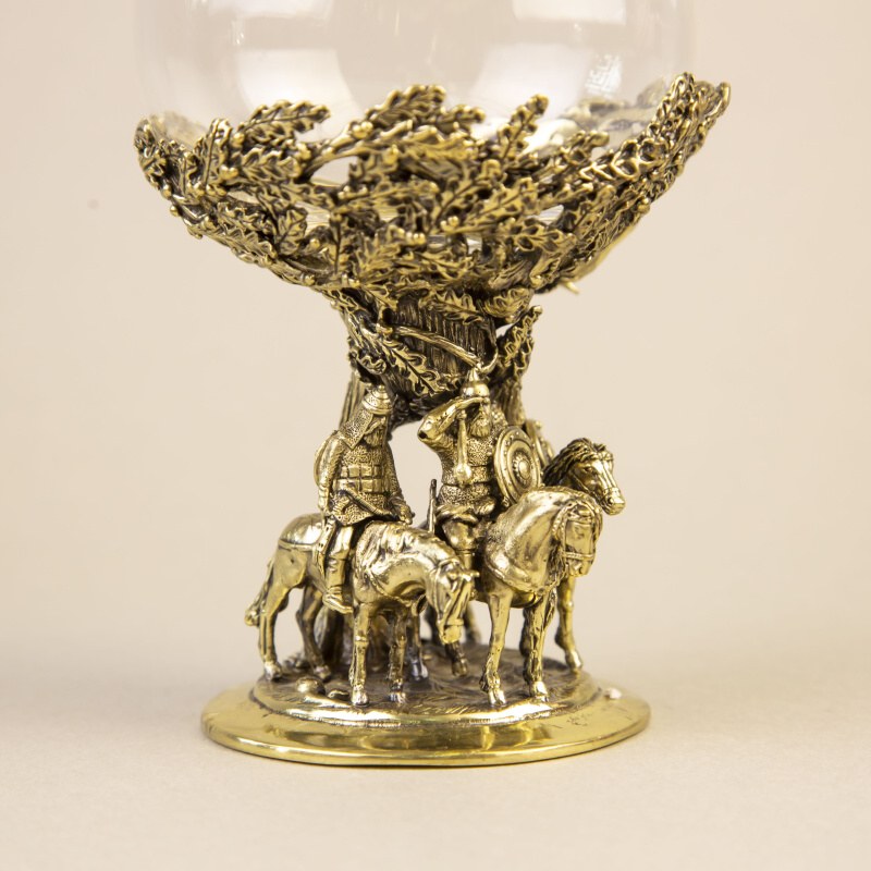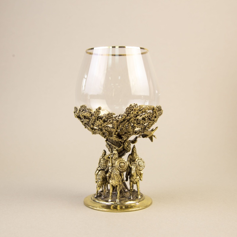 Материал: Выполнен в виде старинного кубка с массивным бронзовым литьем и тонким стеклом с золотым ободком.