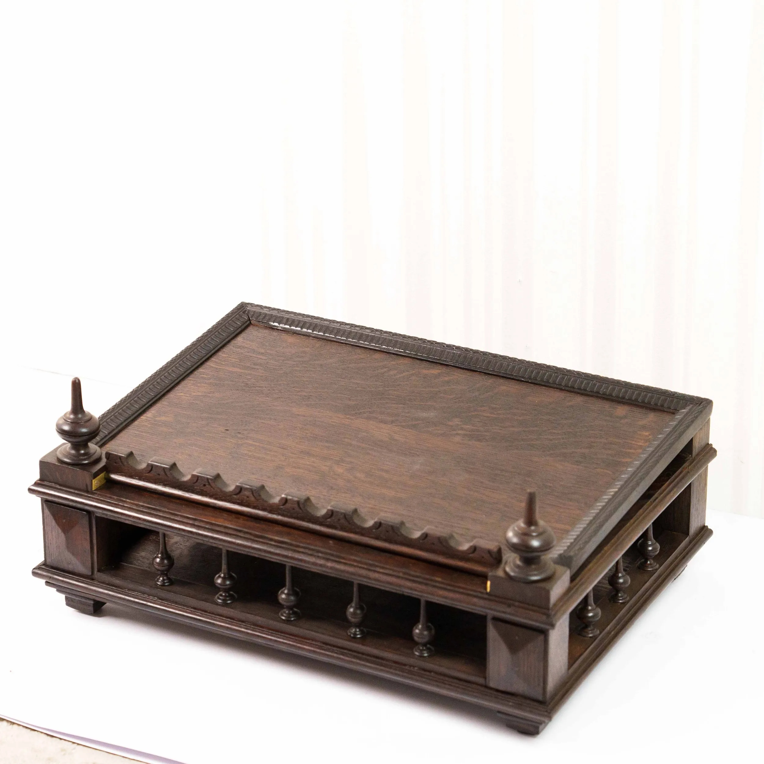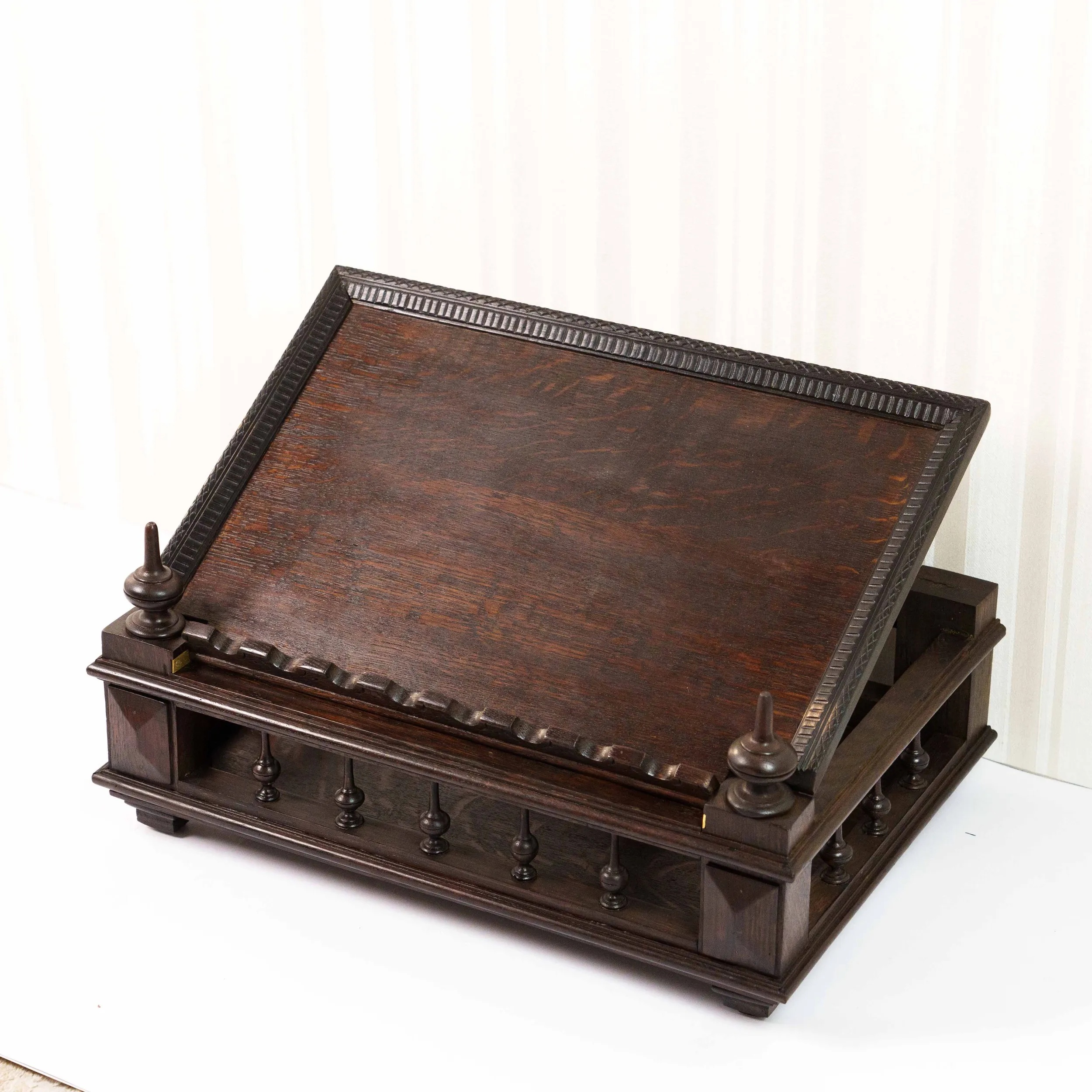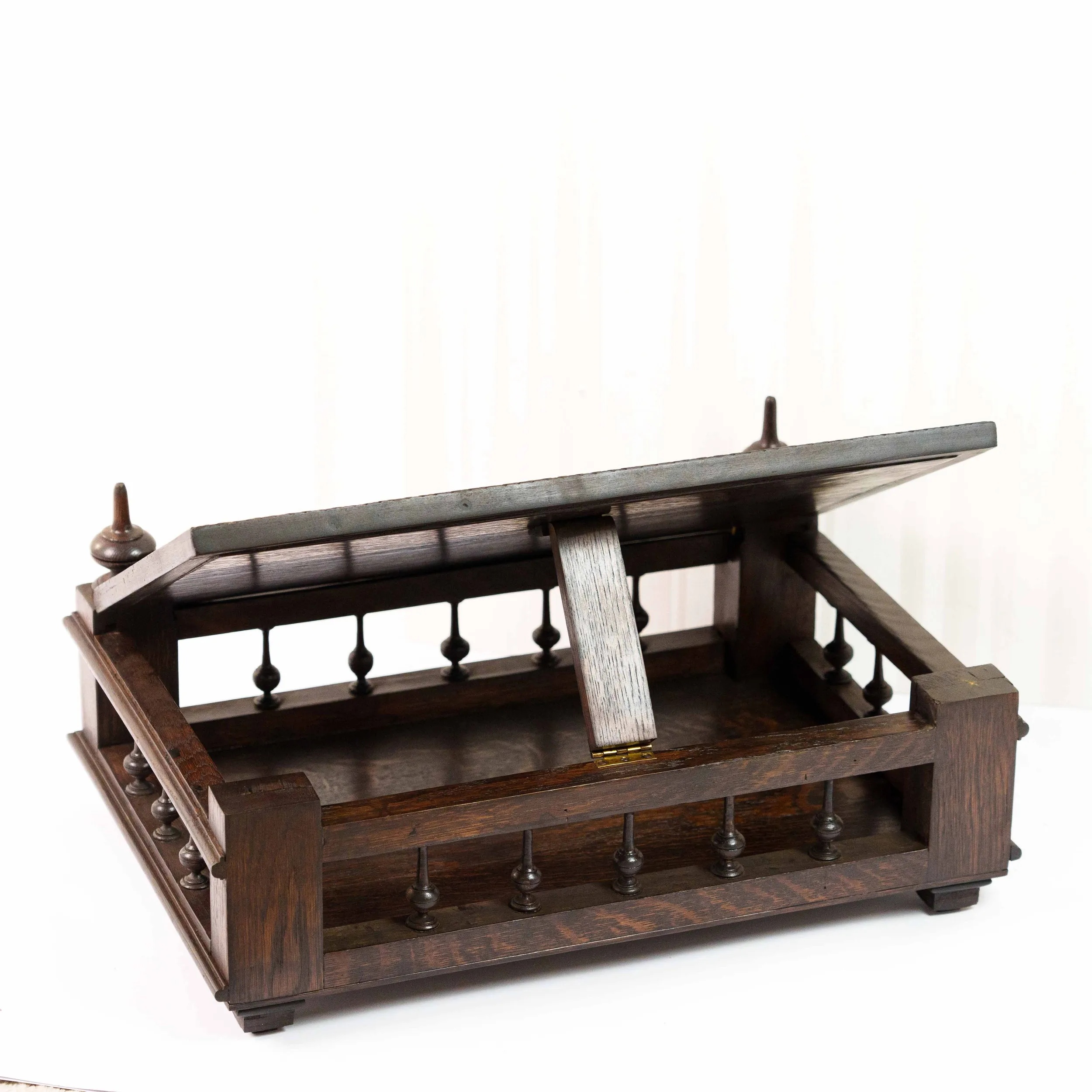 Перед вами изящная антикварная подставка для книги, исполненная с тонким чувством меры и благородной простоты. Её корпус выполнен из тёмного дерева с насыщенной, глубокой текстурой, в которой угадываются естественные волны древесного рисунка, словно застывшее движение времени. Откидная спинка украшена аккуратной резьбой по верхнему краю, придающей предмету лёгкую декоративность без излишней вычурности. Небольшие точёные навершия по бокам добавляют композиции завершённости и подчёркивают симметрию формы. Нижняя часть оснащена рядом изящных упоров — они не только функциональны, удерживая книгу в раскрытом положении, но и создают ритмичный декоративный акцент. Основание подставки выглядит устойчивым и основательным: массивная платформа с мягко профилированными гранями и миниатюрными ножками придаёт предмету солидность и ощущение надёжности. Механические элементы — металлические фиксаторы — аккуратно встроены в конструкцию и свидетельствуют о продуманности и практичности изделия. Эта подставка словно создана для неспешного чтения в тишине кабинета: она несёт в себе атмосферу уюта, интеллигентности и уважения к книге как к ценности.