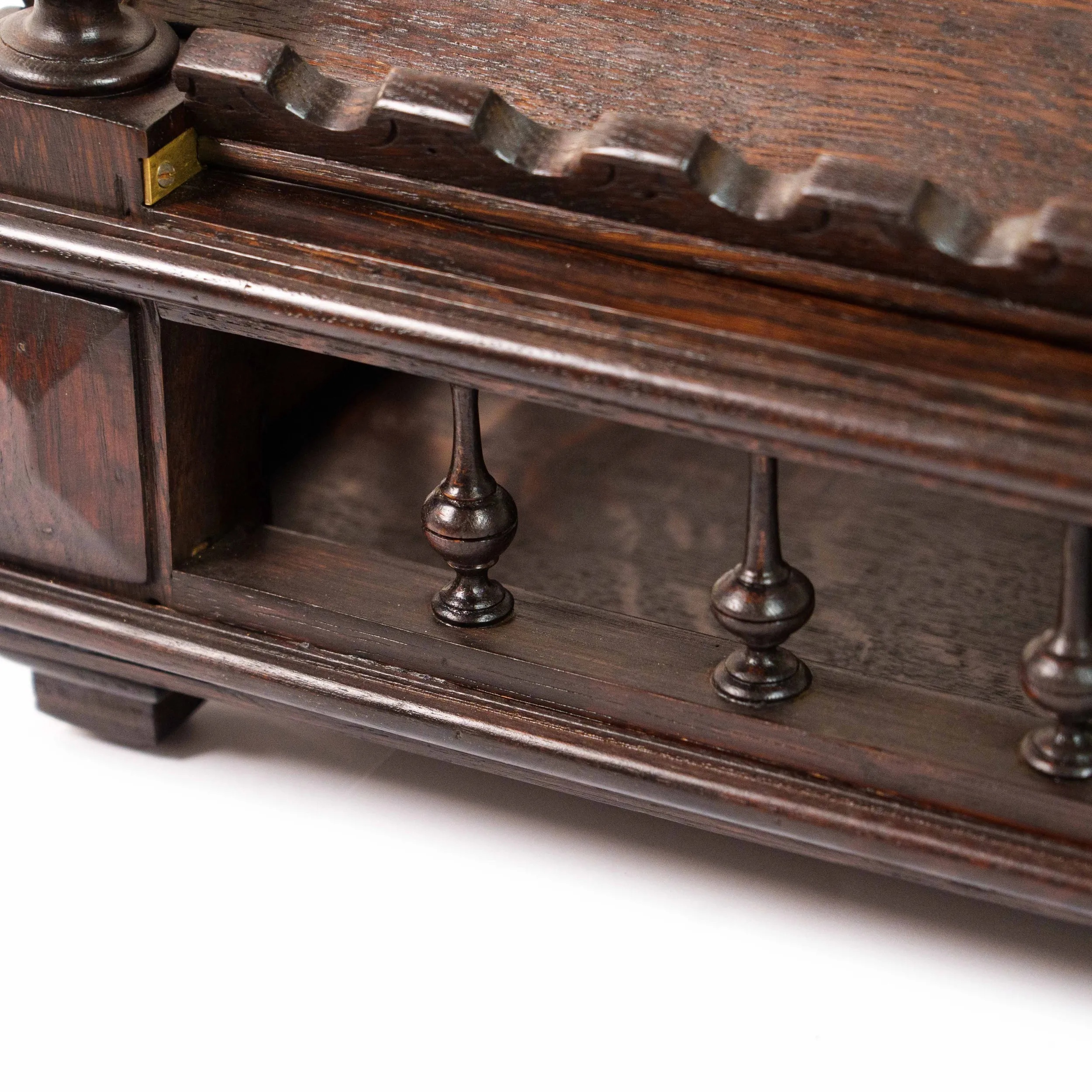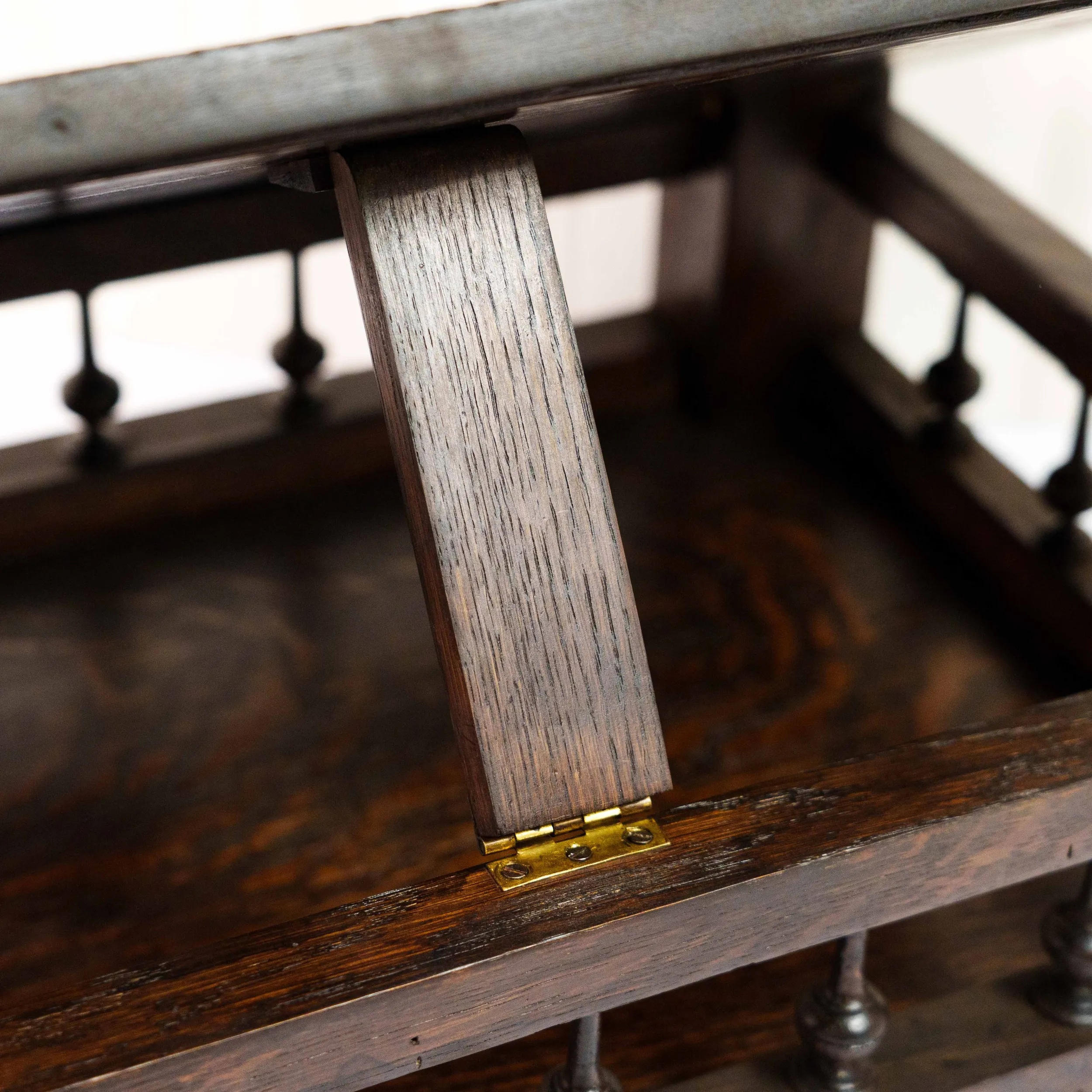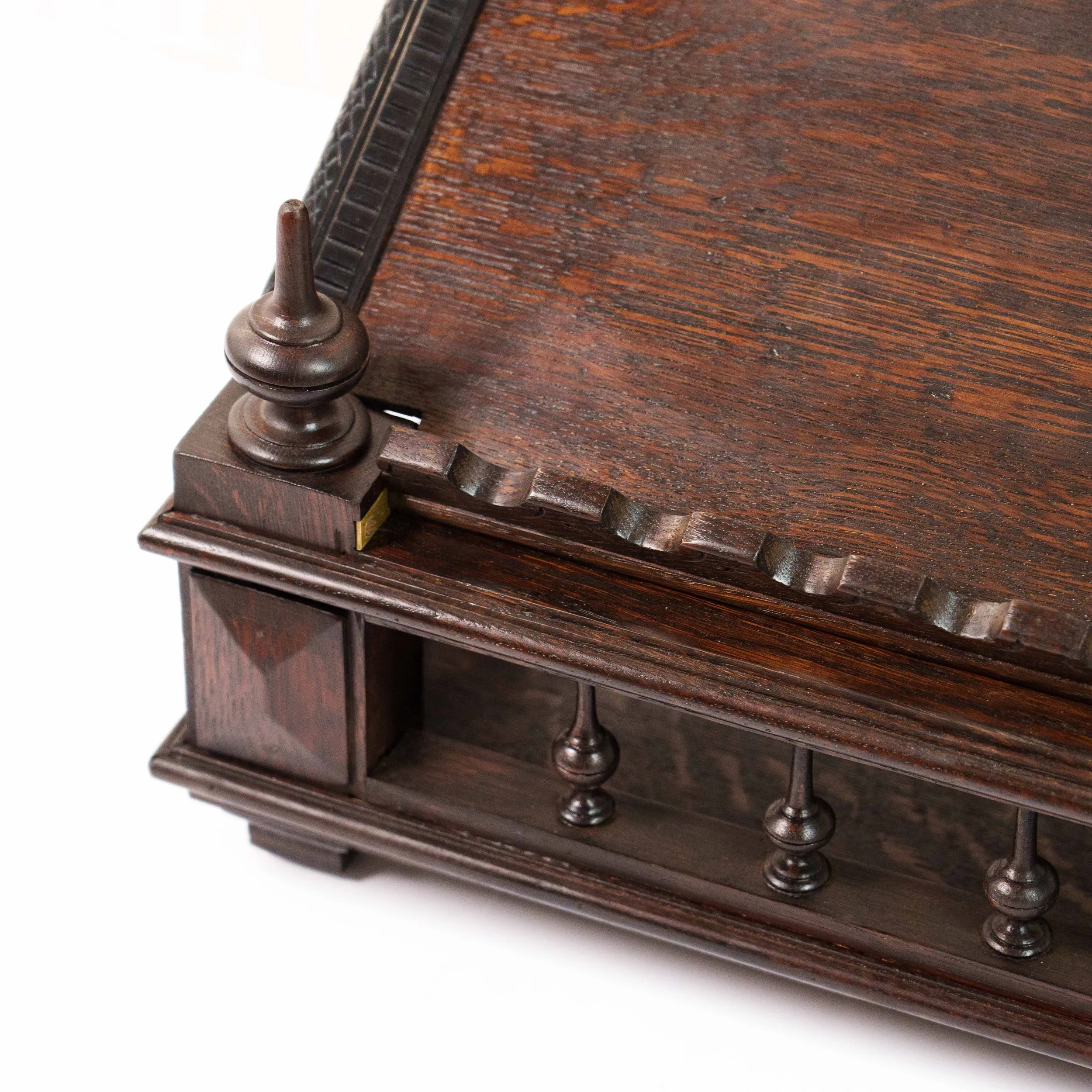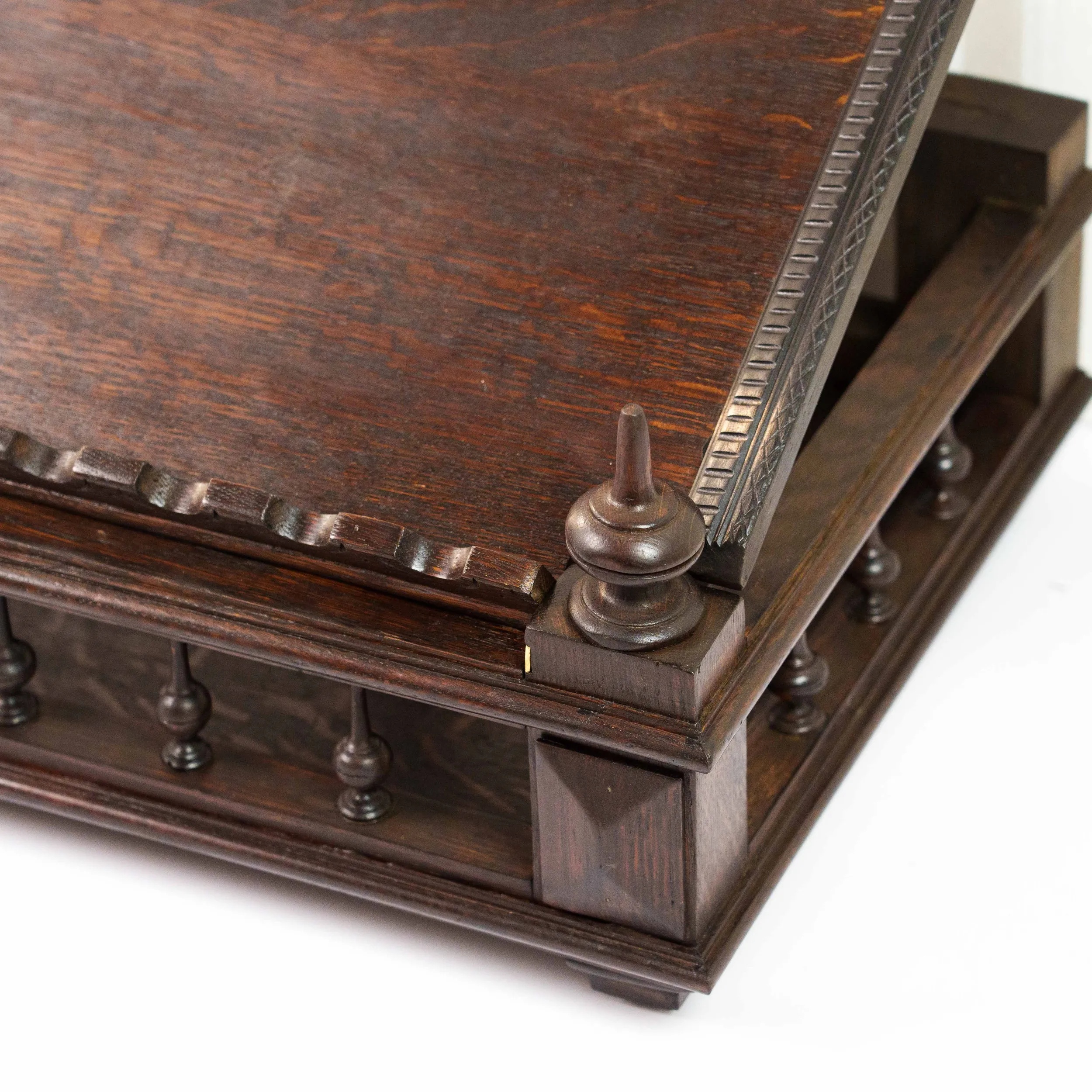 Перед вами изящная антикварная подставка для книги, исполненная с тонким чувством меры и благородной простоты. Её корпус выполнен из тёмного дерева с насыщенной, глубокой текстурой, в которой угадываются естественные волны древесного рисунка, словно застывшее движение времени. Откидная спинка украшена аккуратной резьбой по верхнему краю, придающей предмету лёгкую декоративность без излишней вычурности. Небольшие точёные навершия по бокам добавляют композиции завершённости и подчёркивают симметрию формы. Нижняя часть оснащена рядом изящных упоров — они не только функциональны, удерживая книгу в раскрытом положении, но и создают ритмичный декоративный акцент. Основание подставки выглядит устойчивым и основательным: массивная платформа с мягко профилированными гранями и миниатюрными ножками придаёт предмету солидность и ощущение надёжности. Механические элементы — металлические фиксаторы — аккуратно встроены в конструкцию и свидетельствуют о продуманности и практичности изделия. Эта подставка словно создана для неспешного чтения в тишине кабинета: она несёт в себе атмосферу уюта, интеллигентности и уважения к книге как к ценности.