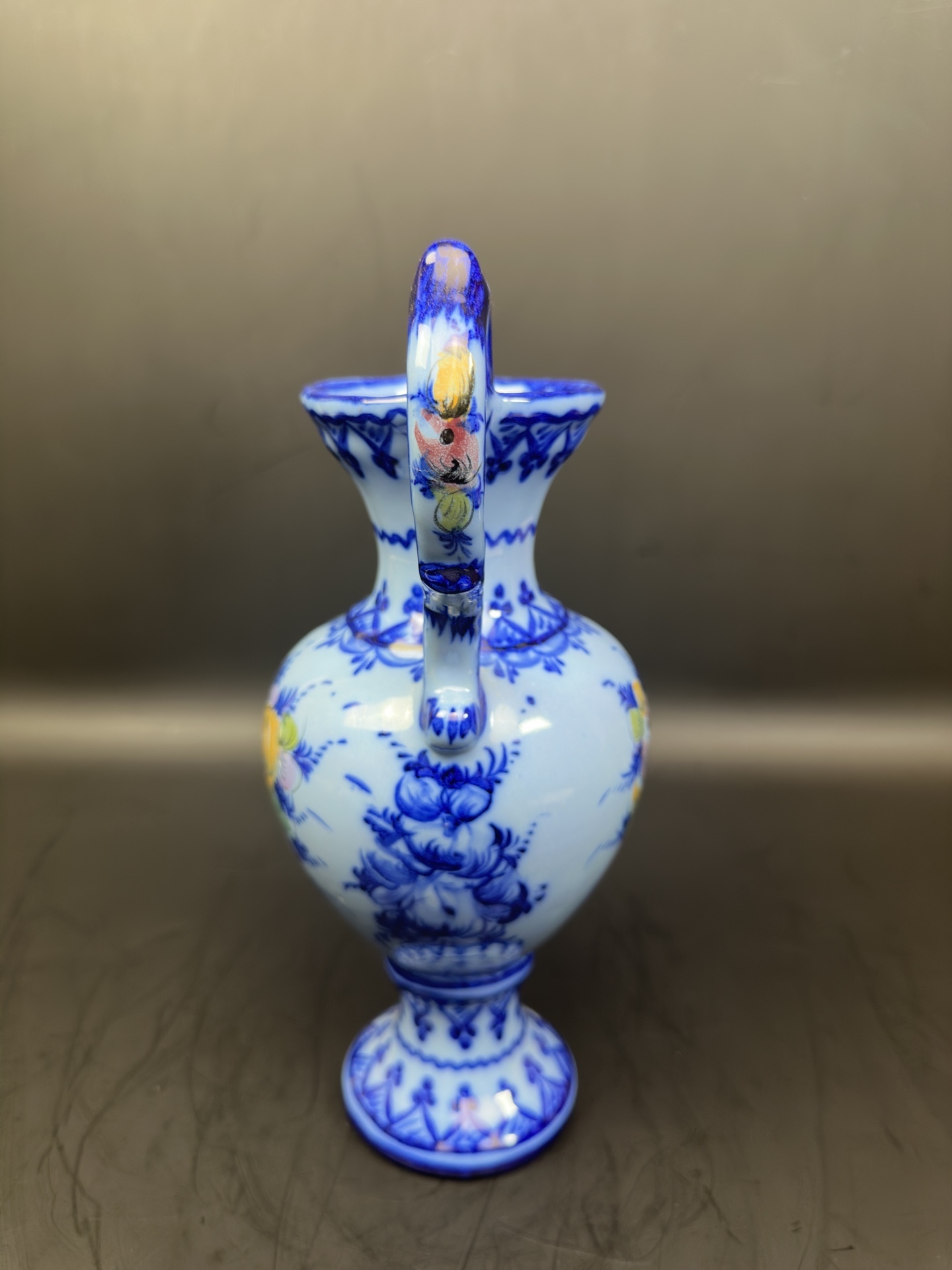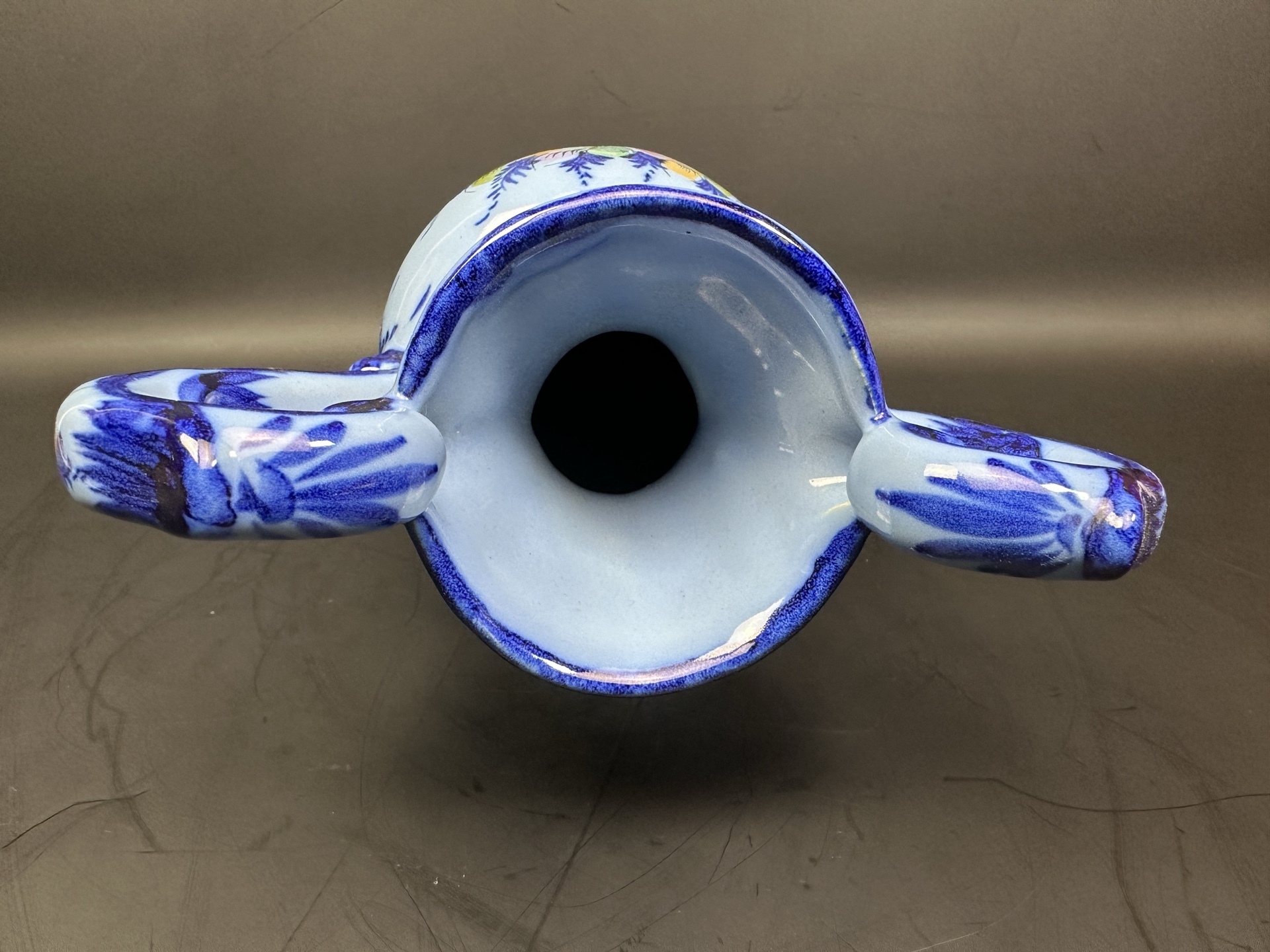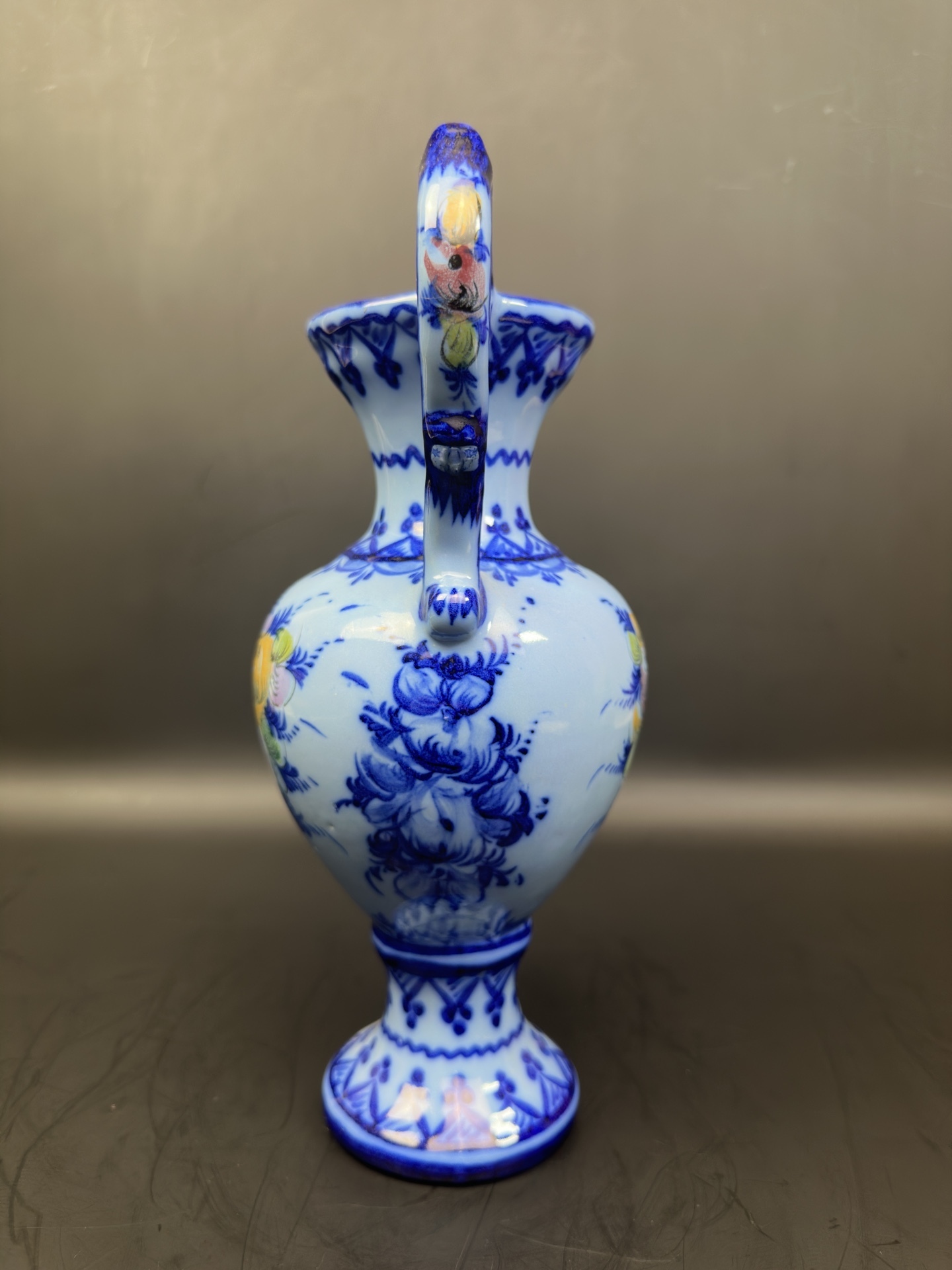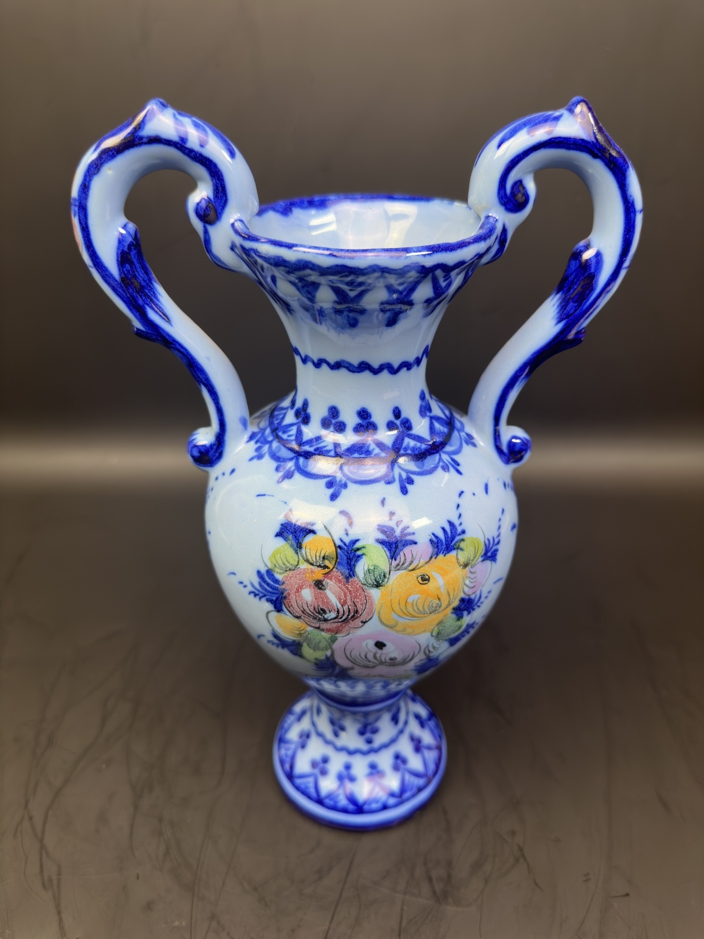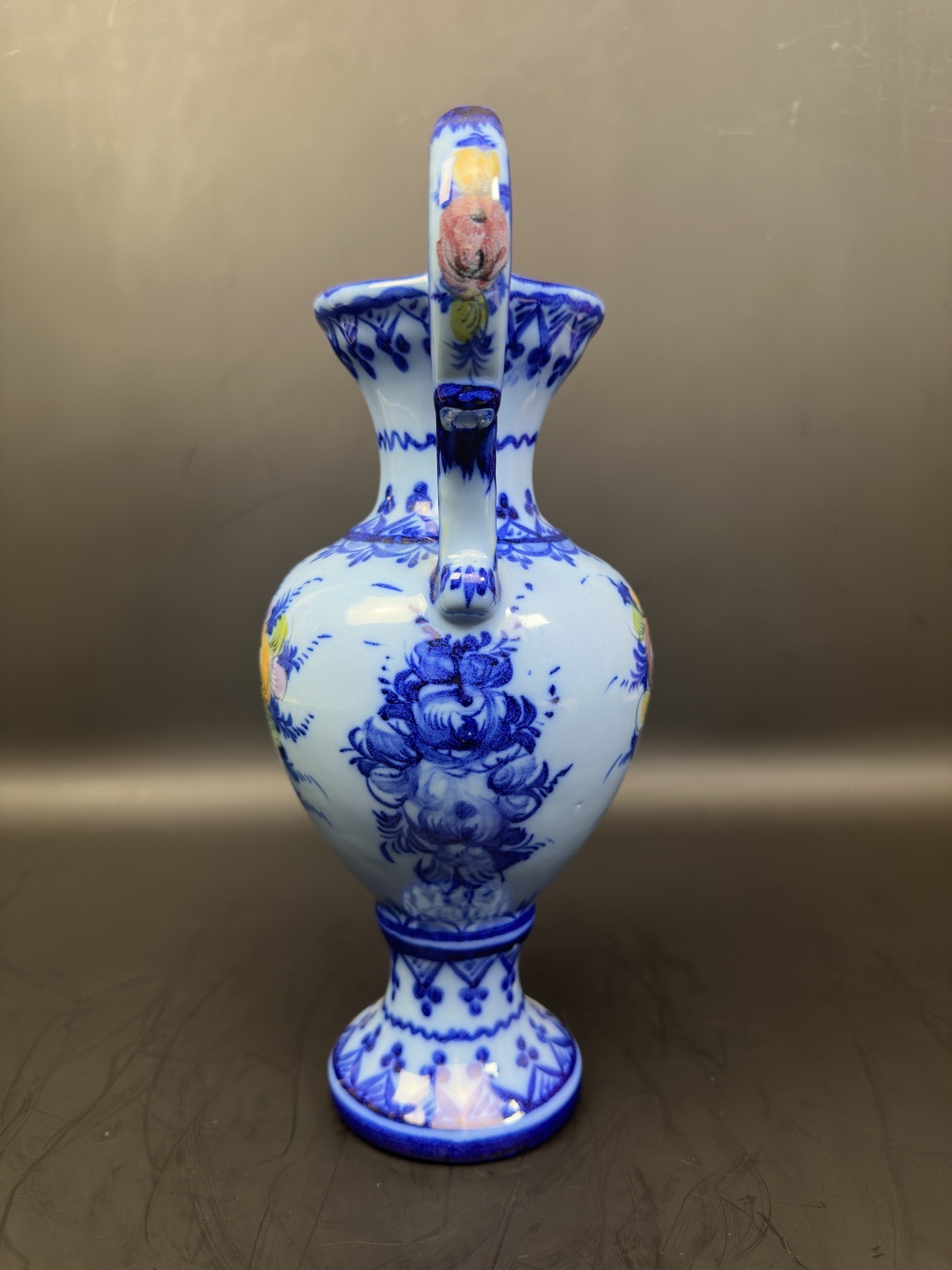 Ваза с ручками, является изделием из фаянса португальской мануфактуры Alcobaça, известной своими декоративными элементами и ручной росписью.
