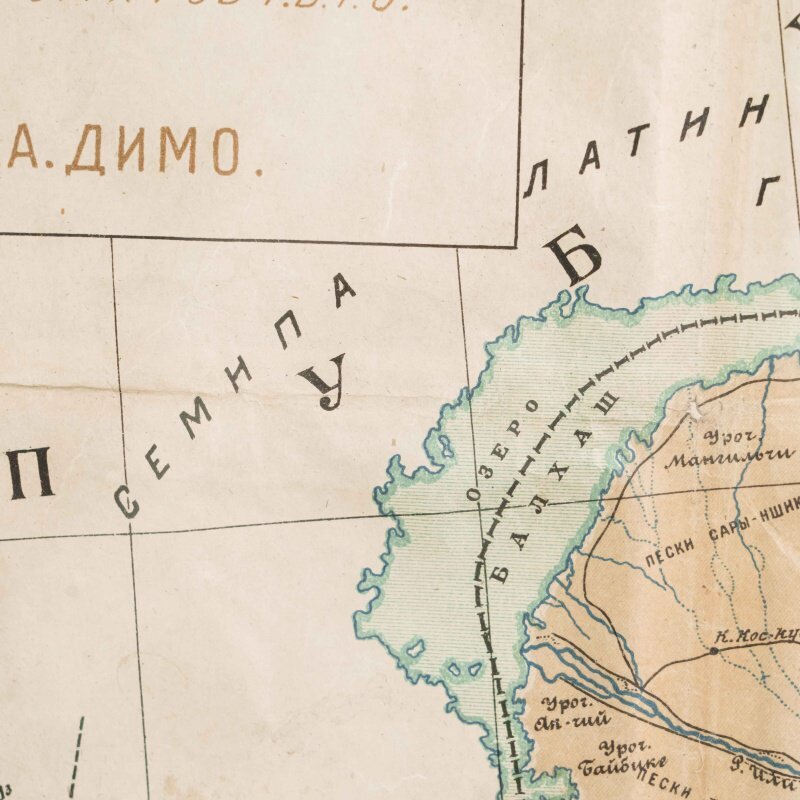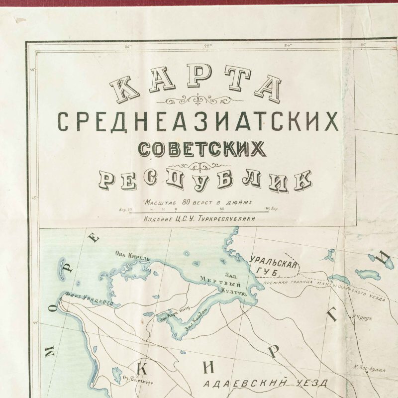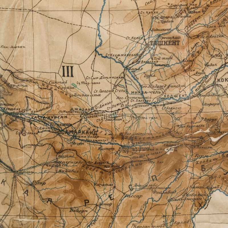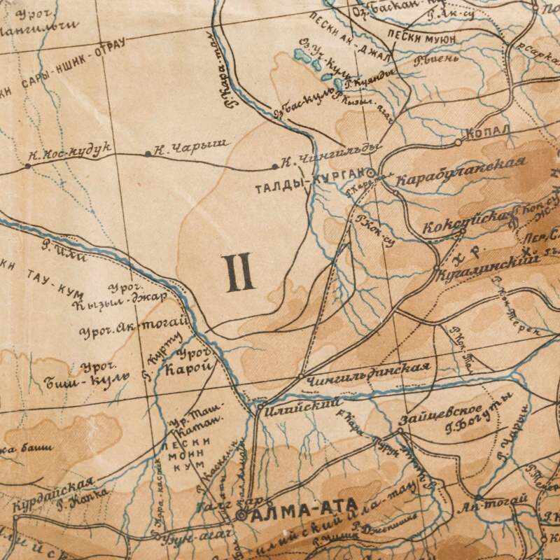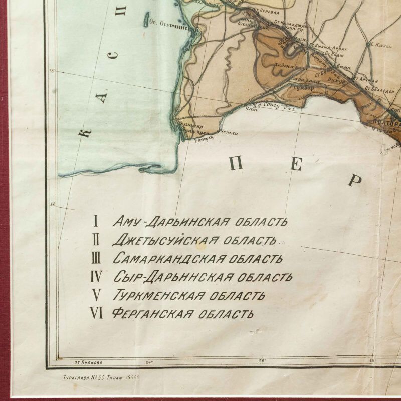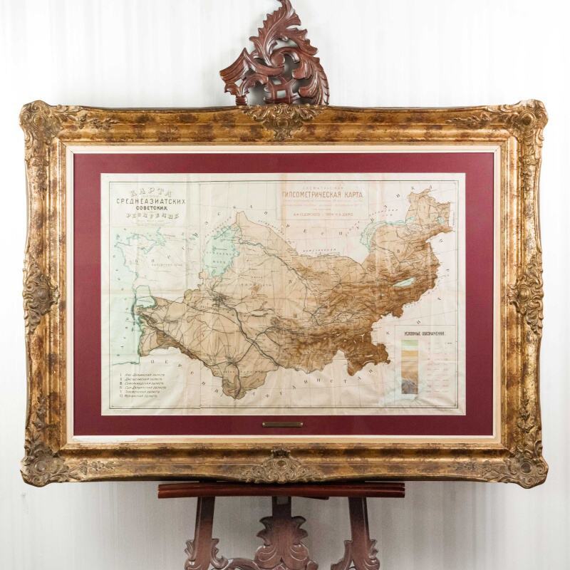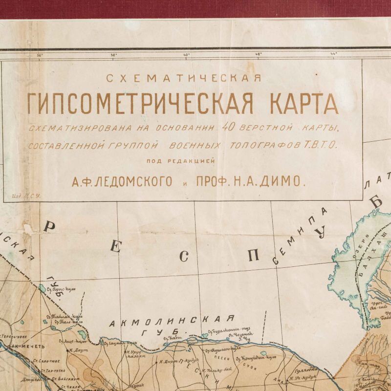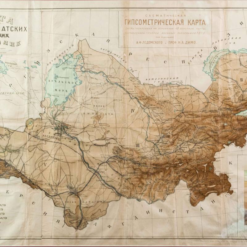 Гипсометри-ческая и физико-географическая карта Среднеазиатских республик, составленная под редакцией подпоручика Александра Фёдоровича Ледомского (Тарасова) и профессора Николая Александровича Димо. Карта основана на топографических съемках Военно-топографического отдела Т.В.Т.О., представляя собой уникальное сочетание научной точности и наглядной географической выразительности. Карта охватывает обширную территорию Средней Азии, включая границы бывших Туркестанских областей, части Казахской степи, а также современные республики: Казахстан, Узбекистан, Туркменистан, Таджикистан и Киргизия. Карта выполнена с применением гипсометрической шкалы окраски, позволяющей определить высотный рельеф местности: от пониженных пустынных равнин (Кызылкум, Каракум) до горных хребтов Тянь-Шаня и Памира. Отмечены важнейшие реки (Аму-Дарья, Сыр-Дарья, Зеравшан, Или, Кара-тал, Чу), орошаемые земли, солончаки, песчаные массивы и озёра. Детально отмечены ключевые административные области: Амударьинская (I), Джетысуйская (II), Самаркандская (III), Сырдарьинская (IV), Туркменская (V) и Ферганская (VI). Особое внимание уделено политико-административному делению, обозначены границы республик, автономных областей и уездов на момент составления карты. Также карта включает разветвлённую транспортную сеть того времени — железные и гужевые дороги, караванные пути, важнейшие форты и военные гарнизоны. Названия населённых пунктов даны с учетом исторической и административной принадлежности, включая дореволюционные и советские топонимы. Рельеф представлен в виде цветовой шкалы высот (в метрах), со штриховыми изолиниями или градиентом оттенков. Использованы государственные десятиверстные карты Генерального штаба, геологические и топографические данные.