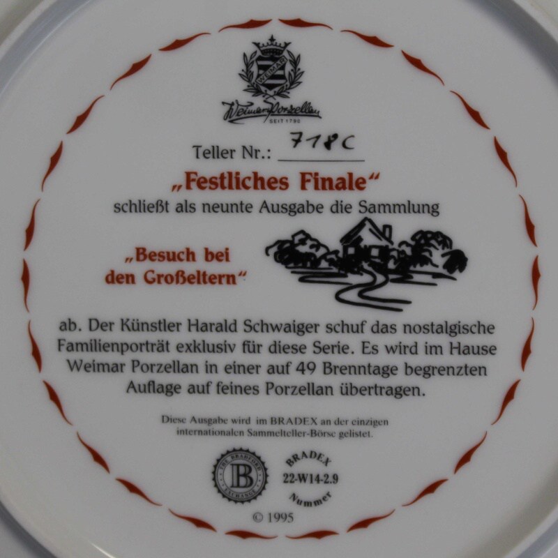 Германия, II половина XX века. Мануфактура "Веймар". Художник - Гаральд Швайгер. Тарелки имеют уникальный номер и занесены во всемирный каталог Брадекс. Выпускалась ограниченным тиражом в течении 49 дней.