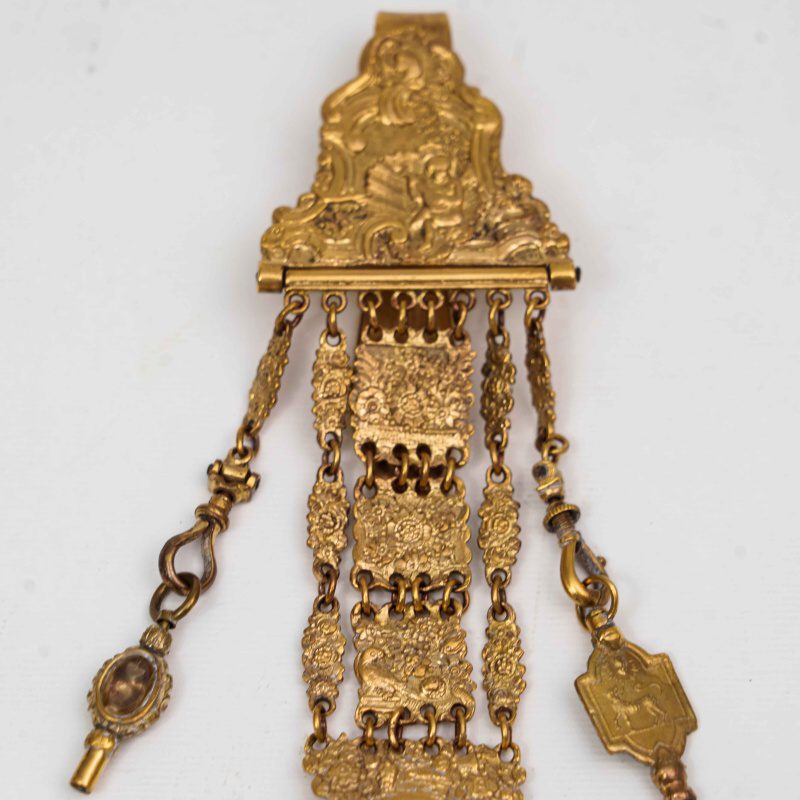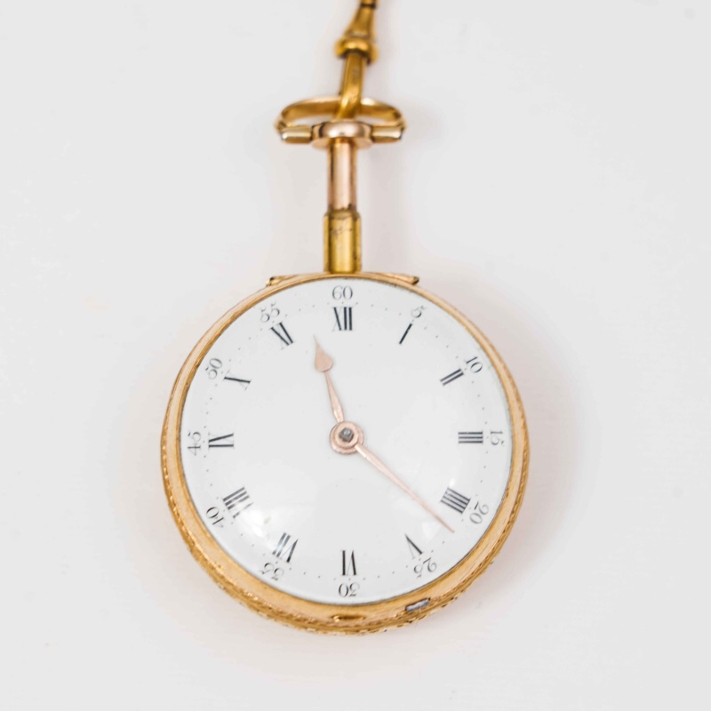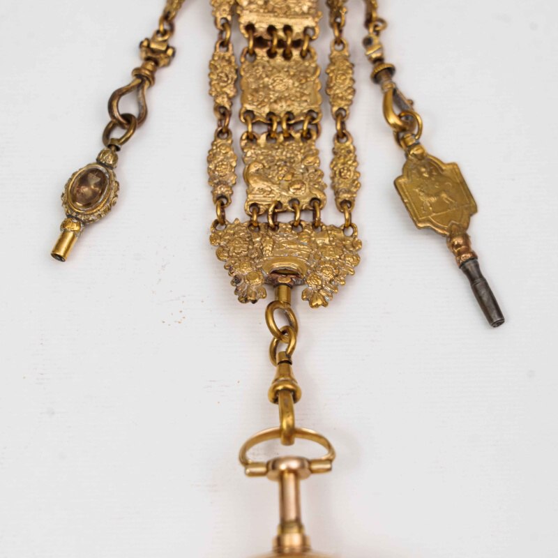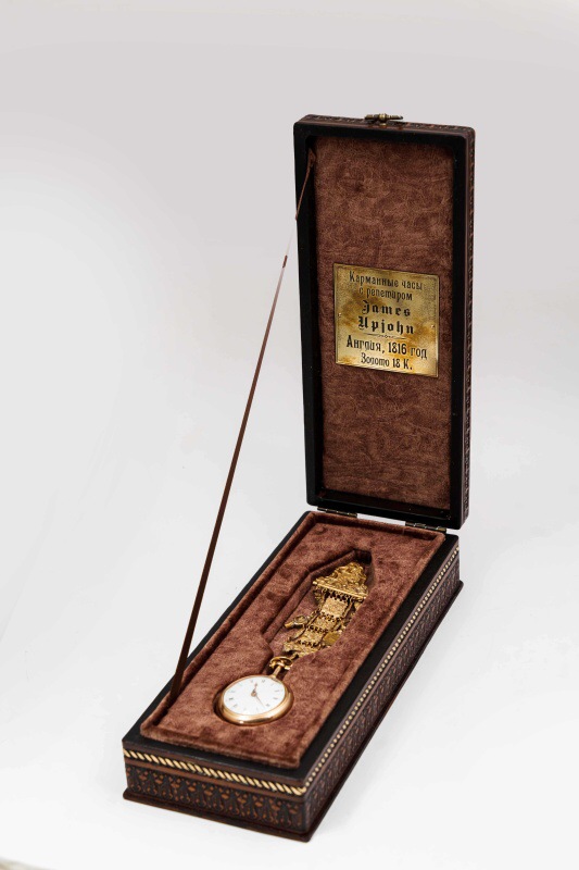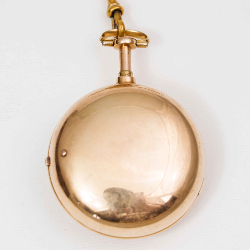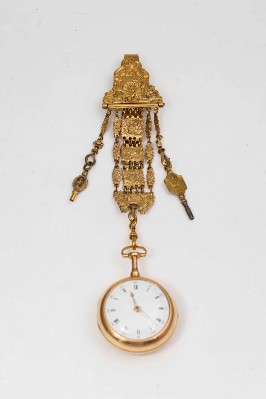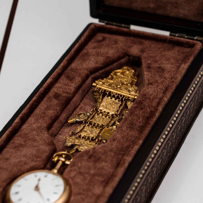 Материал: Часы с функцией четвертного репетира (Quarter Repeater) на шатлене. Массивный корпус из золота 18 карат (750 проба) -1816 года. Эксклюзивный футляр: Часы и шатлен в коробе с бархатным ложементом.