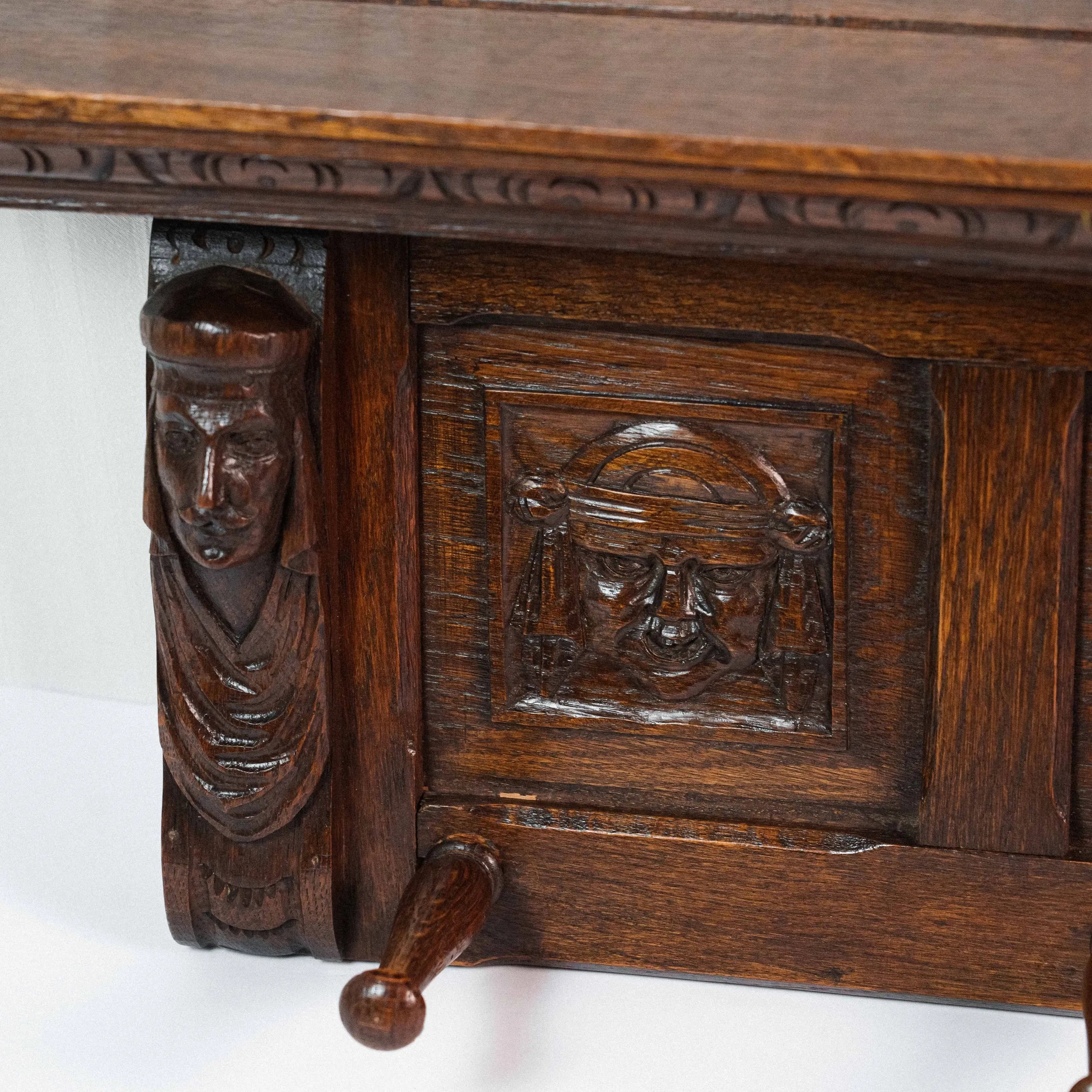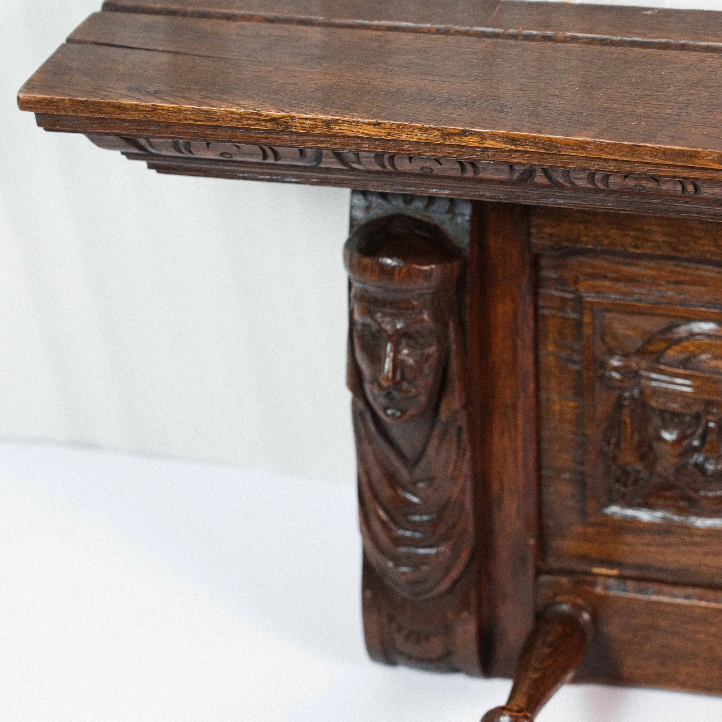 Особое внимание привлекают резные лица по бокам, которые добавляют изделию характер и ощущение антикварного предмета с историей. Центральная часть оформлена орнаментальной композицией, подчеркивающей мастерство исполнения и утончённый вкус.